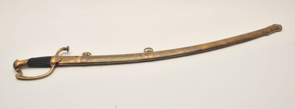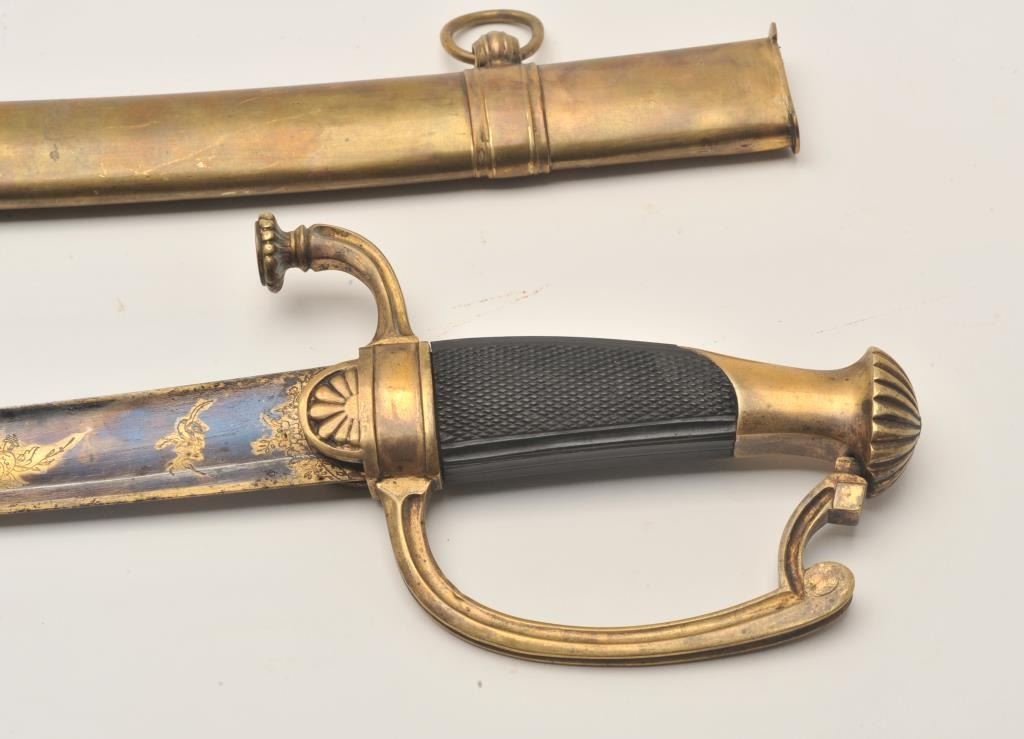 18AR-12 FRENCH SWORDFrench 1st Empire sword with brass scabbard, approximately 35” overall with a 30” blade displaying blued and gold gild on top 10” of blade, brass guard and pommel, checkered black grip; sword is in overall very good tonear fine condition; scabbard is very good +. Est.: $3,000-$6,000.French 1st Empire sword with brass scabbard, approximately 35” overall with a 30” blade displaying blued and gold gild on top 10” of blade, brass guard and pommel, checkered black grip; sword is in overall very good tonear fine condition; scabbard is very good +. Est.: $3,000-$6,000.