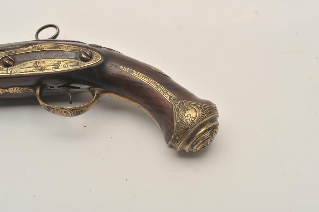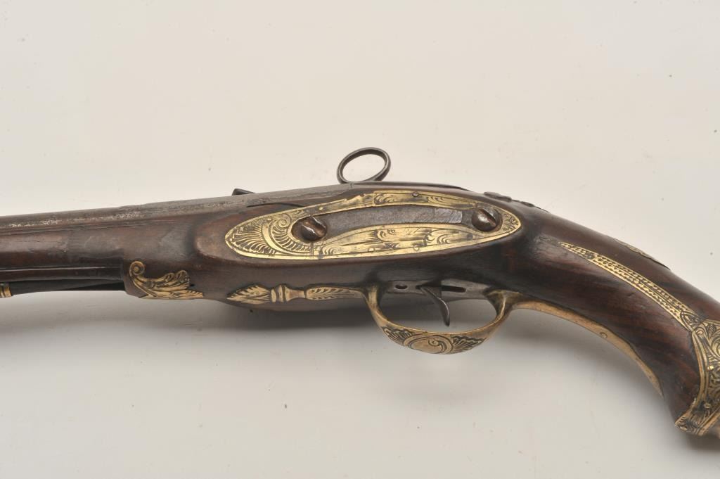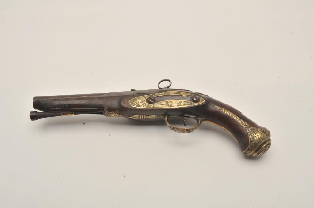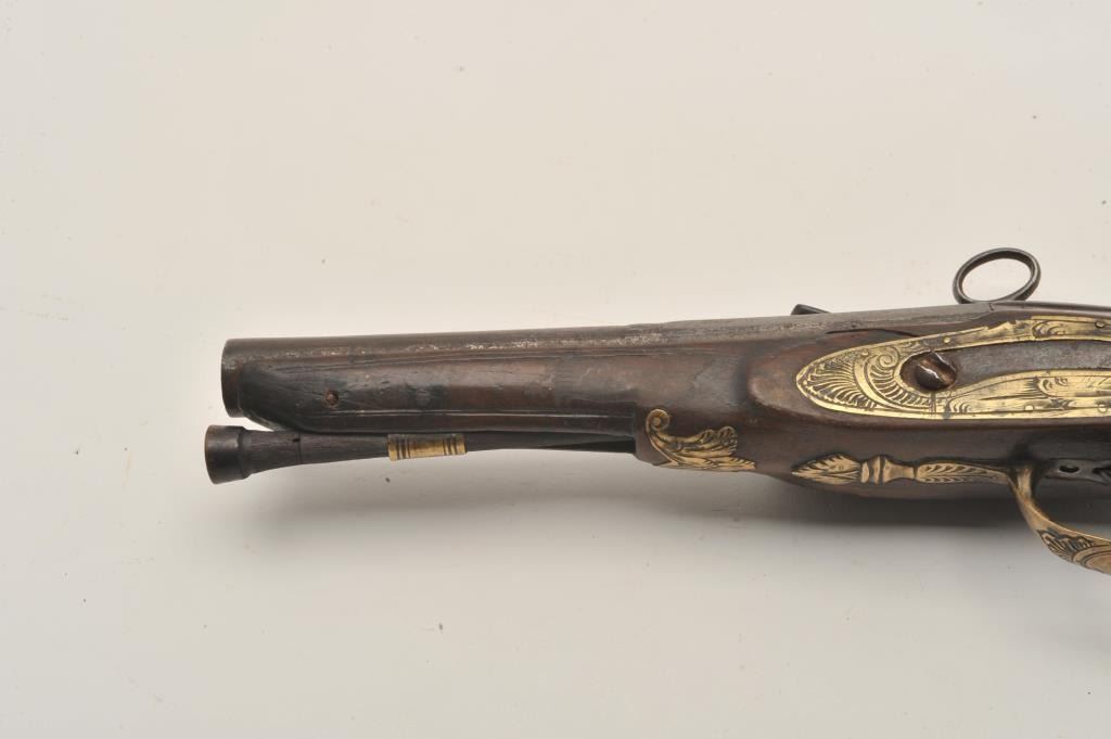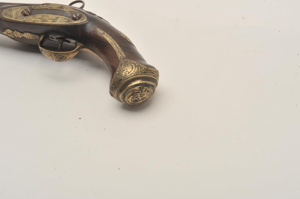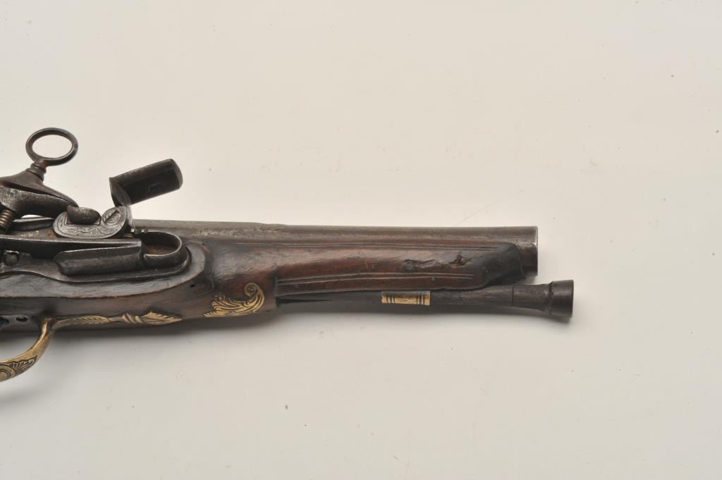 18AR-27 MIQUELETSpanish style miquelet flintlock pistol circa about 1780 with brass mounts and maker marked barrel. Measures 13 ¼” overall with a 7 ½” barrel of .62 caliber smoothbore. Scroll engraved mounts with “Pig face” in butt.Maker’s stamp in the barrel shows last 2 letters ___ME with what may be a helmet over letters. Good to very good condition with dark patina and good stock. Original flintlock with correct small parts. The typecarried to Spanish colonial areas including American Southwest and California in mission era. (Antique) Est.: $1250-$2500Spanish style miquelet flintlock pistol circa about 1780 with brass mounts and maker marked barrel. Measures 13 ¼” overall with a 7 ½” barrel of .62 caliber smoothbore. Scroll engraved mounts with “Pig face” in butt.Maker’s stamp in the barrel shows last 2 letters ___ME with what may be a helmet over letters. Good to very good condition with dark patina and good stock. Original flintlock with correct small parts. The typecarried to Spanish colonial areas including American Southwest and California in mission era. (Antique) Est.: $1250-$2500