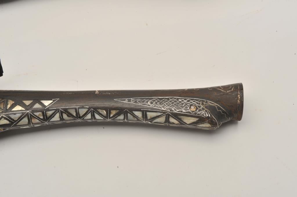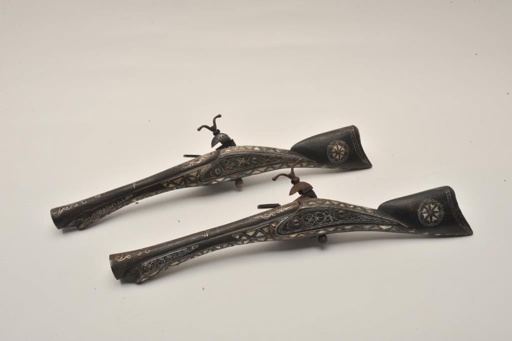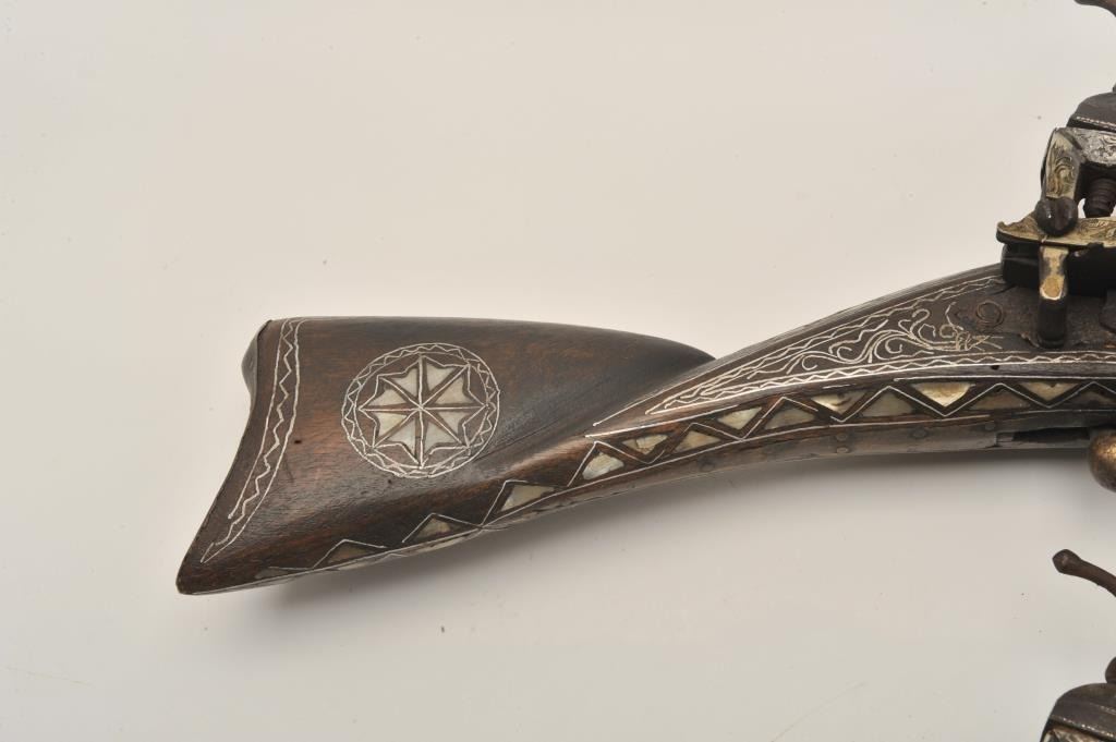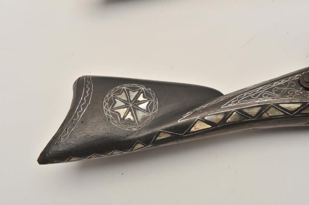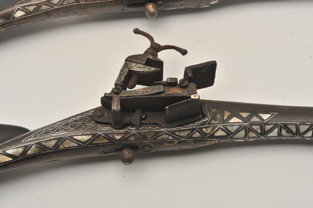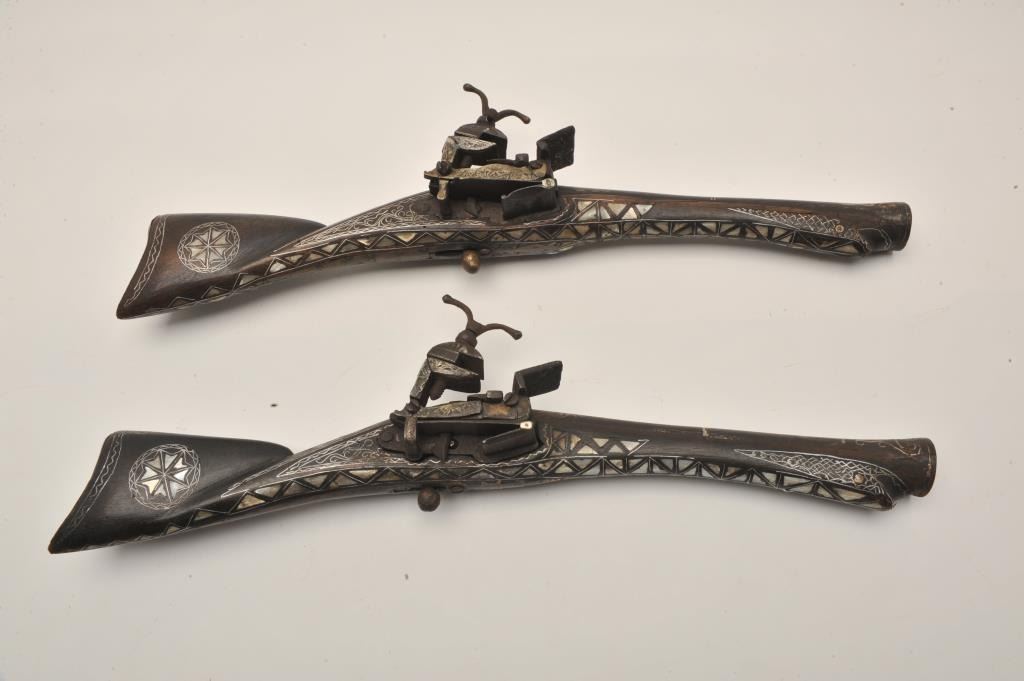 18AR-28 PAIR MIQUELETPair of North African miquelete flintlock “Dag” style blunderbuss with ornate pearl and silver inlays from 20th century. Measures 18” overall with 9 ½” bell mouth barrels. These were made as male jewelry for paradeand ceremony rather than use. Dark patina. Locks are well made and function and probably a good deal older than barrels and stocks. (Antique) Est.: $900-$1800Pair of North African miquelete flintlock “Dag” style blunderbuss with ornate pearl and silver inlays from 20th century. Measures 18” overall with 9 ½” bell mouth barrels. These were made as male jewelry for paradeand ceremony rather than use. Dark patina. Locks are well made and function and probably a good deal older than barrels and stocks. (Antique) Est.: $900-$1800