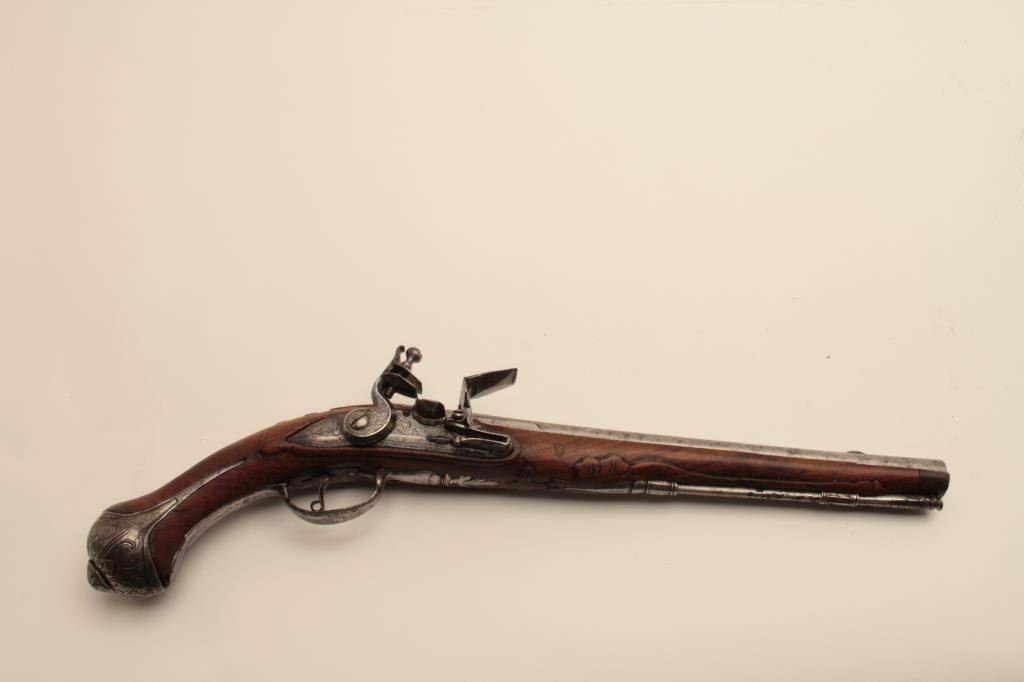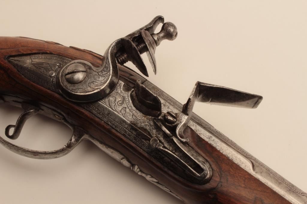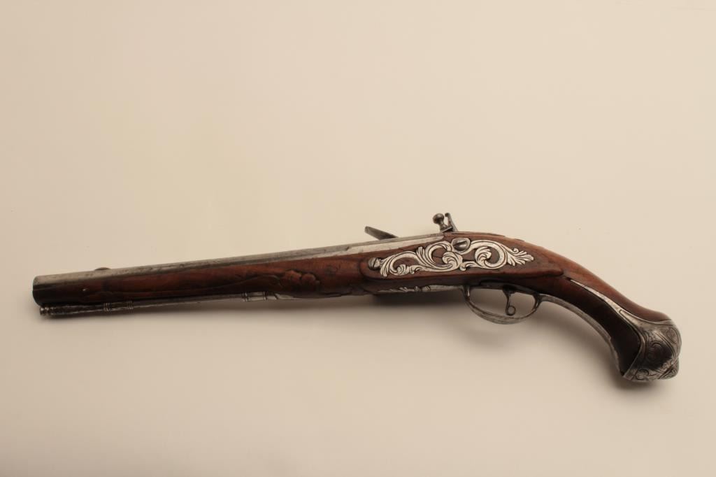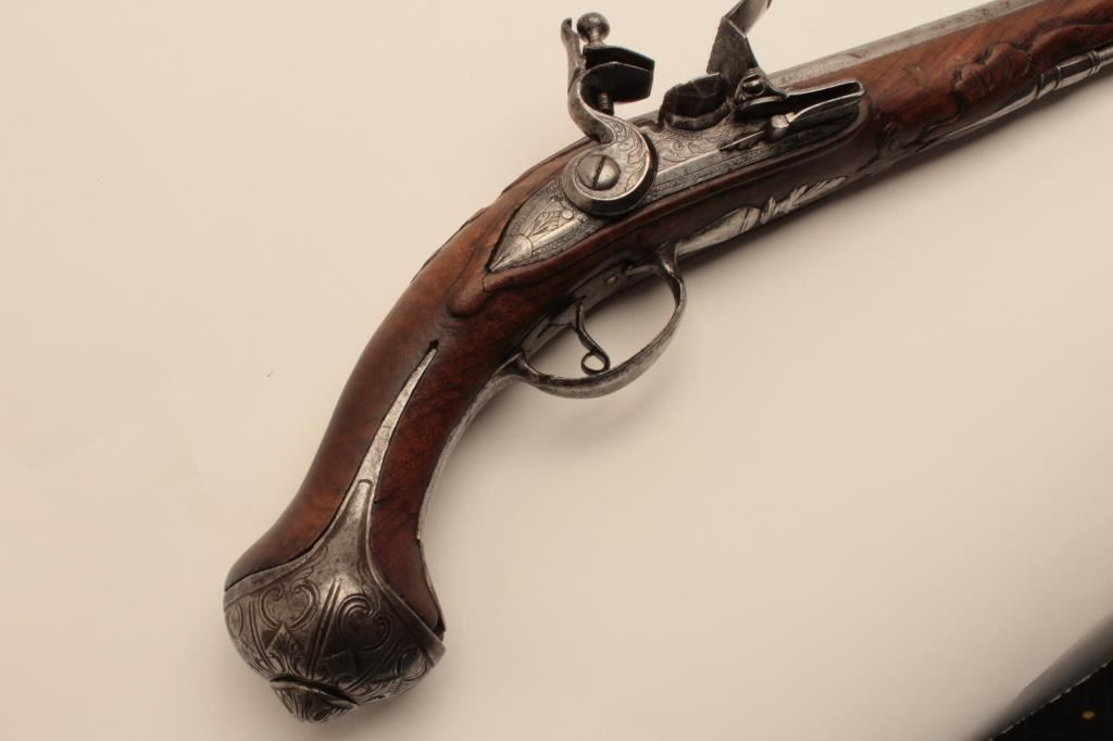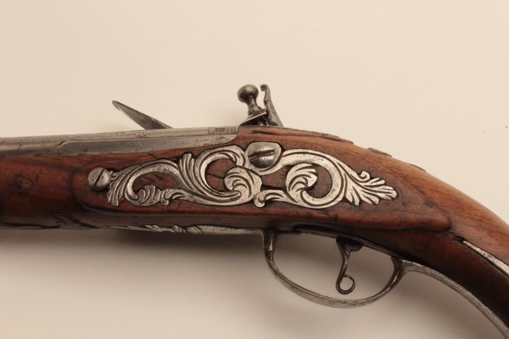 18AR-45 FLINTLOCK HORSEMANS PISTOLEarly flintlock horseman’s size holster pistol with fancy iron mounts, “Banana” shaped lock and maker marked barrel. The barrel shows 3 pointed crown with “H.G.” in 3 small marks also standing lion facing leftat the center with crown on head. Measures 20” overall with a 13” barrel of .60 caliber smoothbore. The side plate is pierced iron with scroll decoration and the butt and cap is nicely chiseled steel. Simple plain steelguard and ramrod ferruls with rear ferrule showing early long point extending in the stock. The stock shows raised carving and molding around the metal. Very good plus condition with light cleaning. Original flint with all correct parts. The barrel shows fancy engraving and another small proof almost hidden at the left rear of breech with “OV”. Circa 1700-1730. Early forged iron ramrod included. (Antique) Est.: $1400-$2800Early flintlock horseman’s size holster pistol with fancy iron mounts, “Banana” shaped lock and maker marked barrel. The barrel shows 3 pointed crown with “H.G.” in 3 small marks also standing lion facing leftat the center with crown on head. Measures 20” overall with a 13” barrel of .60 caliber smoothbore. The side plate is pierced iron with scroll decoration and the butt and cap is nicely chiseled steel. Simple plain steelguard and ramrod ferruls with rear ferrule showing early long point extending in the stock. The stock shows raised carving and molding around the metal. Very good plus condition with light cleaning. Original flint with all correct parts. The barrel shows fancy engraving and another small proof almost hidden at the left rear of breech with “OV”. Circa 1700-1730. Early forged iron ramrod included. (Antique) Est.: $1400-$2800