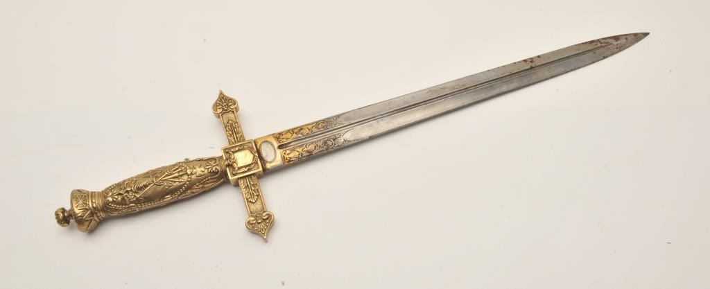 18AR-5 FRENCH 19TH CENTURY SWORDFrench 19th Century short sword (no scabbard); approximately 22” overall with a 16” blade showing gilded decoration at hilt; very ornate cast brass guard/grip/pommel; overall good + condition with some scatteredspots of surface rust from storage on blade. Est.: $350-$700.French 19th Century short sword (no scabbard); approximately 22” overall with a 16” blade showing gilded decoration at hilt; very ornate cast brass guard/grip/pommel; overall good + condition with some scatteredspots of surface rust from storage on blade. Est.: $350-$700.