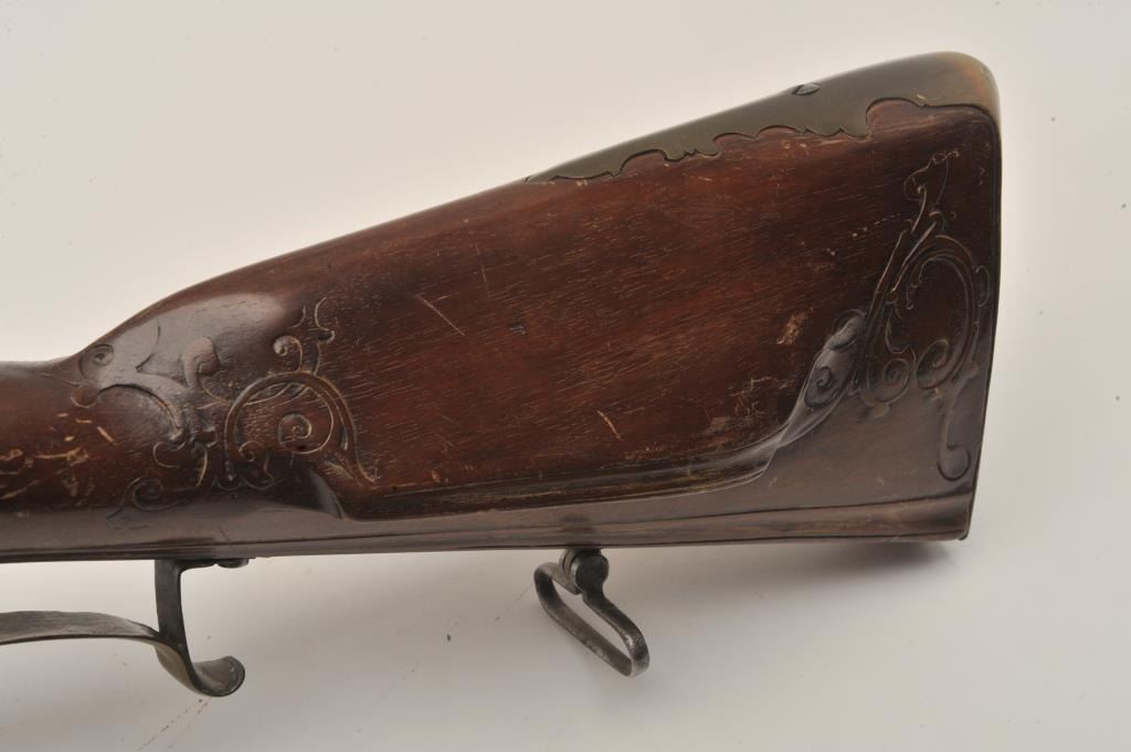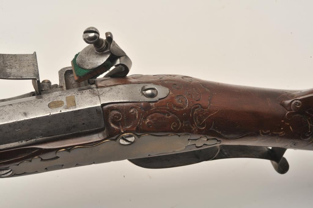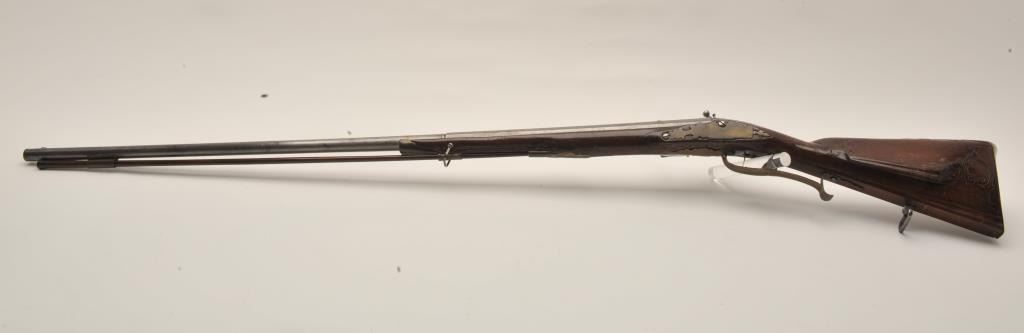 18AR-57 AUSTRIAN FOWLERAustrian flintlock fowler, 16 gauge, 40.5” barrel, carved wood half stock, brass mounts, lockplate marked “Felix Meier in Wien”; barrel at breech is gold hallmarked; gun is in overall good to very good condition with a light grey patina to barrel and lock/hammer; crisp action and markings, good to very good wood; ramrod retained. (Antique). Est.: $1,250-$2,500.Austrian flintlock fowler, 16 gauge, 40.5” barrel, carved wood half stock, brass mounts, lockplate marked “Felix Meier in Wien”; barrel at breech is gold hallmarked; gun is in overall good to very good condition with a light grey patina to barrel and lock/hammer; crisp action and markings, good to very good wood; ramrod retained. (Antique). Est.: $1,250-$2,500.