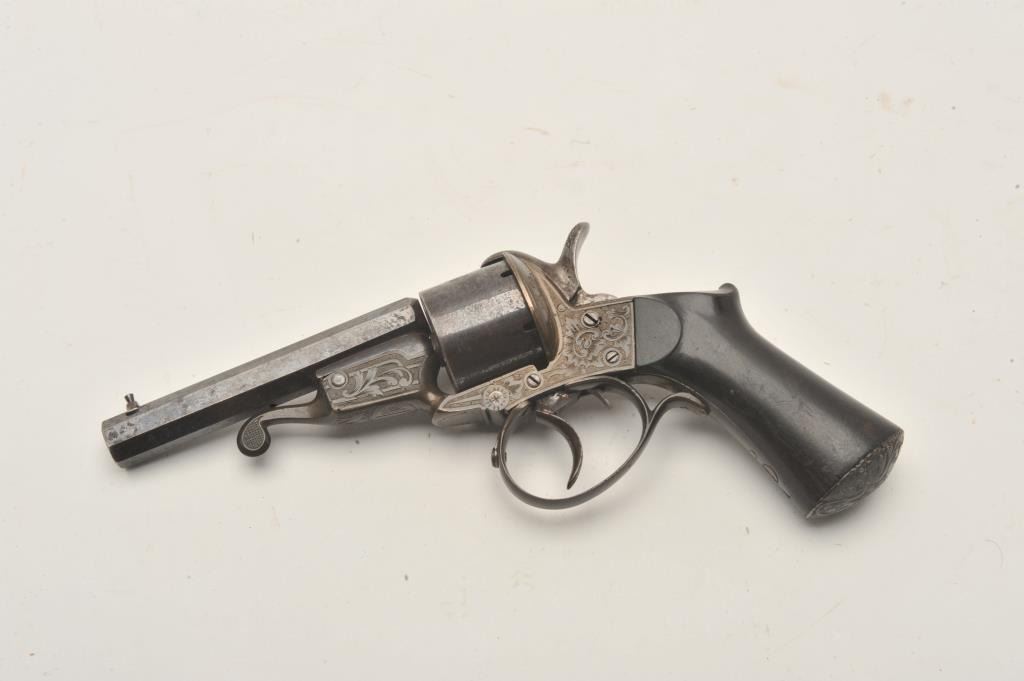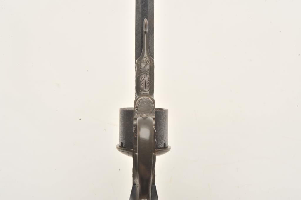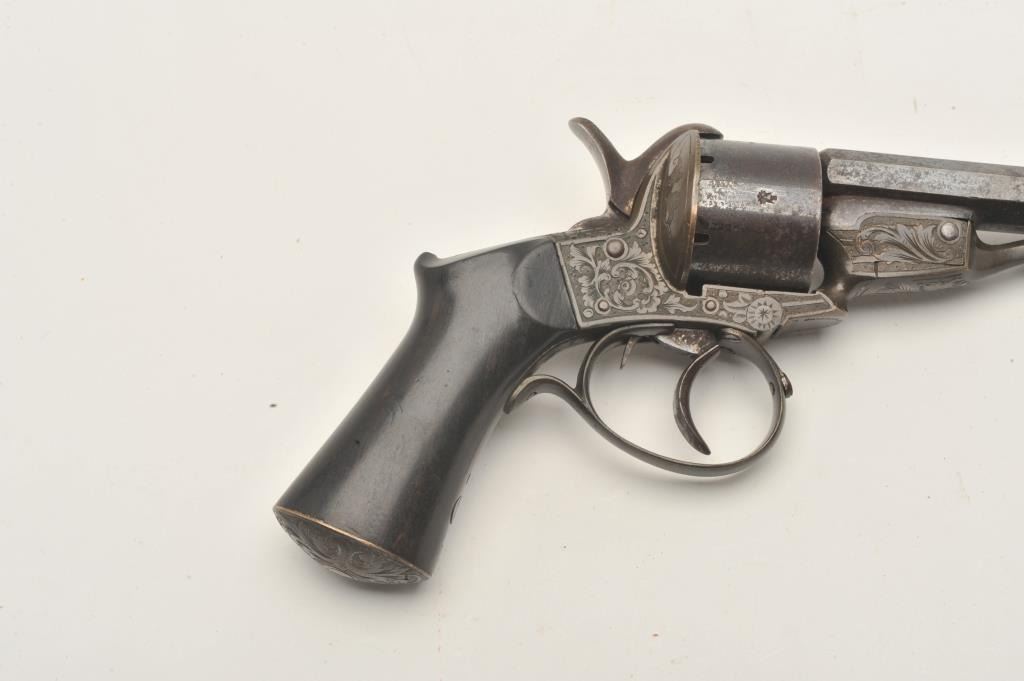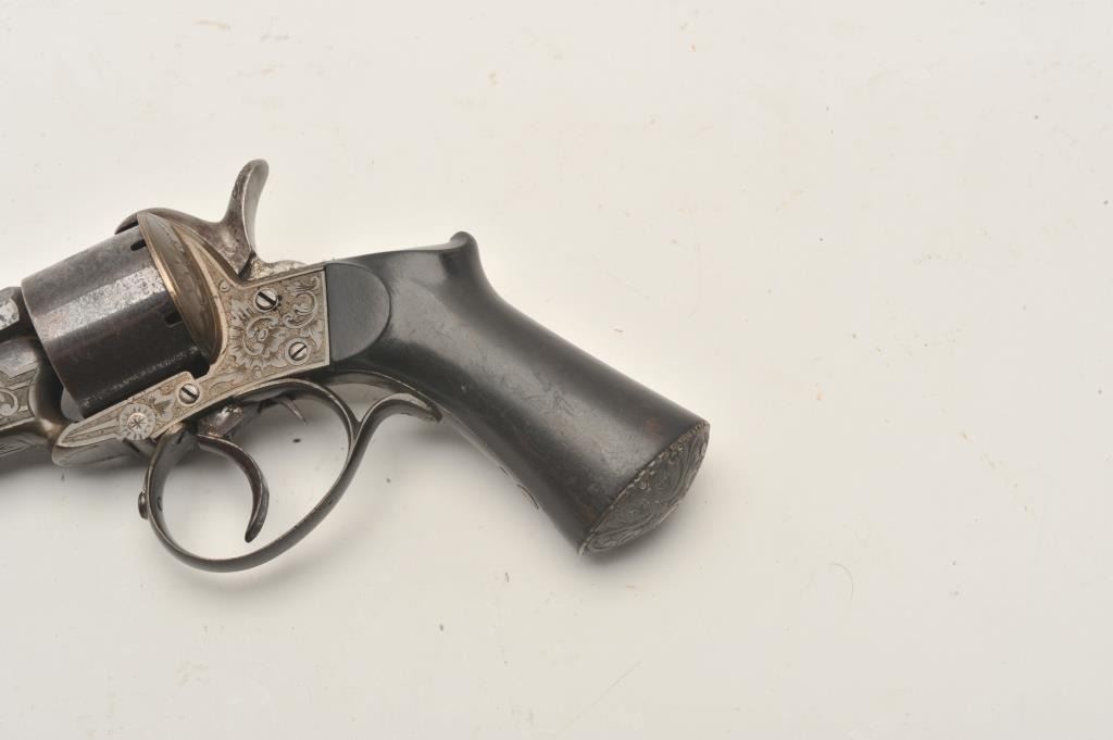18AR-66 BRASS FRAME PINFIREUnique brass frame pinfire revolver, possibly one-of-a-kind, finely engraved brass frame with dark patina, blued 4” octagon iron barrel and cylinder, .38 caliber, wood grips, in overall very good to near fine conditionshowing majority of original blued finish on barrel and cylinder, crisp action, very good grips. (Antique). Est.: $900-$1,800.Unique brass frame pinfire revolver, possibly one-of-a-kind, finely engraved brass frame with dark patina, blued 4” octagon iron barrel and cylinder, .38 caliber, wood grips, in overall very good to near fine conditionshowing majority of original blued finish on barrel and cylinder, crisp action, very good grips. (Antique). Est.: $900-$1,800.