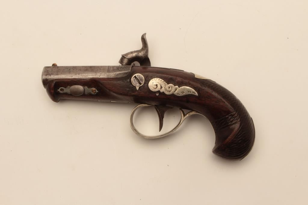 18AR-73 DERRINGERPhiladelphia style derringer marked “Deringe” at the breach and measures 6” overall with a 2 ¼” barrel of .41 caliber with 6 groove rifling. German silver mounts closely resembling Henry Deringer with small pointedprojection below the lock screw escutcheon similar to Slotter. The lock and hammer are lightly engraved. Good condition overall and note barrel key escutcheons are not engraved and may have been replaced long ago.(Antique) Est.: $600-$1200Philadelphia style derringer marked “Deringe” at the breach and measures 6” overall with a 2 ¼” barrel of .41 caliber with 6 groove rifling. German silver mounts closely resembling Henry Deringer with small pointedprojection below the lock screw escutcheon similar to Slotter. The lock and hammer are lightly engraved. Good condition overall and note barrel key escutcheons are not engraved and may have been replaced long ago.(Antique) Est.: $600-$1200