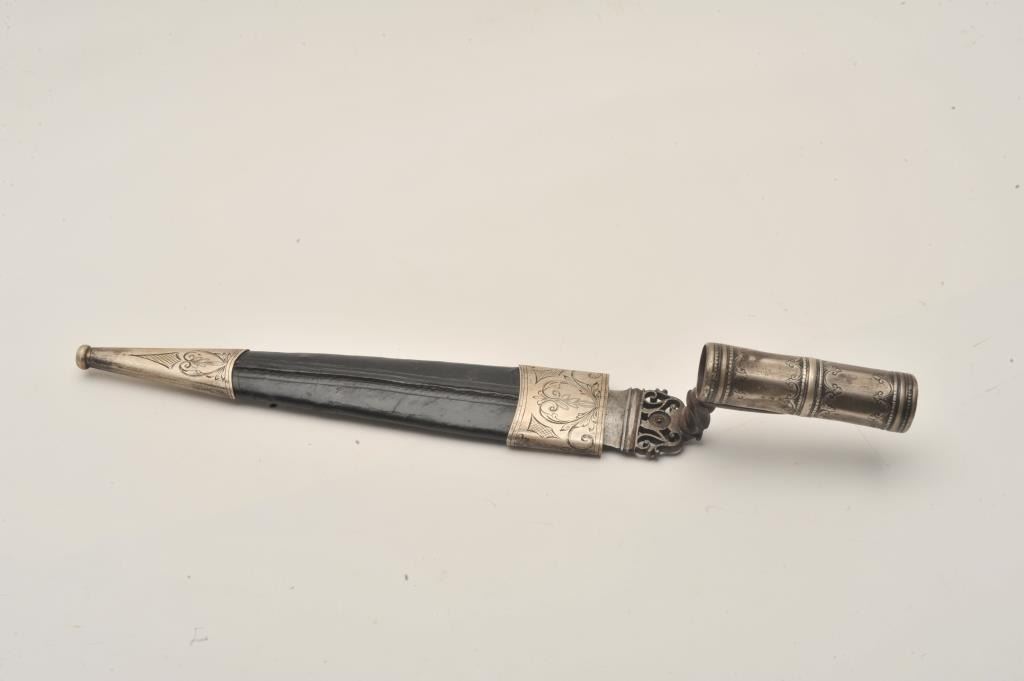 18AR-75 PIERCED STEEL ITALIANPierced steel Italian socket bayonet with leather sheath that is mounted with engraved metal tip and throat; approximately 12.5” overall with an 8” blade, overall very good condition with engraving on the socket; verygood sheath. Est.: $600-$1,200.Pierced steel Italian socket bayonet with leather sheath that is mounted with engraved metal tip and throat; approximately 12.5” overall with an 8” blade, overall very good condition with engraving on the socket; verygood sheath. Est.: $600-$1,200.