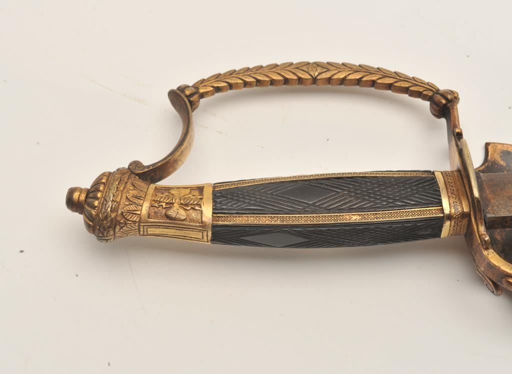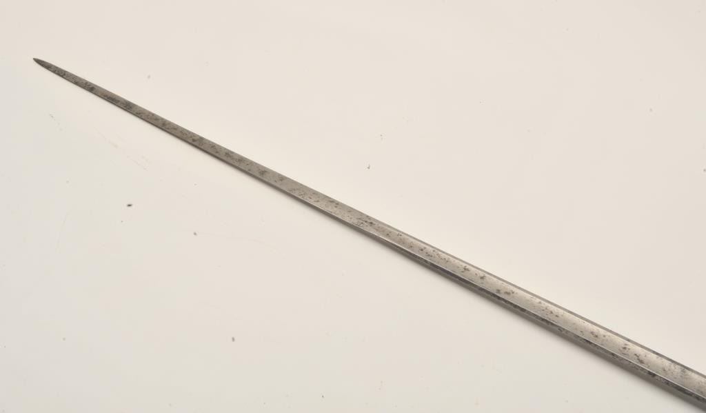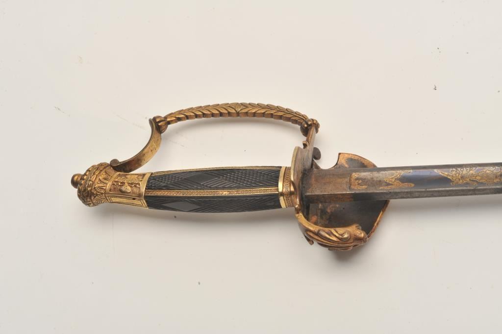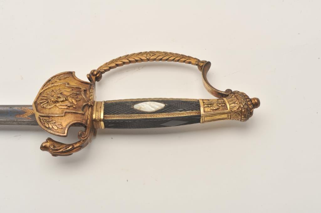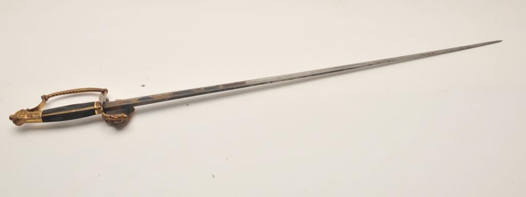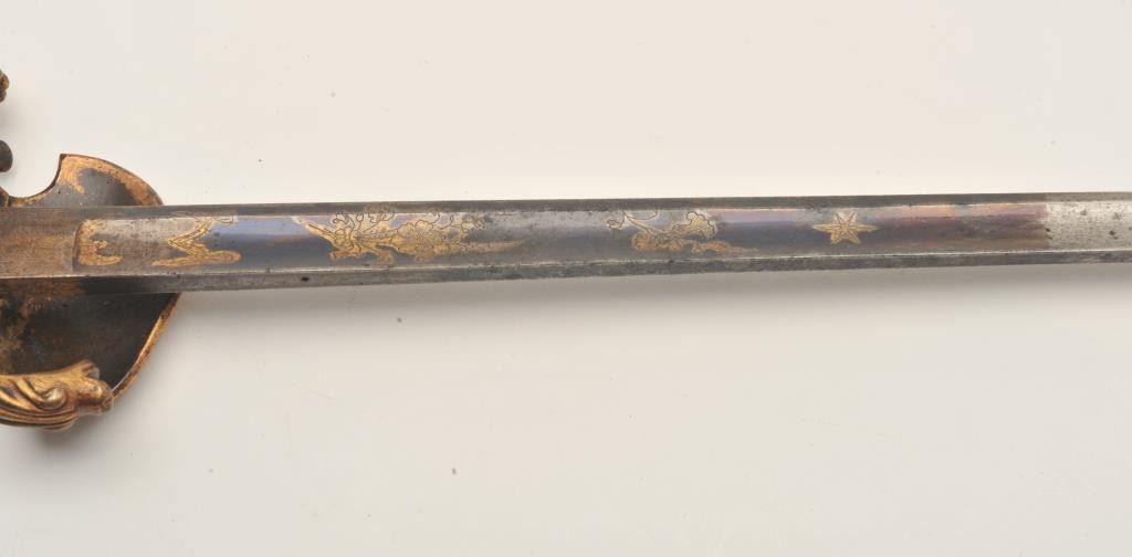 18AR-79 COURT SWORDFancy Court sword (no scabbard) with blued and gilt decoration to top 8” of blade, decorated brass guard, pommel and checkered wood grip with pearl inlay on right side; approximately 37” overall with a 31” blade;overall good to very good condition. Est.: $450-$900.Fancy Court sword (no scabbard) with blued and gilt decoration to top 8” of blade, decorated brass guard, pommel and checkered wood grip with pearl inlay on right side; approximately 37” overall with a 31” blade;overall good to very good condition. Est.: $450-$900.
