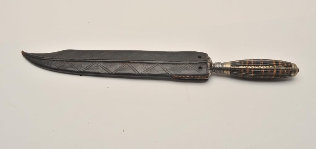 18AR-80 ITALIAN DAGGERItalian 18th Century dagger with leather sheath, approximately 16” overall with an 11” decorated blade; in overall good condition with clip point, dog images on both sides of blade at hilt, multi-color horn treatment togrip; leather sheath is overall good with small old loss to top right side from carry. Est.: $600-$1,200.Italian 18th Century dagger with leather sheath, approximately 16” overall with an 11” decorated blade; in overall good condition with clip point, dog images on both sides of blade at hilt, multi-color horn treatment togrip; leather sheath is overall good with small old loss to top right side from carry. Est.: $600-$1,200.