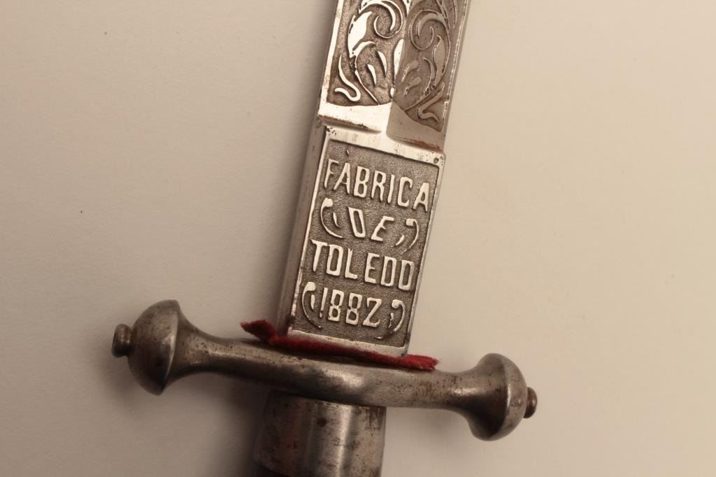18AR-82 TOLEDO DAGGERFab. De Toledo 1882 dagger in 17th century style with finely etched blade and iron mounts also retaining original scabbard. Measures approximately 12” overall with a 7” blade. The blade is ornately and deeplyetched on both sides and is re-enforced for piercing and remains in fine condition with all bright original polish. Very good original scabbard with minor scuffs and small losses to the scabbard. Exceptional. Est.:$400-$800Fab. De Toledo 1882 dagger in 17th century style with finely etched blade and iron mounts also retaining original scabbard. Measures approximately 12” overall with a 7” blade. The blade is ornately and deeplyetched on both sides and is re-enforced for piercing and remains in fine condition with all bright original polish. Very good original scabbard with minor scuffs and small losses to the scabbard. Exceptional. Est.:$400-$800