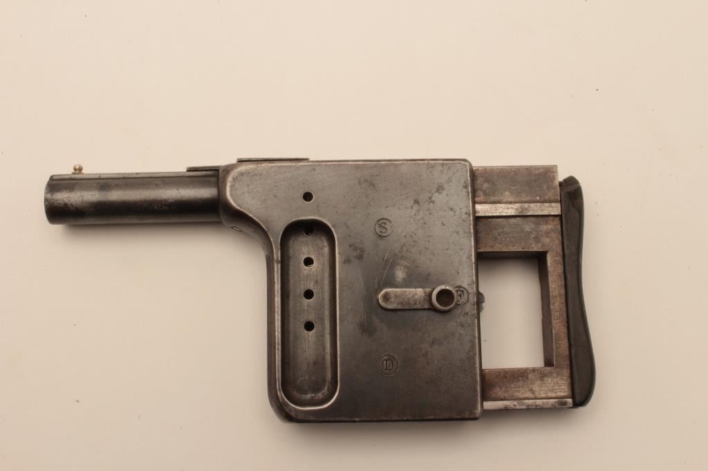 18AR-89 GALOIS PALM SQUEEZERGalois No. 1 8mm extra short palm squeezer by “Mfg. Francaise Armes and Cycle Works”. 50%-70% original blue and case colors with chip at the top of gutta percha squeezer grip. Works well. Good markings and good tovery good overall. (Antique) Est.: $750-$1500Galois No. 1 8mm extra short palm squeezer by “Mfg. Francaise Armes and Cycle Works”. 50%-70% original blue and case colors with chip at the top of gutta percha squeezer grip. Works well. Good markings and good tovery good overall. (Antique) Est.: $750-$1500