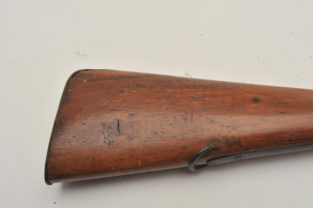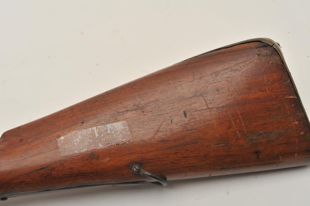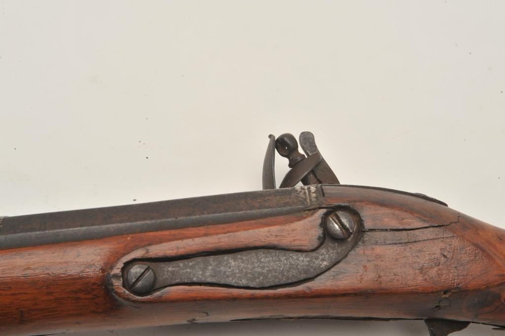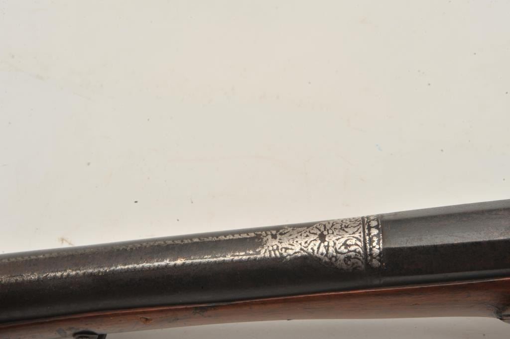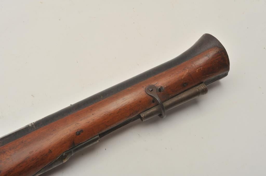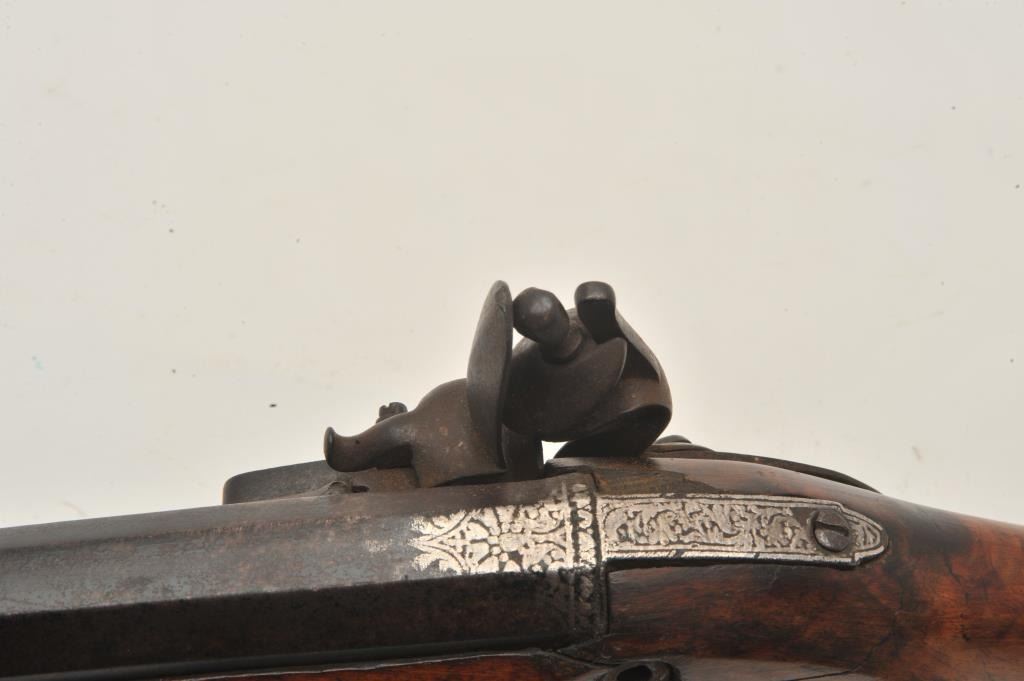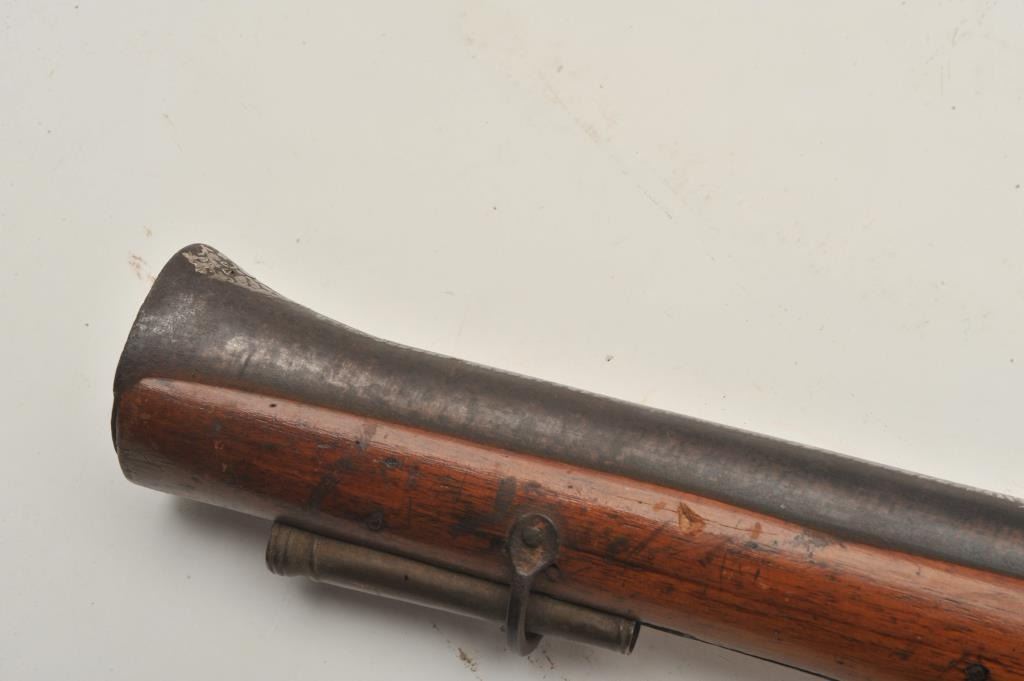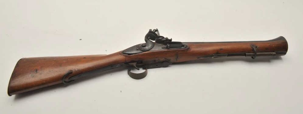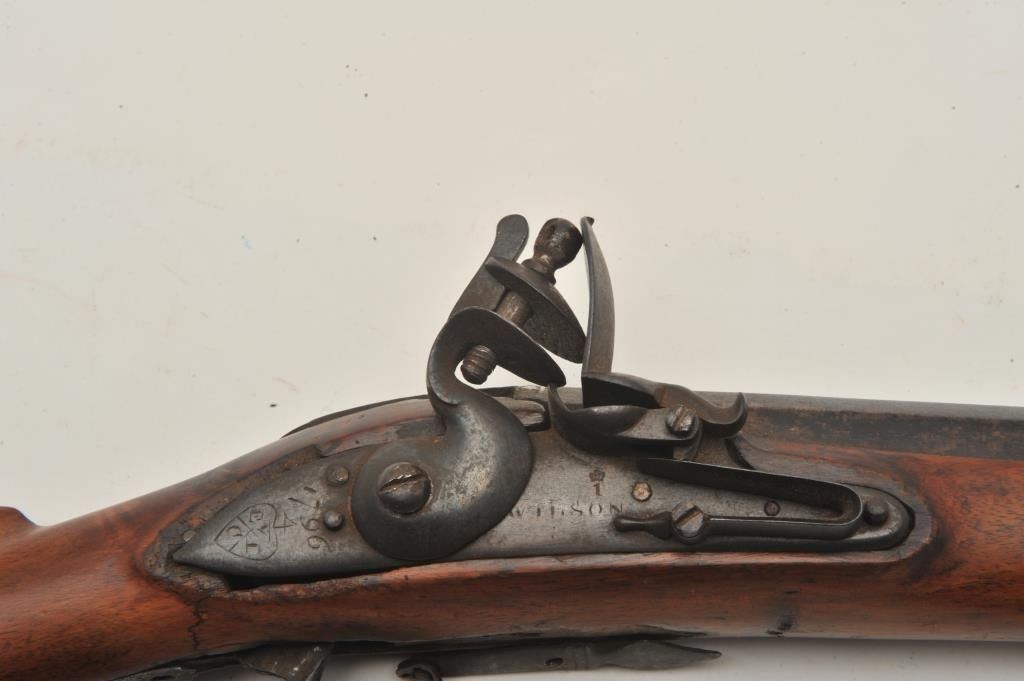18ASS-16 BLUNDERBUSSFlintlock blunderbuss, approximately 29.5” overall with a 15” iron barrel showing silver decoration, “Wilson” marked lockplate, wood stock, in overall fair to good condition with a dark patina to metal surfaces, workingaction, wood stock shows old crack on left side of wrist at upper tang and some old losses around lockplate area; repair to trigger guard. (Antique). Est.: $1,250-$2,500.Flintlock blunderbuss, approximately 29.5” overall with a 15” iron barrel showing silver decoration, “Wilson” marked lockplate, wood stock, in overall fair to good condition with a dark patina to metal surfaces, workingaction, wood stock shows old crack on left side of wrist at upper tang and some old losses around lockplate area; repair to trigger guard. (Antique). Est.: $1,250-$2,500.