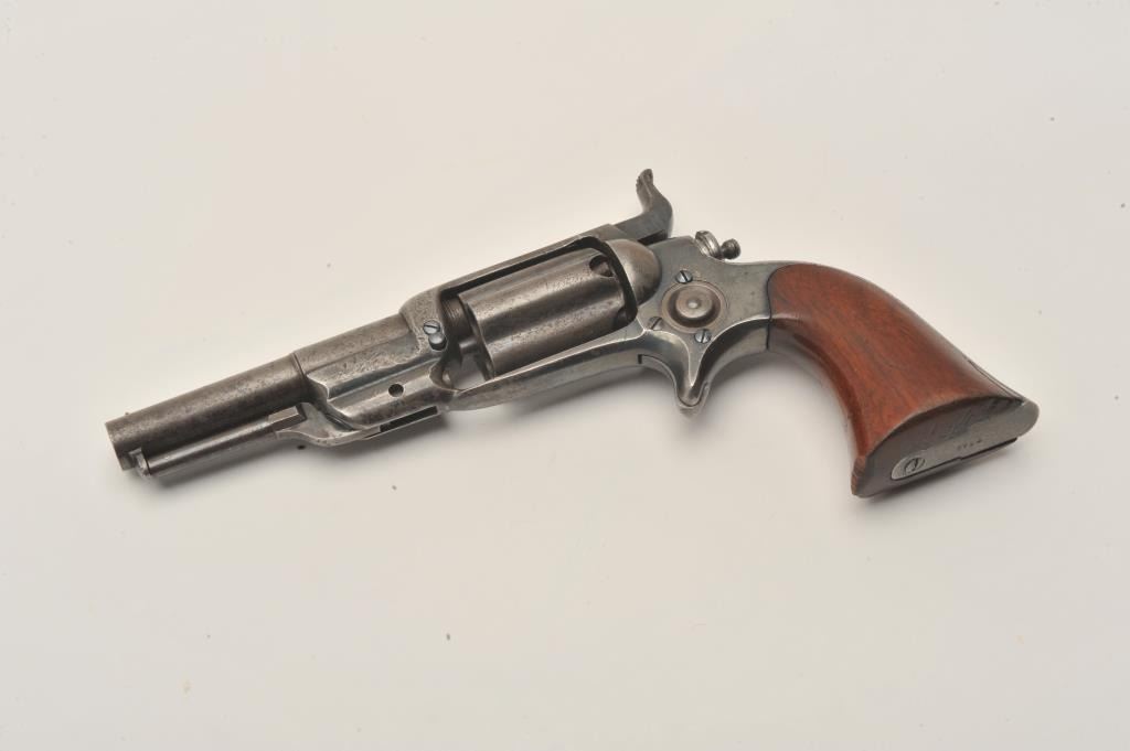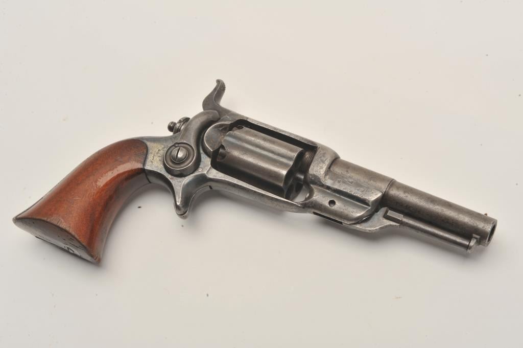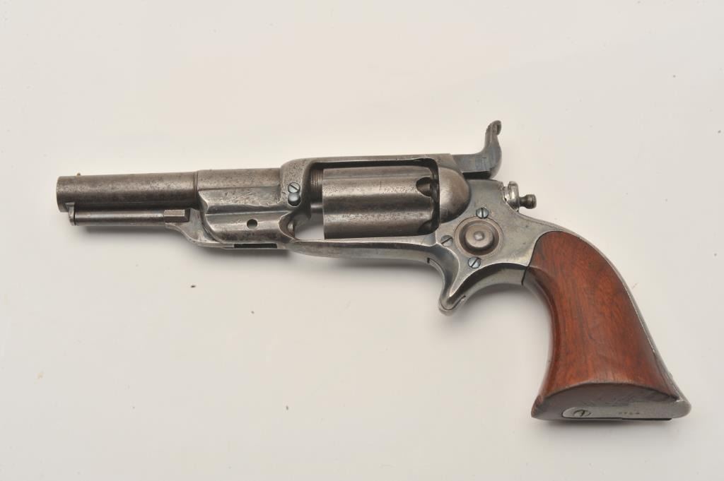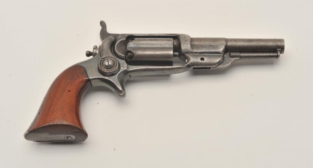 18ASS-6 ROOTColt Root spur trigger revolver, .31 caliber, 3.5” barrel, blued finish, wood grips, S/N 6734, in overall good condition displaying approximately 30% original finish in protected areas, sharp markings, action needs work, good to very good grips. (Antique). Est.: $1,100-$2,200.Colt Root spur trigger revolver, .31 caliber, 3.5” barrel, blued finish, wood grips, S/N 6734, in overall good condition displaying approximately 30% original finish in protected areas, sharp markings, action needs work, good to very good grips. (Antique). Est.: $1,100-$2,200.