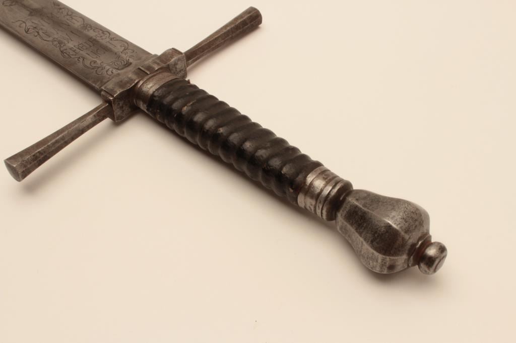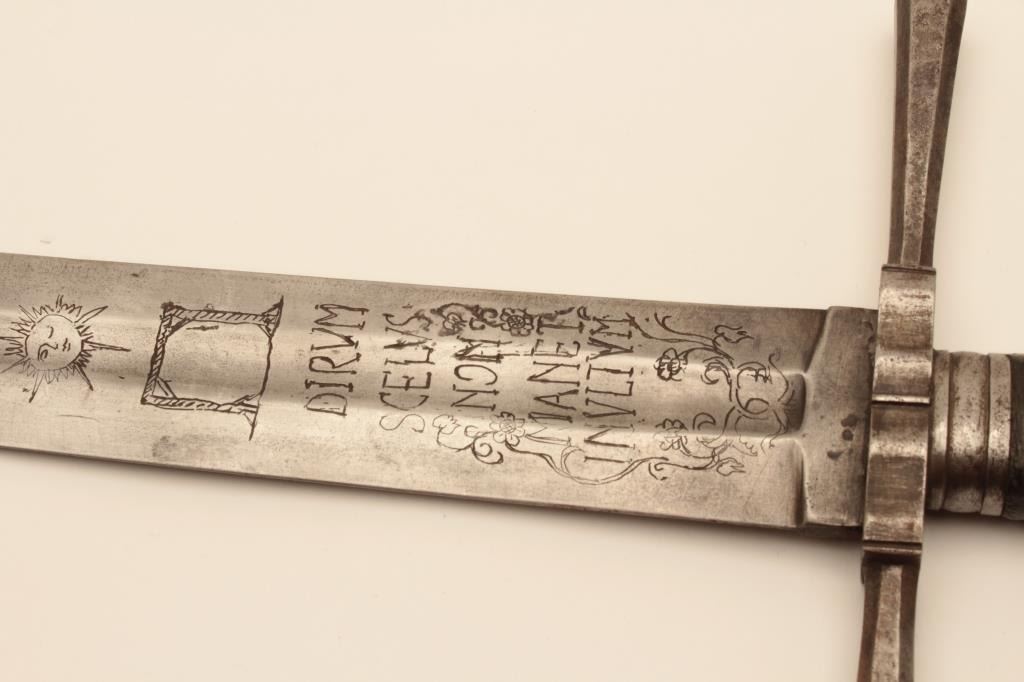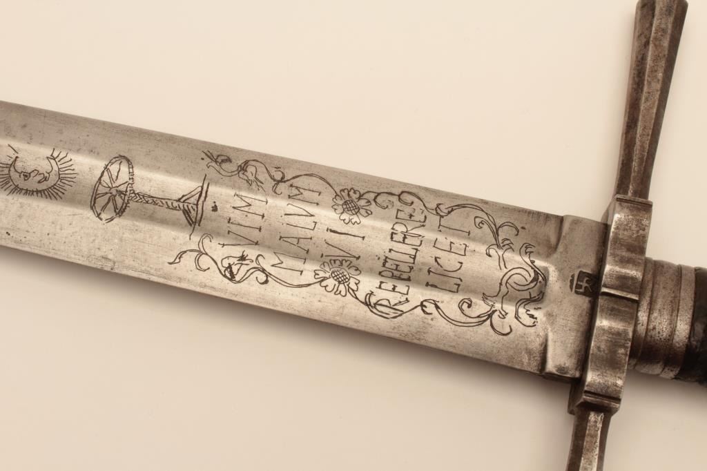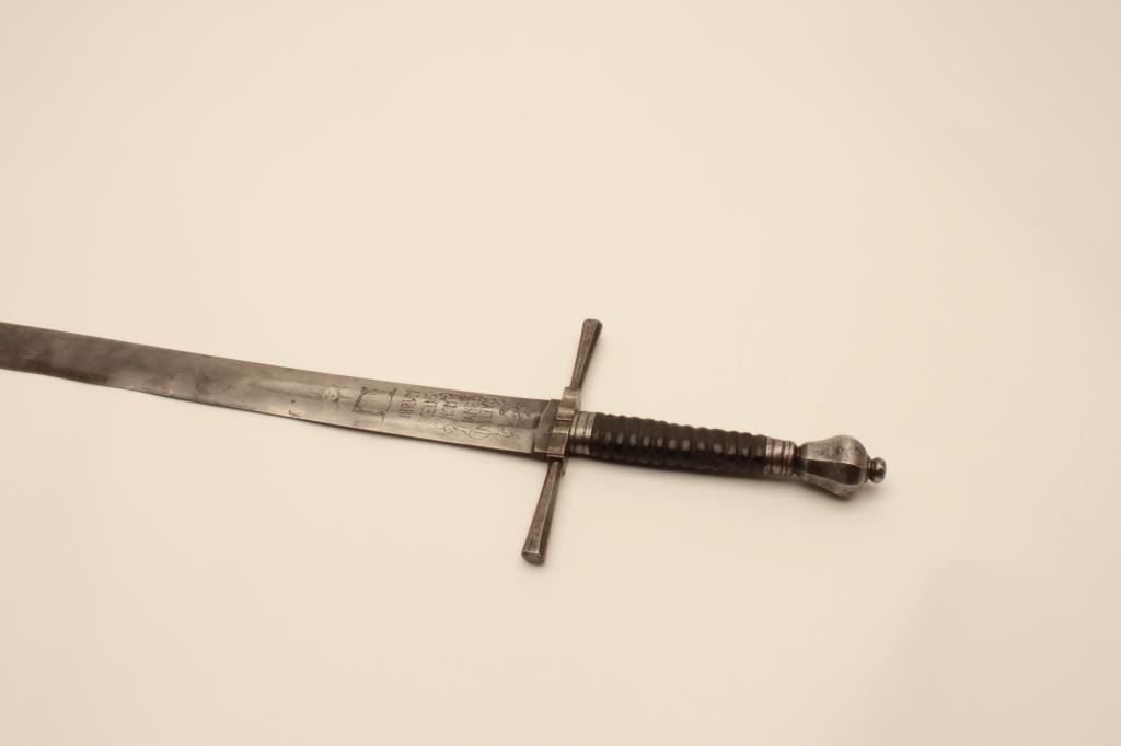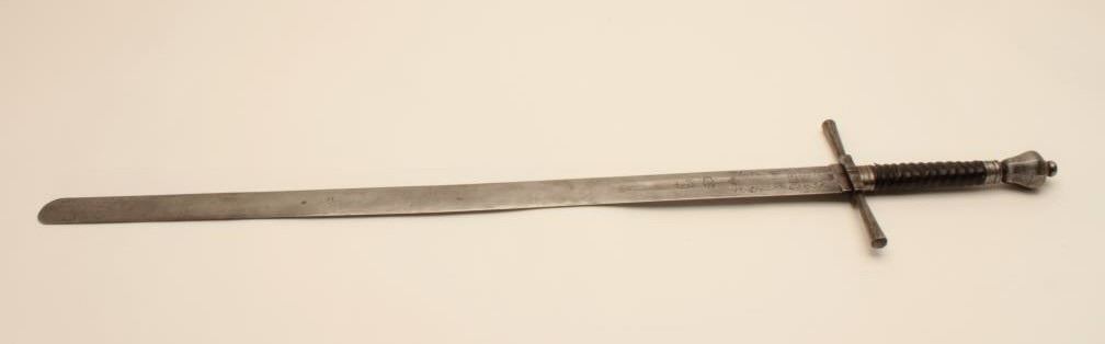 18AT-3 EXECUTIONERS SWORDEuropean 17th century or earlier sword of state (Executioner) measuring 41” overall with a 32 ¾” blade and 2” wide at the widest pointwith rounded tip. The blade is maker’s mark JK. The blade is engraved with “V.M.MALVM, VI, REPELLERE,LICET” and “DIRUM,SCELVS, NON, MANET, INVLIAM” with sun, gallows, torture wheel and scrolls. Leather over grooved wood grip and faceted pommel. Lightly cleaned and good condition withalmost fine blade. Est.: $2500-$5000European 17th century or earlier sword of state (Executioner) measuring 41” overall with a 32 ¾” blade and 2” wide at the widest pointwith rounded tip. The blade is maker’s mark JK. The blade is engraved with “V.M.MALVM, VI, REPELLERE,LICET” and “DIRUM,SCELVS, NON, MANET, INVLIAM” with sun, gallows, torture wheel and scrolls. Leather over grooved wood grip and faceted pommel. Lightly cleaned and good condition withalmost fine blade. Est.: $2500-$5000