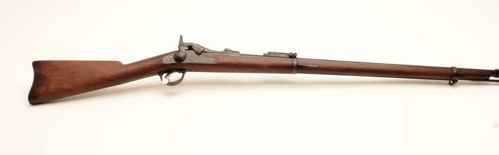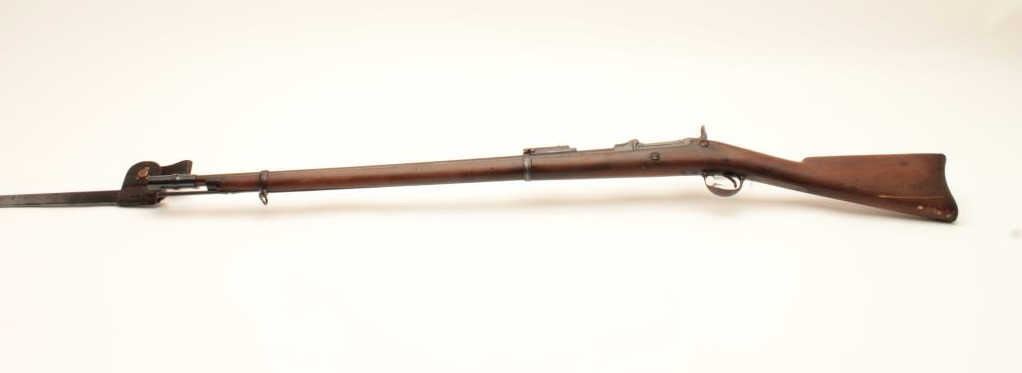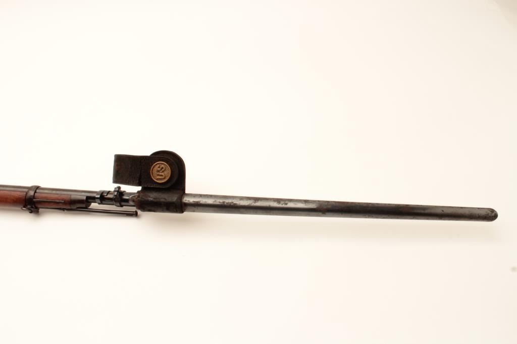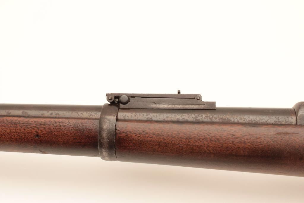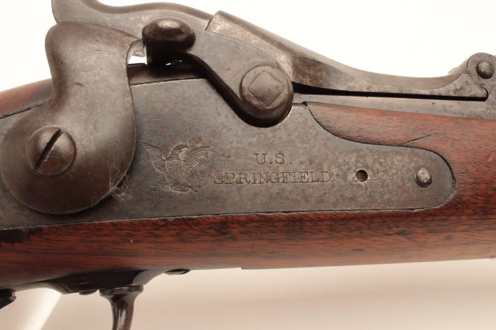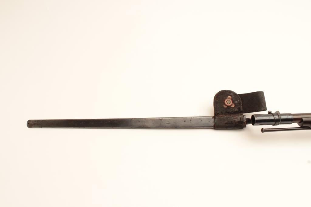 18BC-2 US SPRINGFIELD TO TRAPDOOR CONV.U.S. Springfield Model 1884 Trapdoor single shot rifle, Serial #87082. The rifle is in good overall condition with a 29” barrel with blade front and military style tangent rear sights. The barrel retains a significantamount of blue finish with the remainder going to brown patina with some light to moderate surface rust and erosion noted. The receiver shows muted, toning case hardening as well as on the side plate. The smoothwood stock is in good condition showing moderate wear and use with mars and compressions consistent with service use. The stock includes sling swivels, ramrod and ends with smooth steel US marked butt platewhich is slightly proud at the toe. The bore is fair, the action crisp and markings are sharp. The lot includes the bayonet with scabbard and leather frog with brass US ornamentation. Est.: $500-$1,000.(Antique).U.S. Springfield Model 1884 Trapdoor single shot rifle, Serial #87082. The rifle is in good overall condition with a 29” barrel with blade front and military style tangent rear sights. The barrel retains a significantamount of blue finish with the remainder going to brown patina with some light to moderate surface rust and erosion noted. The receiver shows muted, toning case hardening as well as on the side plate. The smoothwood stock is in good condition showing moderate wear and use with mars and compressions consistent with service use. The stock includes sling swivels, ramrod and ends with smooth steel US marked butt platewhich is slightly proud at the toe. The bore is fair, the action crisp and markings are sharp. The lot includes the bayonet with scabbard and leather frog with brass US ornamentation. Est.: $500-$1,000.(Antique).