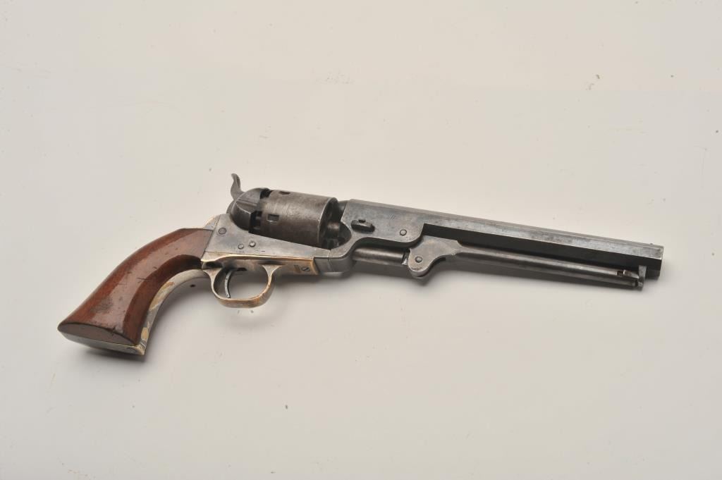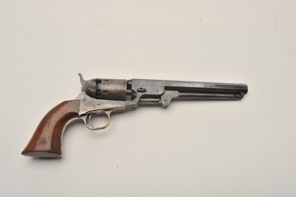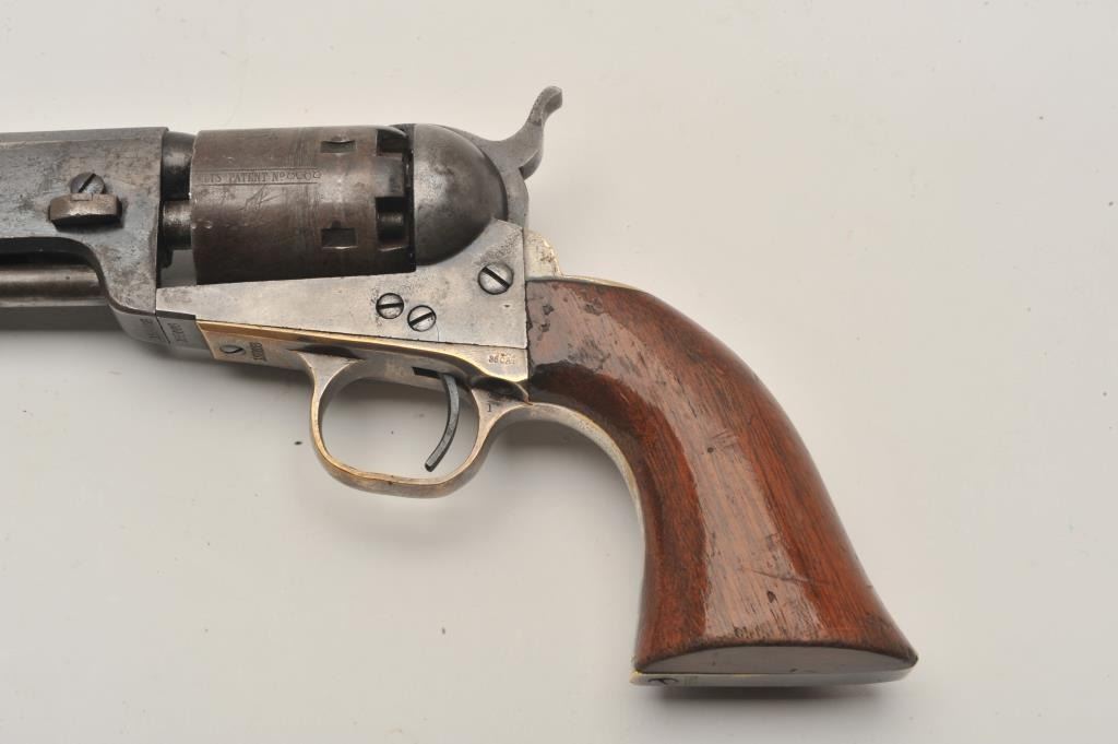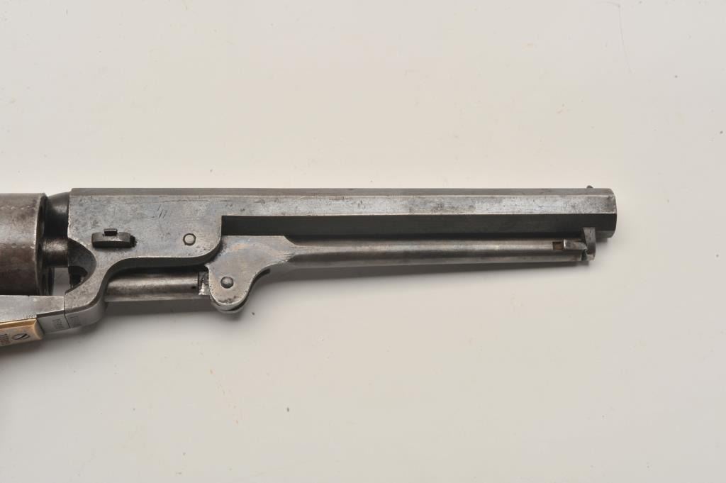 18BD-5 COLT 1851 NAVY #158668Colt 1851 Navy .36 caliber revolver in very good condition, 4th model with capping grove and New York address, S/N 158668. This revolver shows 50%-70% original blue on the barrel that is thinning and aging naturally.Minor scratches and erosion with sharp edges and good markings. 50%-70% light original scene on the cylinder with 20%-30% blue. 20%-40% case hardening on the frame, lever and hammer drifting to silver with somerainbow colors still visible. 60% plus original silver on the straps. The grips are very good plus to almost fine with 75%-85% original varnish and a few minor scratches. The action is tight and the safety pins areall intact. All matching visible serial numbers. A nice authentic Colt Navy with a lot of original finish. (Antique) Est.: $2500-$5000Colt 1851 Navy .36 caliber revolver in very good condition, 4th model with capping grove and New York address, S/N 158668. This revolver shows 50%-70% original blue on the barrel that is thinning and aging naturally.Minor scratches and erosion with sharp edges and good markings. 50%-70% light original scene on the cylinder with 20%-30% blue. 20%-40% case hardening on the frame, lever and hammer drifting to silver with somerainbow colors still visible. 60% plus original silver on the straps. The grips are very good plus to almost fine with 75%-85% original varnish and a few minor scratches. The action is tight and the safety pins areall intact. All matching visible serial numbers. A nice authentic Colt Navy with a lot of original finish. (Antique) Est.: $2500-$5000