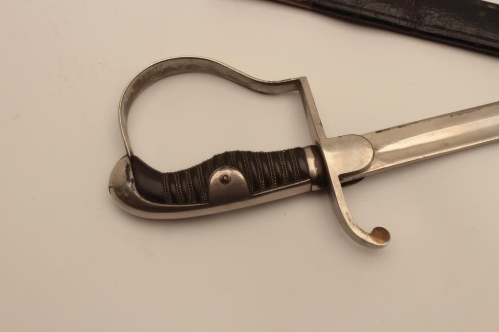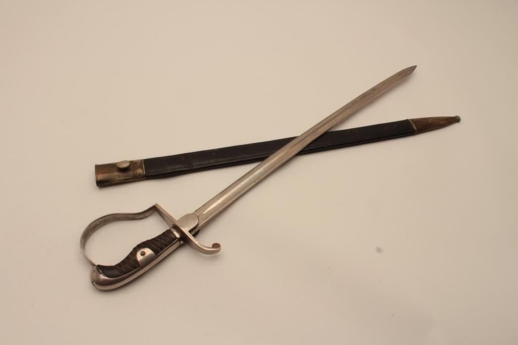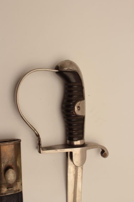 18BF-4 GERMAN POLICE SWORDGerman Police sword circa 1900-1920’s. The sword is in good overall condition with a leather scabbard with brass ornamentation. The sword has a 22 ½” blade with an overall length of 27 ½”. The blade has beensharpened and retains the majority of its original finish. A steel handguard and wire wrapped plastic handle are in good condition. Est.: $75-$150.German Police sword circa 1900-1920’s. The sword is in good overall condition with a leather scabbard with brass ornamentation. The sword has a 22 ½” blade with an overall length of 27 ½”. The blade has beensharpened and retains the majority of its original finish. A steel handguard and wire wrapped plastic handle are in good condition. Est.: $75-$150.