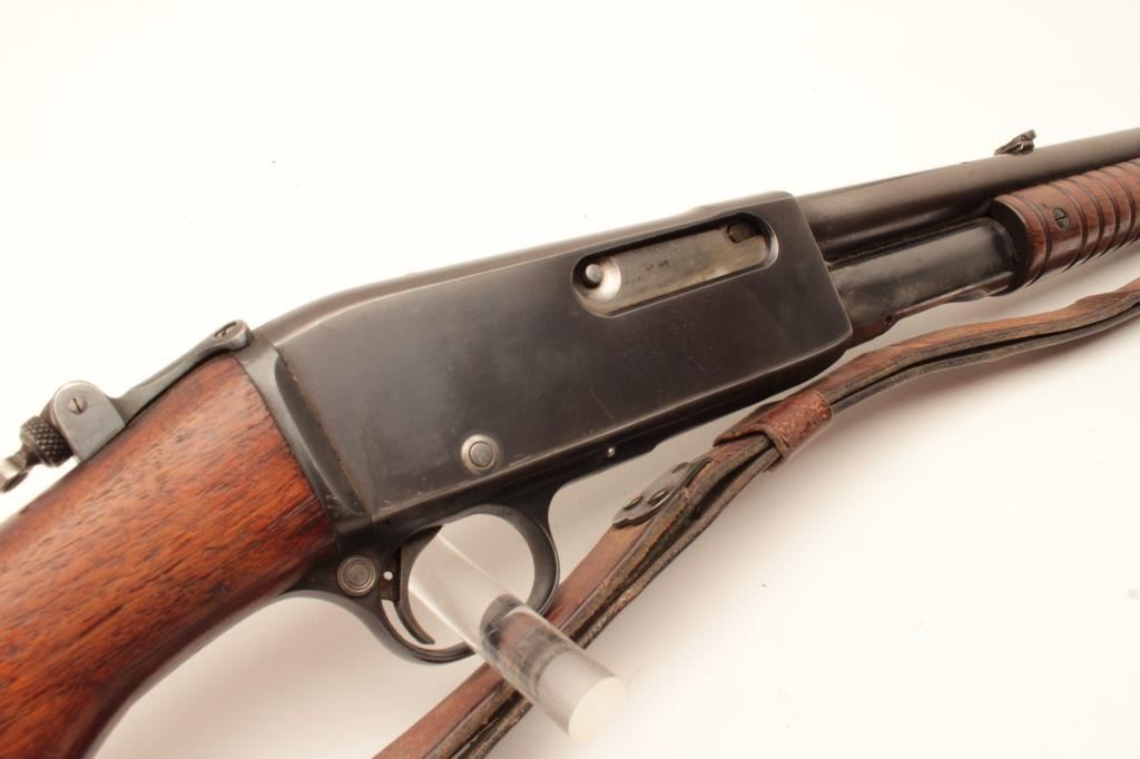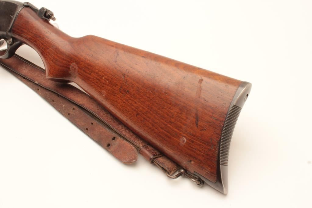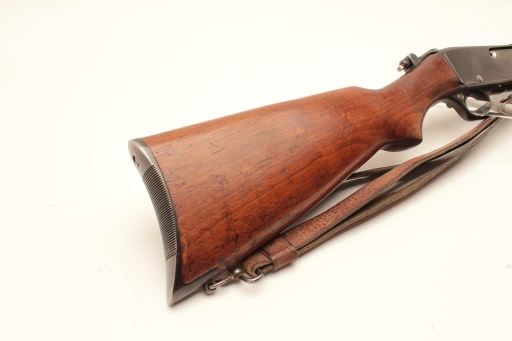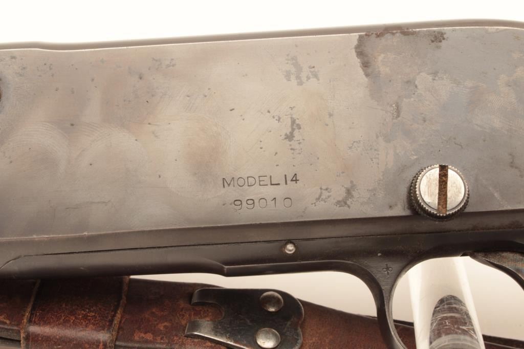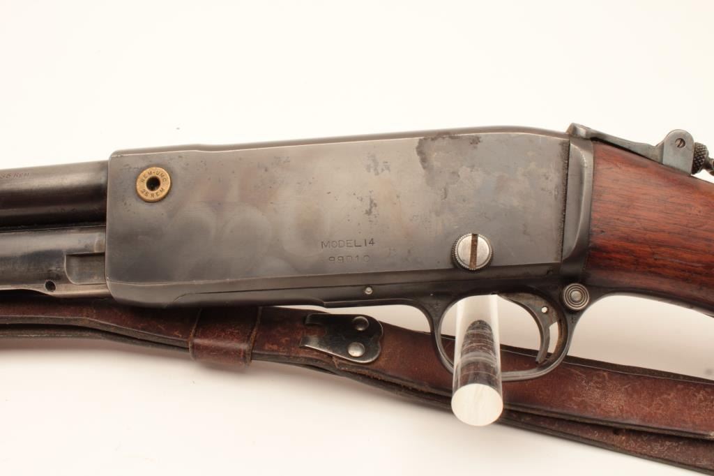18BG-13 REMINGTON MDL 14 #99010Remington Model 14 pump action rifle, .35 REM. caliber, blued finish, wood stocks, S/N 99010, with leather sling, overall good condition with considerable blued finish remaining, adjustable tang adjustable sight,re-positioned rear sight, good bore, good action and good wood. (C&R/PPT). Est.: $150-$300.Remington Model 14 pump action rifle, .35 REM. caliber, blued finish, wood stocks, S/N 99010, with leather sling, overall good condition with considerable blued finish remaining, adjustable tang adjustable sight,re-positioned rear sight, good bore, good action and good wood. (C&R/PPT). Est.: $150-$300.