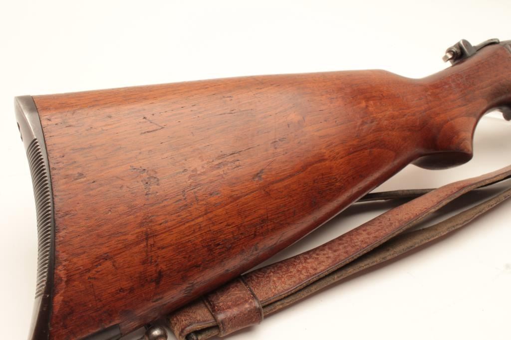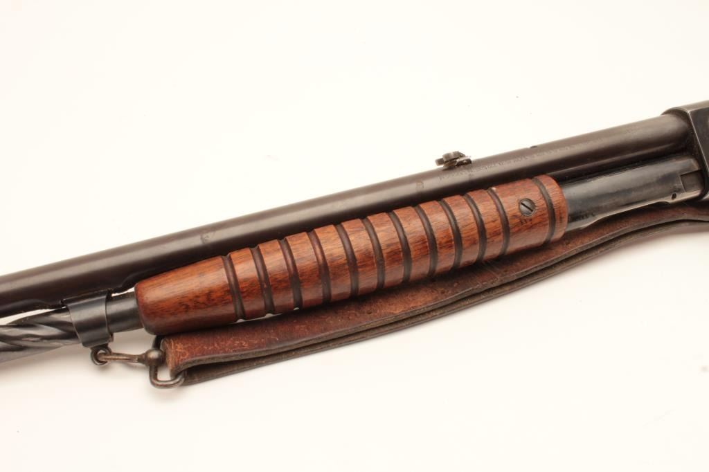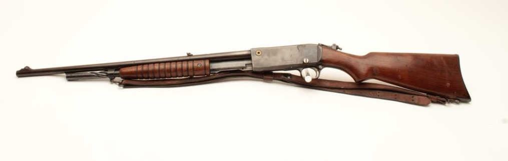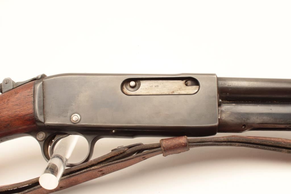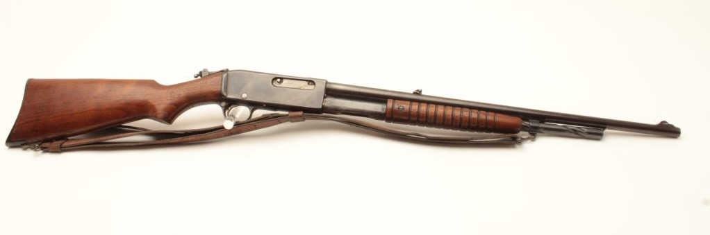 18BG-13 REMINGTON MDL 14 #99010Remington Model 14 pump action rifle, .35 REM. caliber, blued finish, wood stocks, S/N 99010, with leather sling, overall good condition with considerable blued finish remaining, adjustable tang adjustable sight,re-positioned rear sight, good bore, good action and good wood. (C&R/PPT). Est.: $150-$300.Remington Model 14 pump action rifle, .35 REM. caliber, blued finish, wood stocks, S/N 99010, with leather sling, overall good condition with considerable blued finish remaining, adjustable tang adjustable sight,re-positioned rear sight, good bore, good action and good wood. (C&R/PPT). Est.: $150-$300.