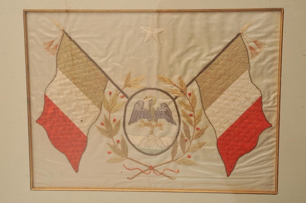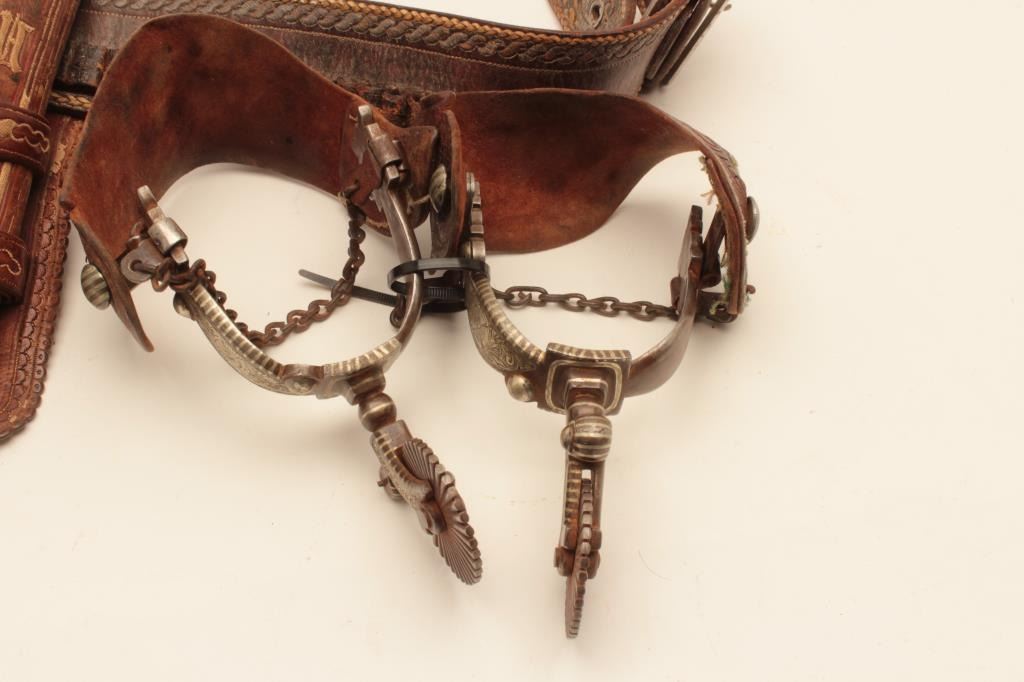 18BJ-11 MISC LOTLot of 3 classic Mexican Border Wars era pieces including a fancy leather and pitiado double loop holster with cartridge belt, possibly for a Colt Lightning revolver or early 1900’s DA revolver, a pair of silverdecorated Mexican iron spurs with tooled leather straps and a beautifully framed and matted silk and embroidered crossed Mexican flags with center snake and eagle emblem, approximately 23” x 28” overall. Est.:$750-$1,500.Lot of 3 classic Mexican Border Wars era pieces including a fancy leather and pitiado double loop holster with cartridge belt, possibly for a Colt Lightning revolver or early 1900’s DA revolver, a pair of silverdecorated Mexican iron spurs with tooled leather straps and a beautifully framed and matted silk and embroidered crossed Mexican flags with center snake and eagle emblem, approximately 23” x 28” overall. Est.:$750-$1,500.
