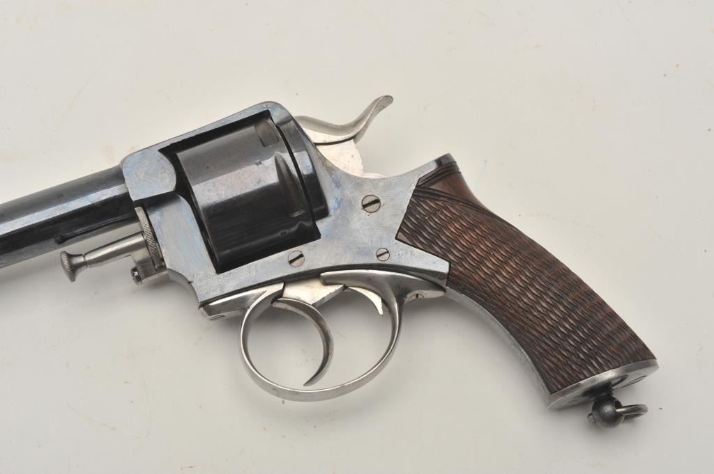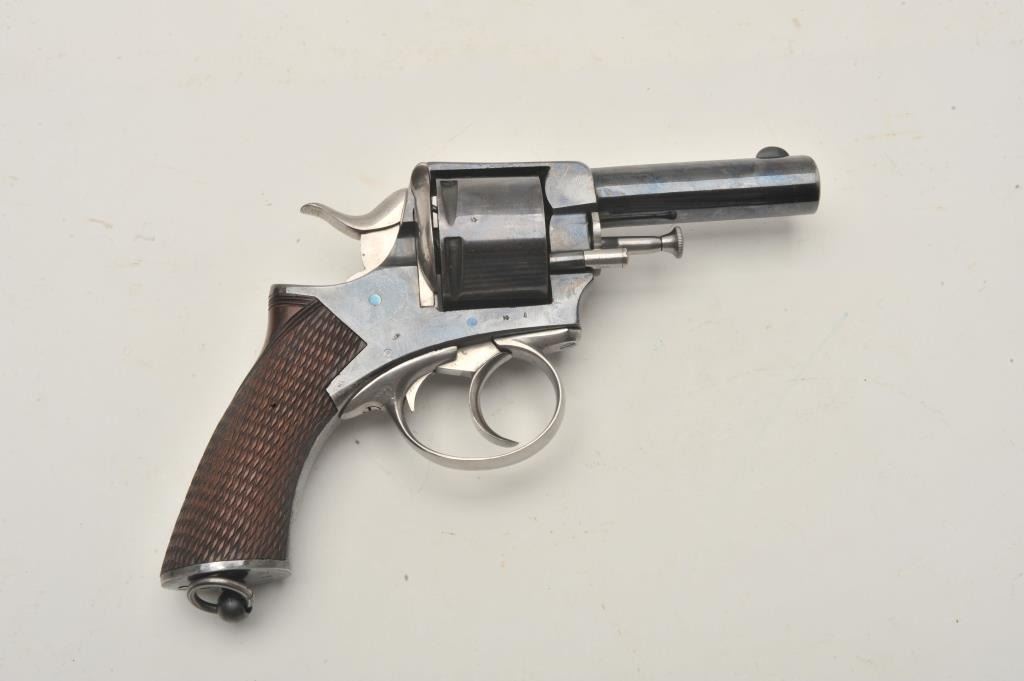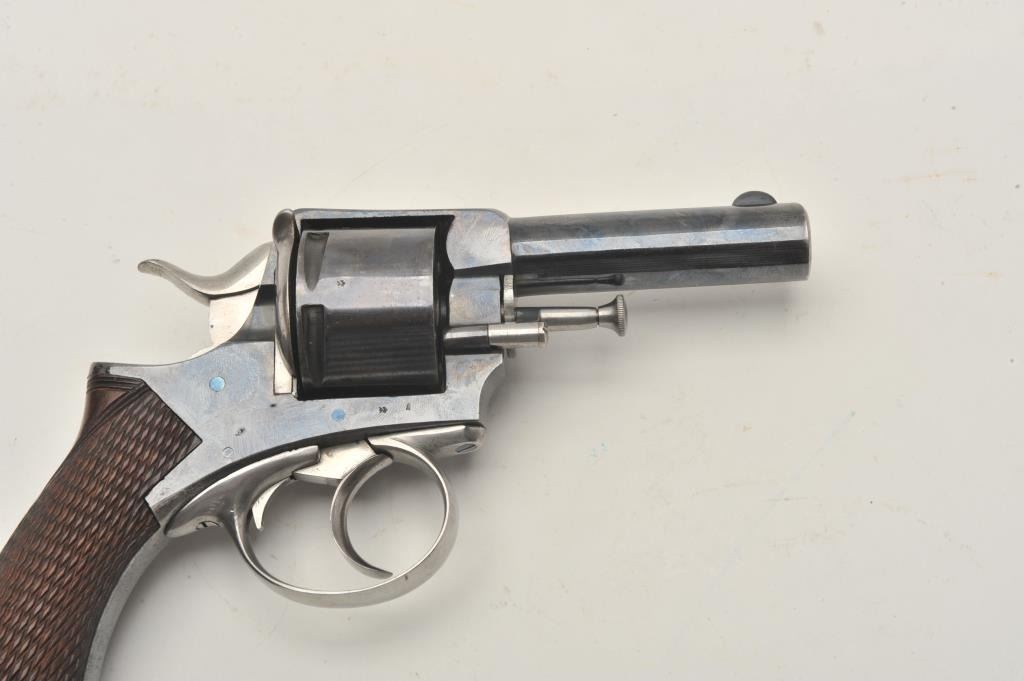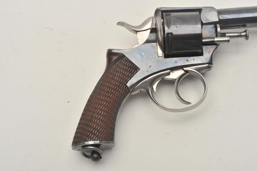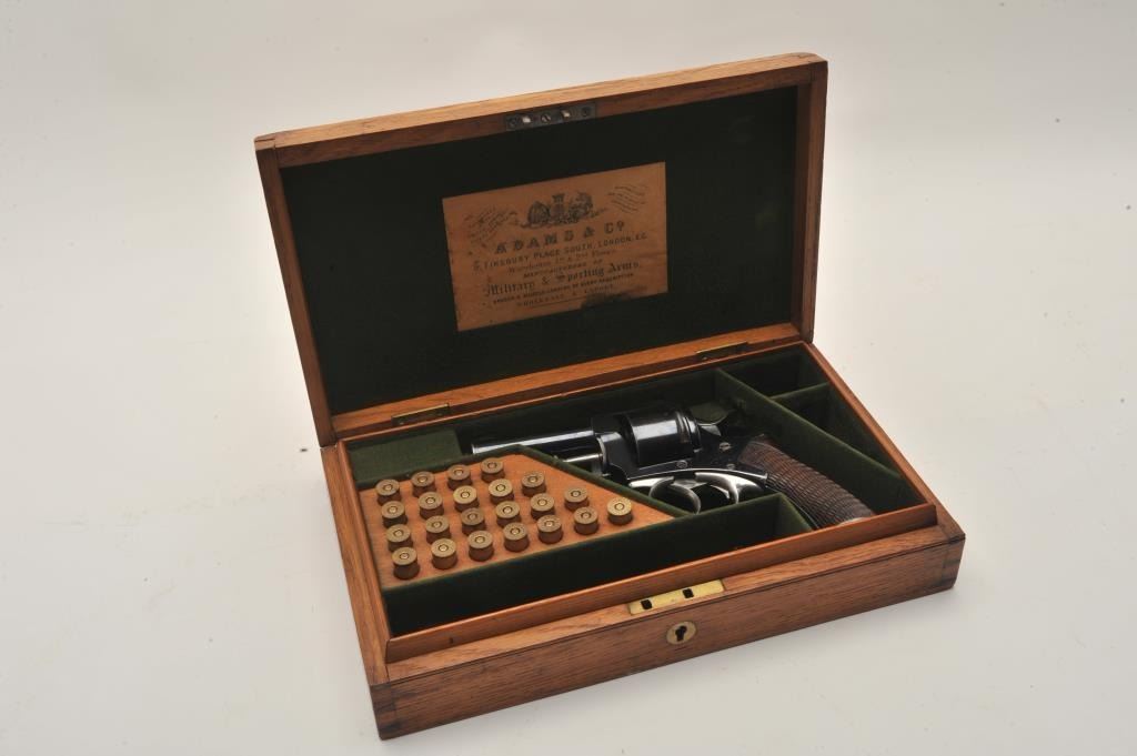 18BL-7 ADAM REVOLVERBeautiful Cased Adams & Co. revolver, .455 caliber, Serial #4032. The pistol is in fine overall condition with a 3 ¼” barrel with a polished rib and blade front sight. The pistol retains the majority of its bluefinish with small mars and loss of finish at the muzzle. The top strap is engraved, “ADAMS & Co., 9 FINSBURY PLACE SOUTH LONDON”. The finely checkered Walnut grips are in very good condition with handling marks,sharp checkering and the lanyard ring retained at the butt. The wooden case is in good overall condition with green felt lining worn in places with a trade label in the lid, cleaning rod, screwdriver and 22 roundsof loaded ammunition in the cartridge holders. Est.: $1,500-$3,000. (Antique).Beautiful Cased Adams & Co. revolver, .455 caliber, Serial #4032. The pistol is in fine overall condition with a 3 ¼” barrel with a polished rib and blade front sight. The pistol retains the majority of its bluefinish with small mars and loss of finish at the muzzle. The top strap is engraved, “ADAMS & Co., 9 FINSBURY PLACE SOUTH LONDON”. The finely checkered Walnut grips are in very good condition with handling marks,sharp checkering and the lanyard ring retained at the butt. The wooden case is in good overall condition with green felt lining worn in places with a trade label in the lid, cleaning rod, screwdriver and 22 roundsof loaded ammunition in the cartridge holders. Est.: $1,500-$3,000. (Antique).