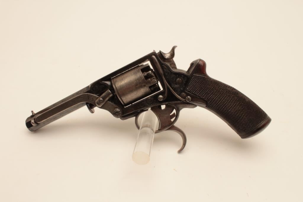 18BL-9 TRANTER #21839TWilliam Tranter revolver, .36 caliber, Serial #21859T. The pistol is in fine overall condition with a 4” octagon barrel. The barrel and frame retain the majority of their blue finish with tasteful scroll engravingand numerous English proof marks. The barrel address is agent marked, “MADE BY Wm. TRANTER FOR A.B. GRISWOLD & Co. NEW ORLEANS”. The cylinder shows toning case hardening and additional proofs, while the cylinder pin displays significant bright blue. The frame and the rammer are both marked, “W. TRANTER PATENT”. The finely checkered Walnut grips are in very good condition with light handling marks. The grip cap and screw headare also nicely engraved. Est.: $2,500-$5,000. (Antique).William Tranter revolver, .36 caliber, Serial #21859T. The pistol is in fine overall condition with a 4” octagon barrel. The barrel and frame retain the majority of their blue finish with tasteful scroll engravingand numerous English proof marks. The barrel address is agent marked, “MADE BY Wm. TRANTER FOR A.B. GRISWOLD & Co. NEW ORLEANS”. The cylinder shows toning case hardening and additional proofs, while the cylinder pin displays significant bright blue. The frame and the rammer are both marked, “W. TRANTER PATENT”. The finely checkered Walnut grips are in very good condition with light handling marks. The grip cap and screw headare also nicely engraved. Est.: $2,500-$5,000. (Antique).