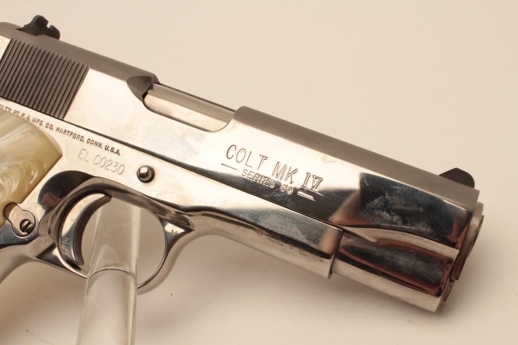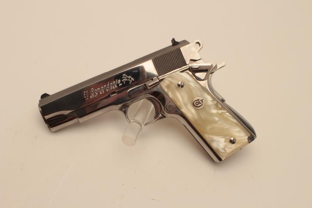 18BM-11 COLT EL COMMANDANTE #ELCO230Colt El Comandante Series 80 38 Super, #EL CO230, bright stainless finish, 4 1/4" barrel, 3 dot drift adjustable sights, faux pearl medallion grips. Pistol is in almost new condition, nickel could use a lightpolish. Action is very good, bore is very good, grips are as new. Includes factory hard case, outer sleeve in very good condition, manual and one correct magazine. (Modern / PPT) Est. $1250-2500Colt El Comandante Series 80 38 Super, #EL CO230, bright stainless finish, 4 1/4" barrel, 3 dot drift adjustable sights, faux pearl medallion grips. Pistol is in almost new condition, nickel could use a lightpolish. Action is very good, bore is very good, grips are as new. Includes factory hard case, outer sleeve in very good condition, manual and one correct magazine. (Modern / PPT) Est. $1250-2500