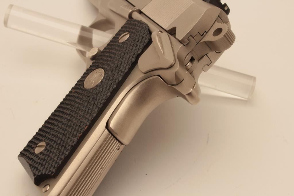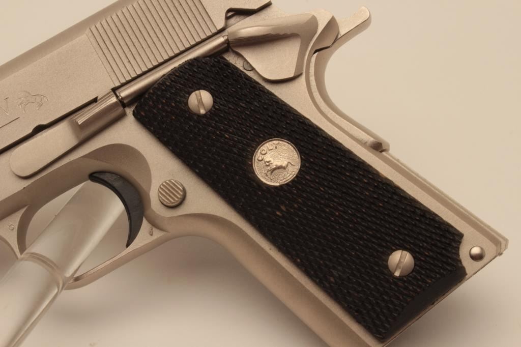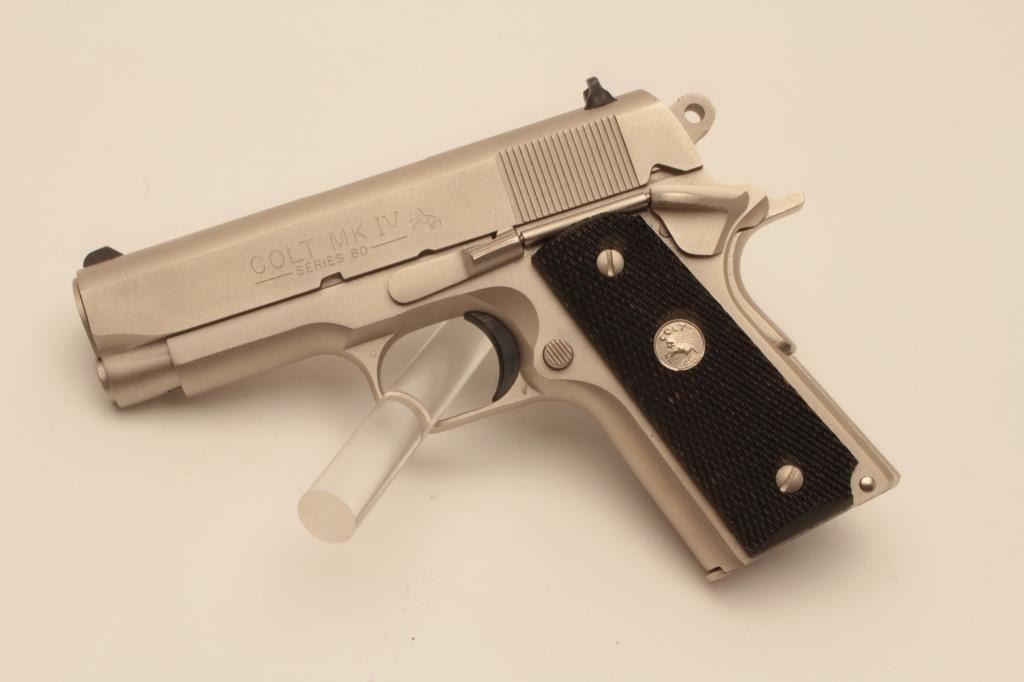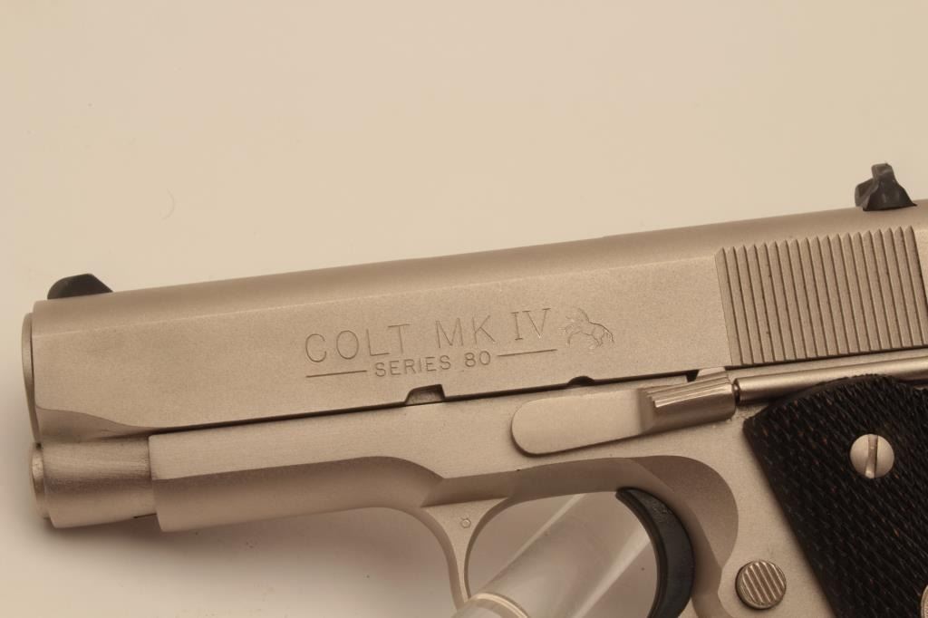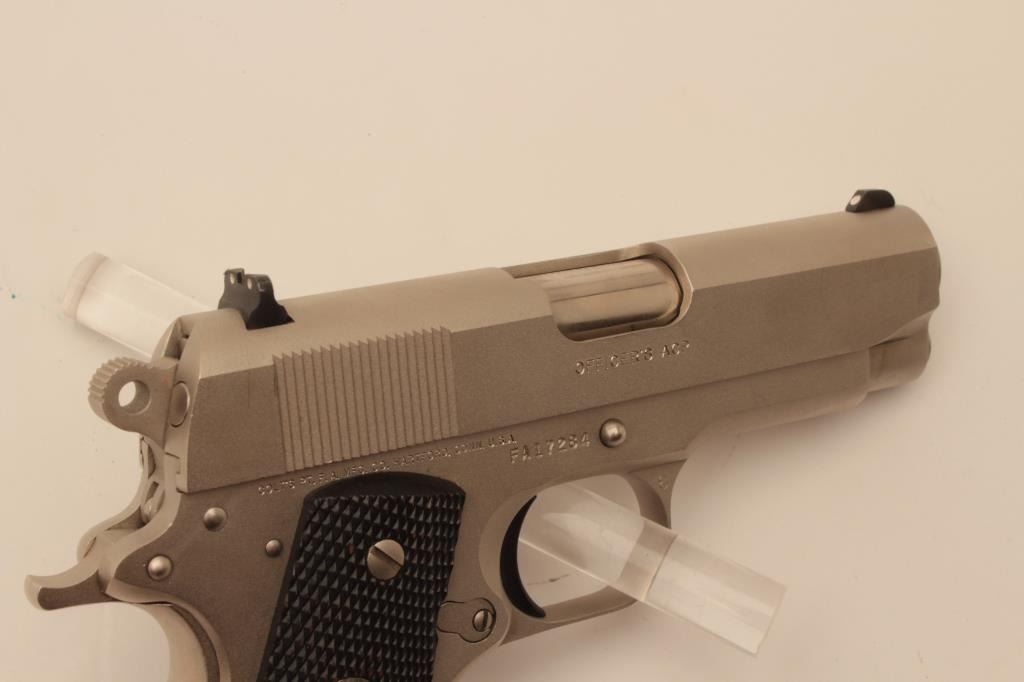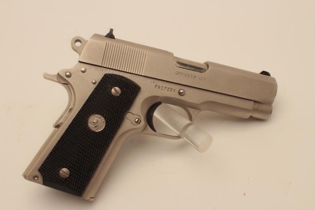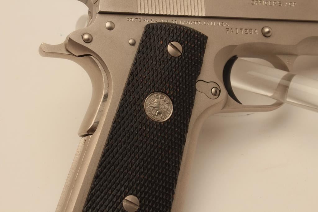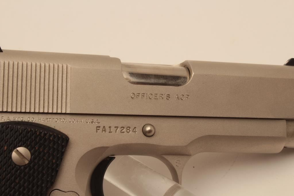 18BM-27 COLT OFF. ACPColt Officers Model Series 80, .45 ACP, #FA17284, satin nickel finish, 3 1/2" barrel, 3 dot drift adjustable sights with checkered medallion grips. Pistol is in excellent condition overall, with just slight handlingmarks. Comes with original wood grain box in very good condition, with some minor tears, owners manual and one correct mag. (Modern / PPT) Est. $700-1400Colt Officers Model Series 80, .45 ACP, #FA17284, satin nickel finish, 3 1/2" barrel, 3 dot drift adjustable sights with checkered medallion grips. Pistol is in excellent condition overall, with just slight handlingmarks. Comes with original wood grain box in very good condition, with some minor tears, owners manual and one correct mag. (Modern / PPT) Est. $700-1400