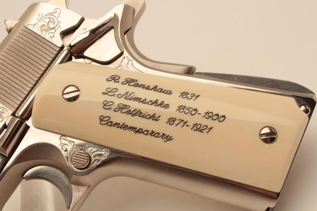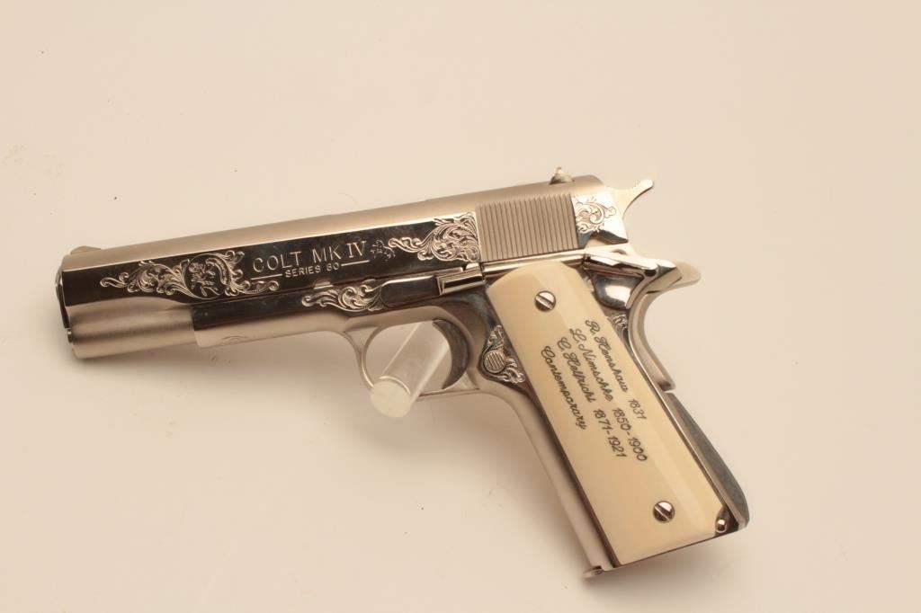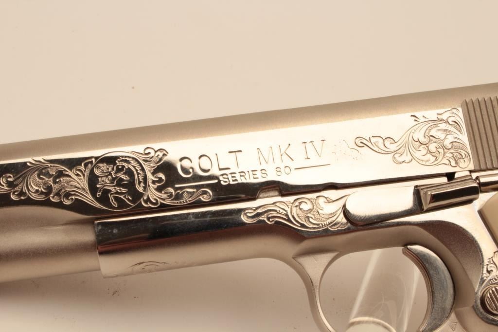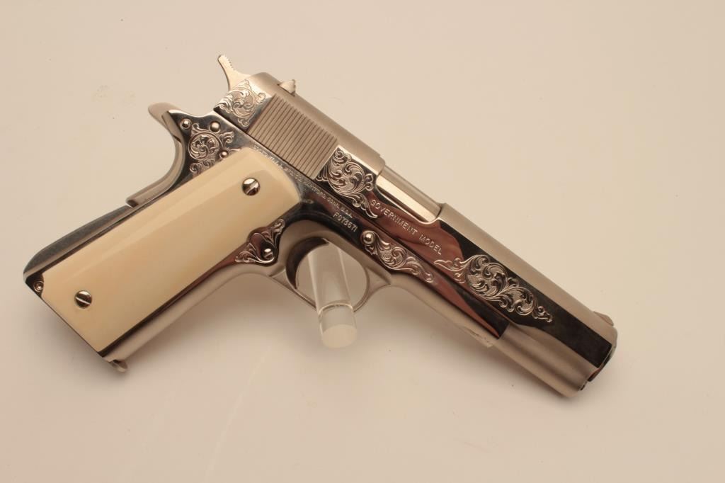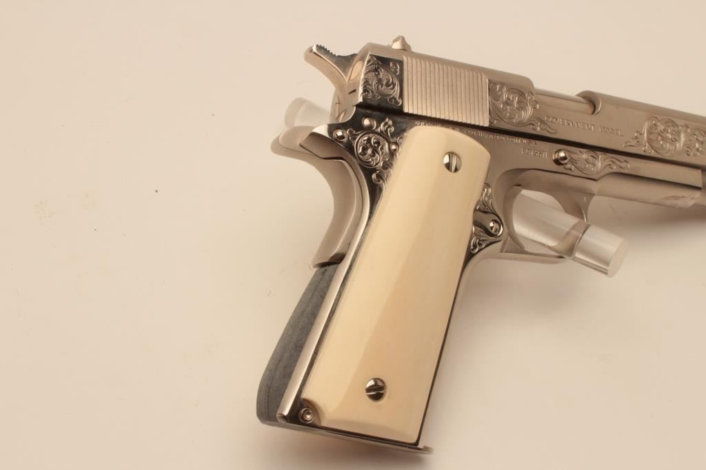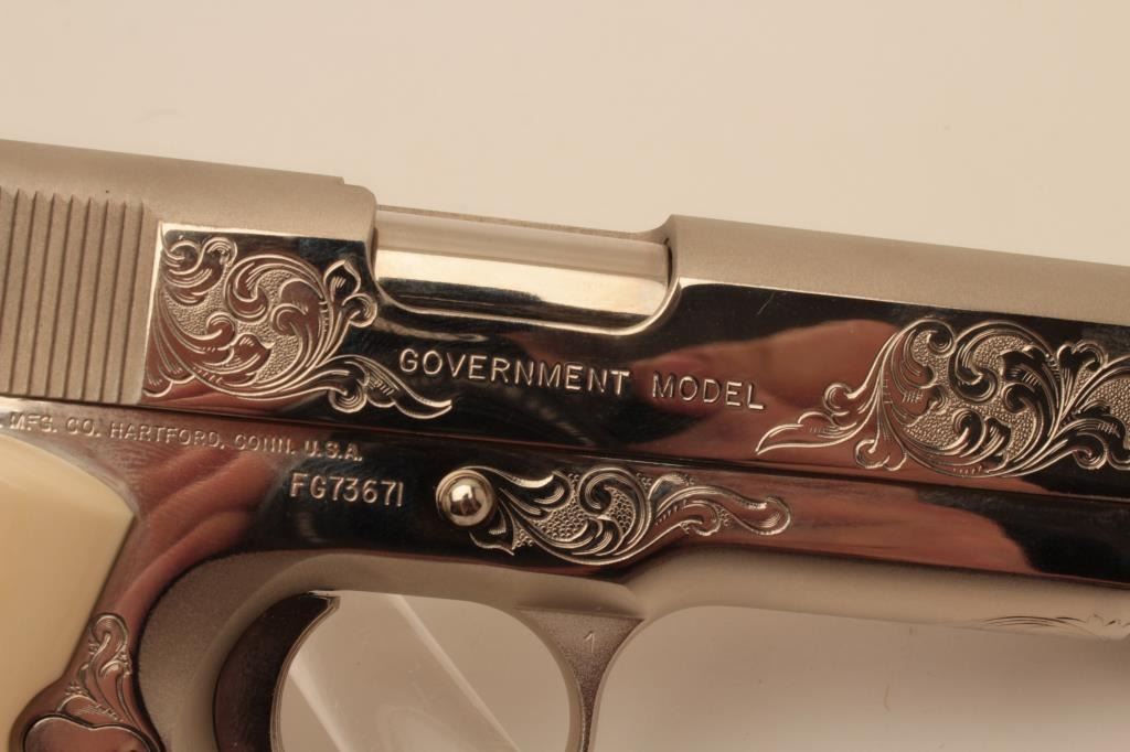 18BM-36 COLT GOV'T MDLEUltra rare Colt Custom Shop Government Model Engraving Sampler, .45 ACP, nickel finish, #FG73671, 5" barrel, scrimshawed ivory grips. The Colt Custom Shop commemorated the 150th anniversary of Colt with these Engravingsamplers, which featured examples of famous Colt engravers Henshaw, Nimschke and Helfricht along with their best contemporary Custom Shop engravers. The result is a representation of Colt engraving over thehistory of the company on a single gun. This pistol is in excellent condition, retaining the origional hang tag. Includes origional Custom Shop burgundy box numbered to the gun, CS#2989, confirming features. Box is invery good condition, and includes manual. (Modern / PPT) Est. $2500-5000Ultra rare Colt Custom Shop Government Model Engraving Sampler, .45 ACP, nickel finish, #FG73671, 5" barrel, scrimshawed ivory grips. The Colt Custom Shop commemorated the 150th anniversary of Colt with these Engravingsamplers, which featured examples of famous Colt engravers Henshaw, Nimschke and Helfricht along with their best contemporary Custom Shop engravers. The result is a representation of Colt engraving over thehistory of the company on a single gun. This pistol is in excellent condition, retaining the origional hang tag. Includes origional Custom Shop burgundy box numbered to the gun, CS#2989, confirming features. Box is invery good condition, and includes manual. (Modern / PPT) Est. $2500-5000