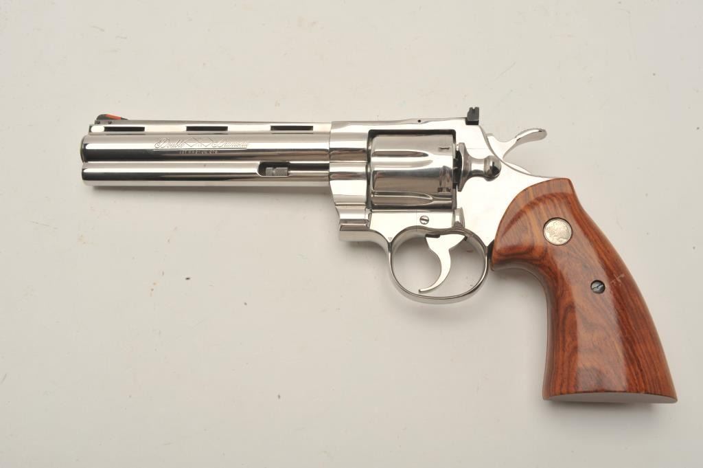 18BM-37 COLT DOUBLE DIAMONDColt Double Diamond Set consisting of a matched pair of a Python revolver and Officer's Model semi automatic. The Python is a .357 Mag, bright stainless, #DD0666, 6" barrel with "Double Diamond" etched in theleft side of the barrel, adjustable sights with smooth hardwood logo grips. Revolver is in excellent condition, grips show minor scratches from handling. The Officer's Model is a .45 ACP, bright stainless, #066DD, 31/2" barrel, with "Double Diamond" etched on the left side of the slide, 3 dot drift adjustable sights and smooth hardwood logo grips. The pistol is in excellent condition. Both come with the original boxes, in verygood condition, showing minor tears. (Modern / PPT) Est. 3000-6000Colt Double Diamond Set consisting of a matched pair of a Python revolver and Officer's Model semi automatic. The Python is a .357 Mag, bright stainless, #DD0666, 6" barrel with "Double Diamond" etched in theleft side of the barrel, adjustable sights with smooth hardwood logo grips. Revolver is in excellent condition, grips show minor scratches from handling. The Officer's Model is a .45 ACP, bright stainless, #066DD, 31/2" barrel, with "Double Diamond" etched on the left side of the slide, 3 dot drift adjustable sights and smooth hardwood logo grips. The pistol is in excellent condition. Both come with the original boxes, in verygood condition, showing minor tears. (Modern / PPT) Est. 3000-6000