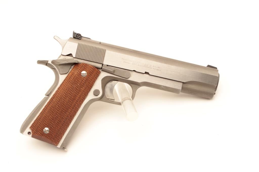 18BM-42 RANDALL SERVICE MDLEarly Randall Service Model .45 ACP left handed stainless semi automatic pistol, #RF0002269, 5" barrel, adjustable sights, checkered hardwood grips. Pistol is in very good to fine condition overall, very goodbore, tight action. Pistol shows minimal handling marks, grips are great. Includes one mag and original box in very good condition. (Modern / PPT) Est $500-1000Early Randall Service Model .45 ACP left handed stainless semi automatic pistol, #RF0002269, 5" barrel, adjustable sights, checkered hardwood grips. Pistol is in very good to fine condition overall, very goodbore, tight action. Pistol shows minimal handling marks, grips are great. Includes one mag and original box in very good condition. (Modern / PPT) Est $500-1000