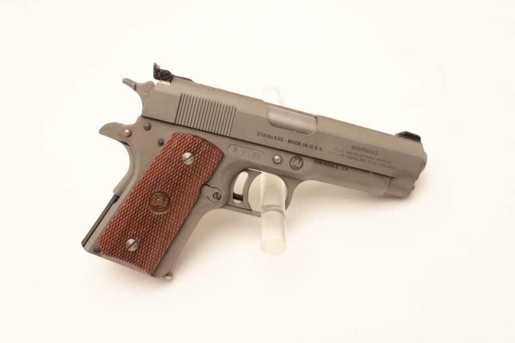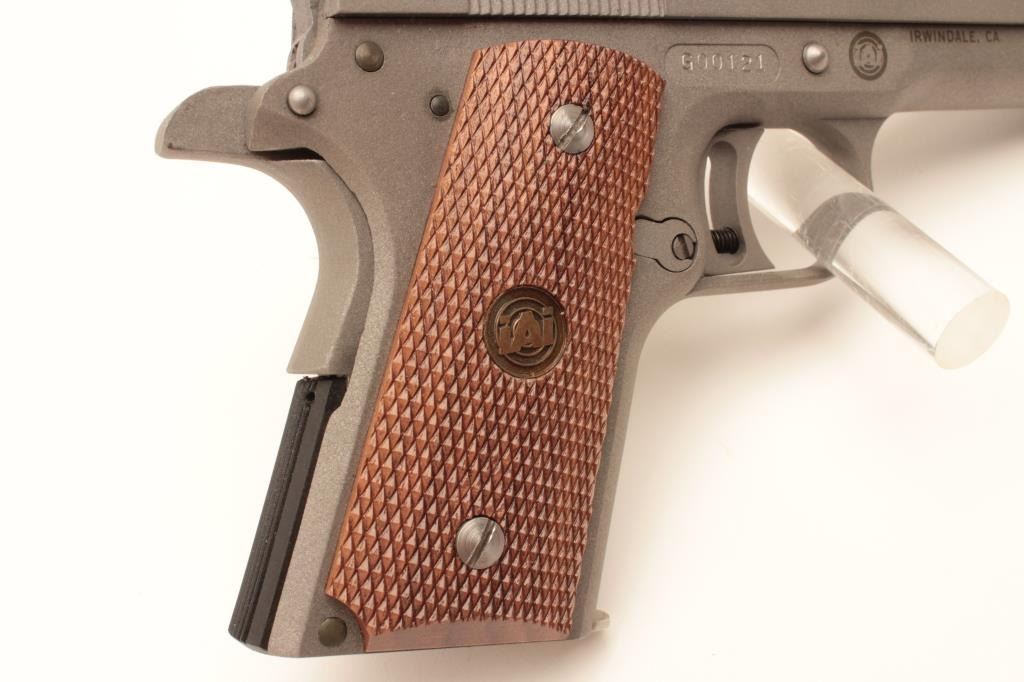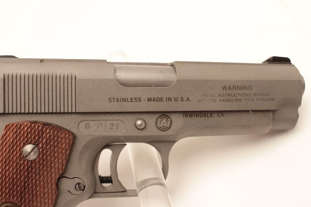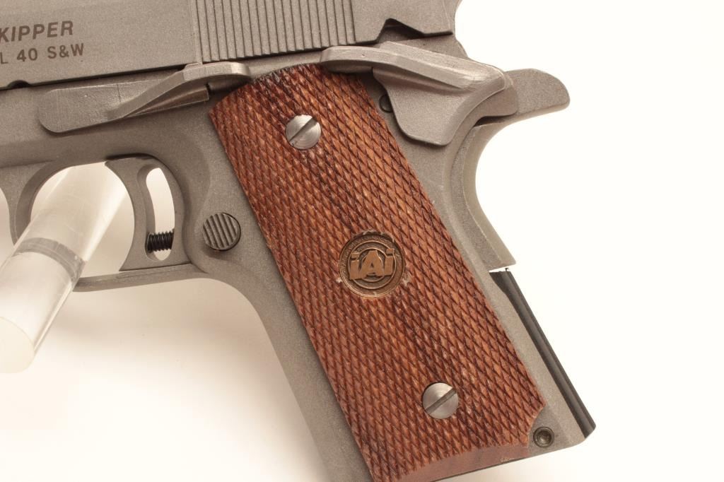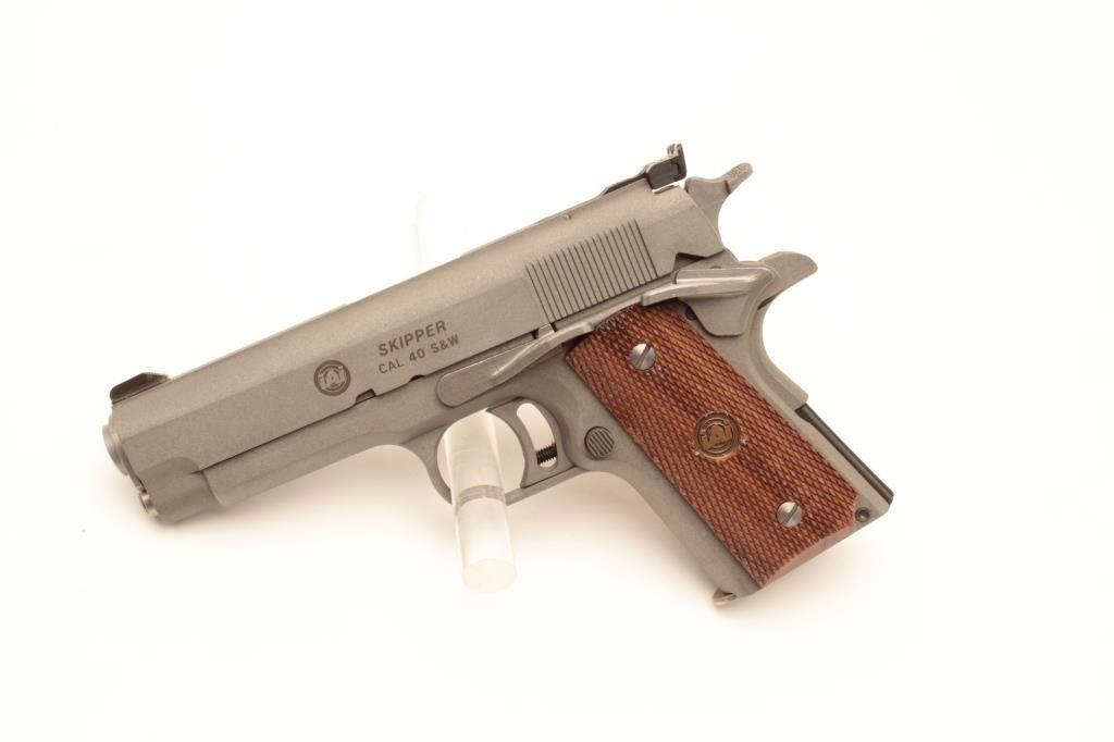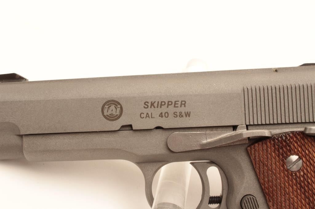 18BM-56 AMT SKIPPERIAI (Irwindale Arms Inc) Skipper .40 S&W cal., compact stainless semi auto pistol, #G00121, 4 1/4" barrel, 3 dot adjustable sights, checkered medallion grips. Pistol is in as new condition, excellent bore andaction. Includes one mag and original box in very good condition. Note: Consecutive serial number to next lot. (Modern / PPT) Est. $400-800IAI (Irwindale Arms Inc) Skipper .40 S&W cal., compact stainless semi auto pistol, #G00121, 4 1/4" barrel, 3 dot adjustable sights, checkered medallion grips. Pistol is in as new condition, excellent bore andaction. Includes one mag and original box in very good condition. Note: Consecutive serial number to next lot. (Modern / PPT) Est. $400-800