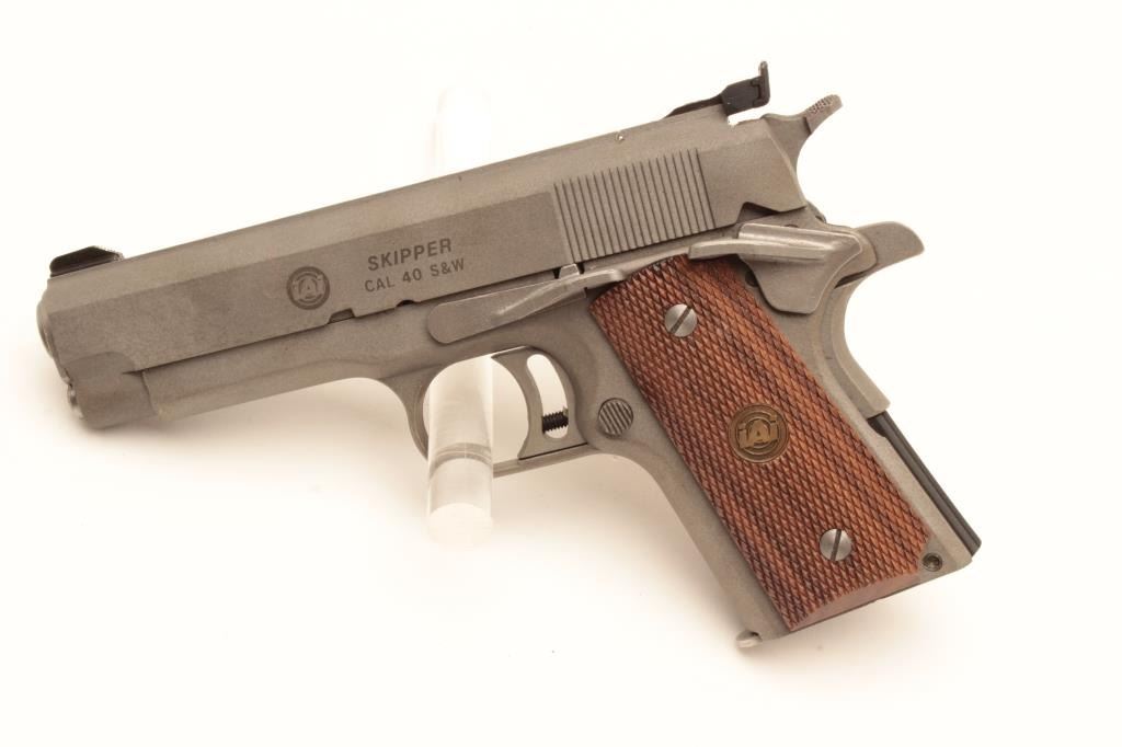 18BM-57 AMT SKIPPERIAI (Irwindale Arms Inc) Skipper .40 S&W cal., compact stainless semi auto pistol, #G00120, 4 1/4" barrel, 3 dot adjustable sights, checkered medallion grips. Pistol is in as new condition, excellent bore andaction. Includes one mag and original box in very good condition. Note: Consecutive serial number to next lot. (Modern / PPT) Est. $400-800IAI (Irwindale Arms Inc) Skipper .40 S&W cal., compact stainless semi auto pistol, #G00120, 4 1/4" barrel, 3 dot adjustable sights, checkered medallion grips. Pistol is in as new condition, excellent bore andaction. Includes one mag and original box in very good condition. Note: Consecutive serial number to next lot. (Modern / PPT) Est. $400-800