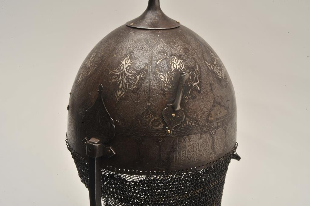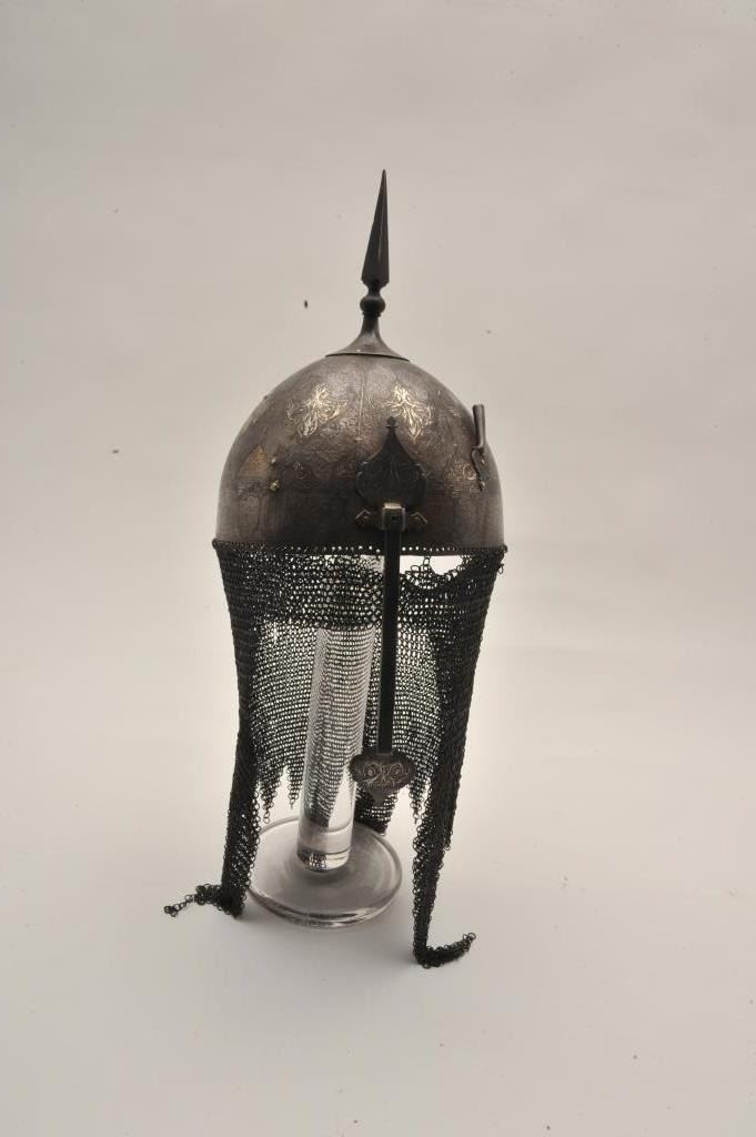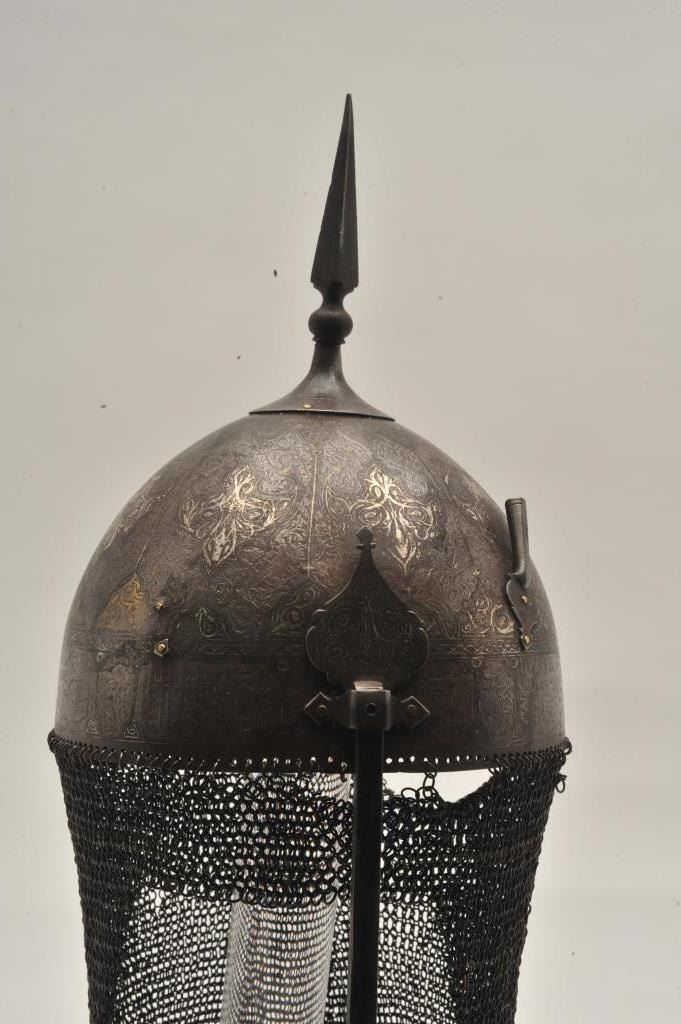 18BW-5 PERSIAN HELMETVery good 19th century Persian helmet, khula khud. etched with battle scenes and damascened in gold and silver with bands of Islamic calligraphy. Retains original spike decorated en suite. Has lovely cloth likemail with brass designs highlighting the steel links found only on the finer quality Persian helmets. Overall fine condition missing one plume holder. 1500-2500Very good 19th century Persian helmet, khula khud. etched with battle scenes and damascened in gold and silver with bands of Islamic calligraphy. Retains original spike decorated en suite. Has lovely cloth likemail with brass designs highlighting the steel links found only on the finer quality Persian helmets. Overall fine condition missing one plume holder. 1500-2500
