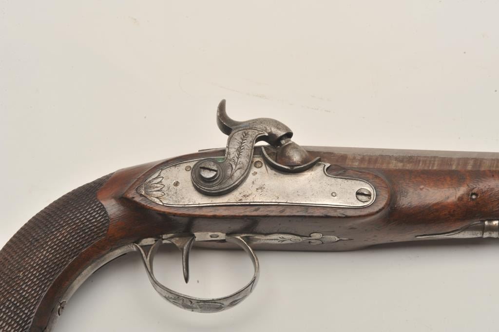 18BW-7 BELGIAN PERC. PISTOLFine Belgian percussion officer’s pistol with large 69 caliber bore. Swamped barrel retains nearly all beautiful striped brown. Has original ramrod and bright polished steel engraved mounts. Excellent checkered figured walnut half stock. 600-800Fine Belgian percussion officer’s pistol with large 69 caliber bore. Swamped barrel retains nearly all beautiful striped brown. Has original ramrod and bright polished steel engraved mounts. Excellent checkered figured walnut half stock. 600-800