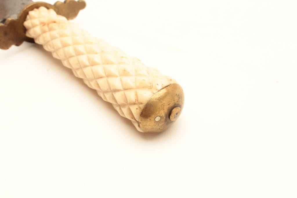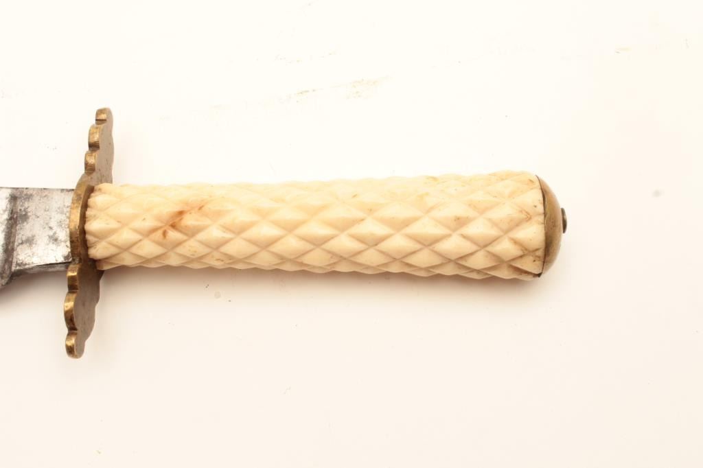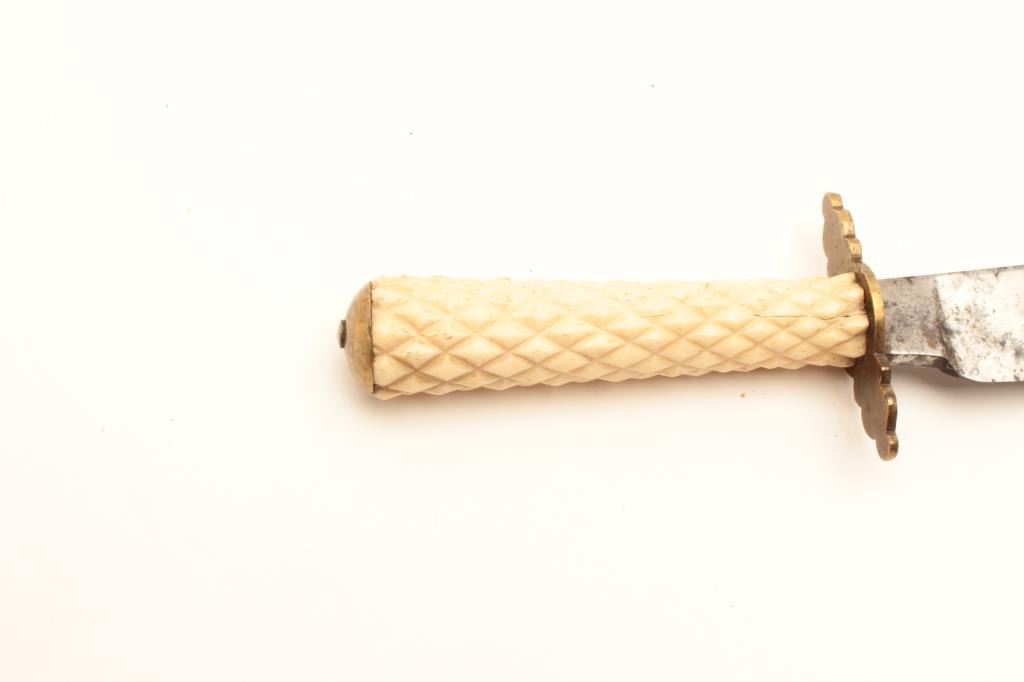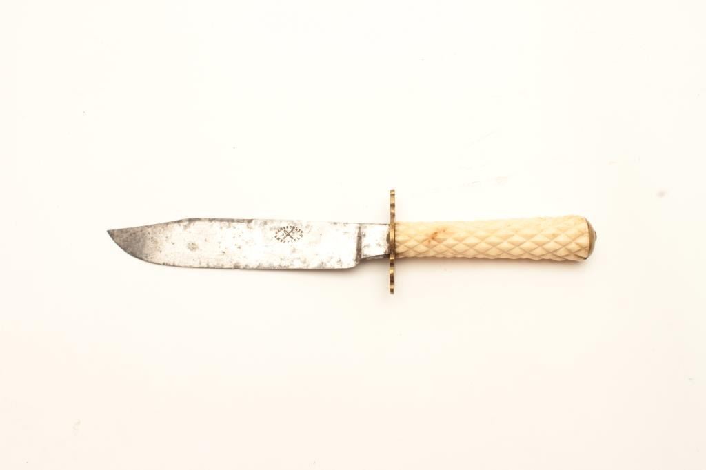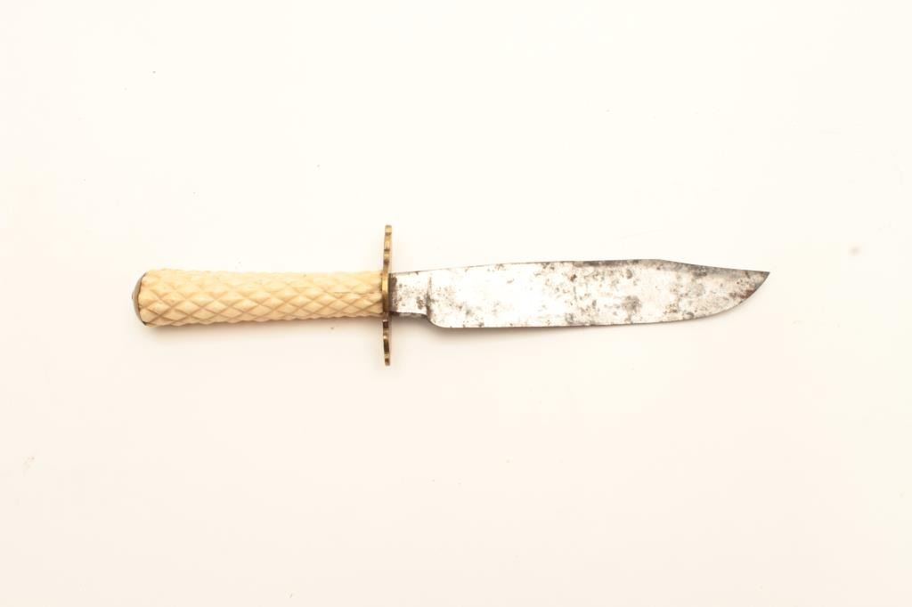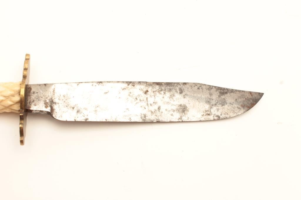 18CA-16 JAMES OXLEY SHEFFIELD BOWIEJames Oxley Sheffield clip point bowie with checkered bone grip and brass mounts. Measures 11” overall with a 6 ½” blade. Some staining and pitting but good overall. 1860-1880’s. Est.: $300-$600James Oxley Sheffield clip point bowie with checkered bone grip and brass mounts. Measures 11” overall with a 6 ½” blade. Some staining and pitting but good overall. 1860-1880’s. Est.: $300-$600