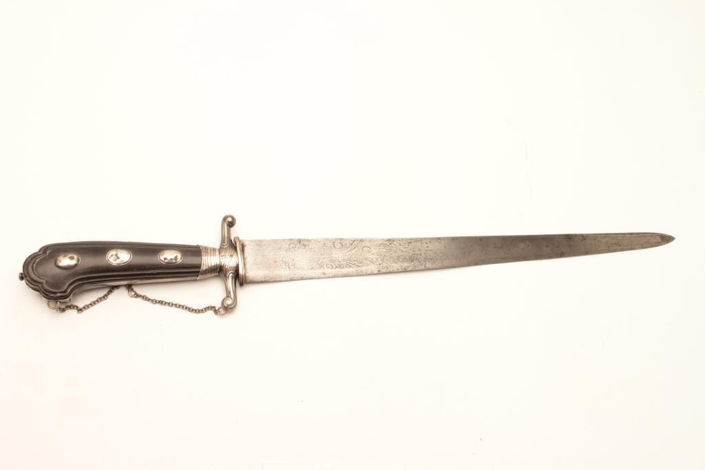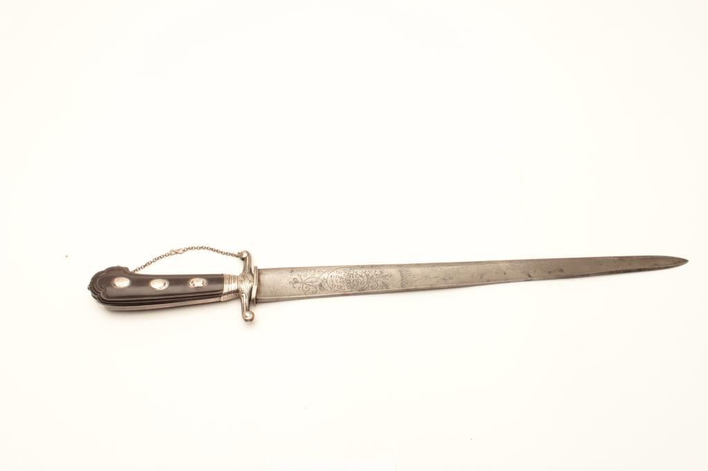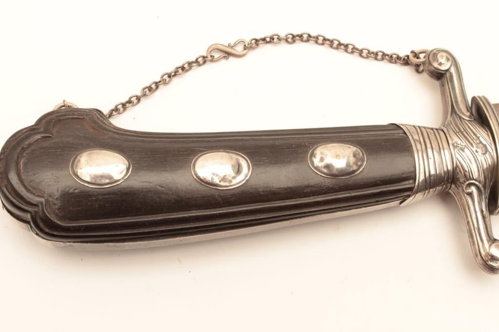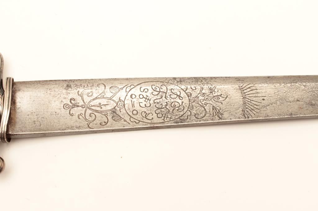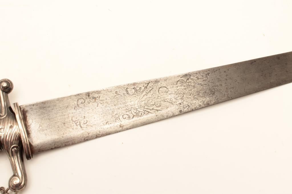 18CA-2 SILVER HANGER OR SHORT SWORD18th century silver hanger or short sword with ebony grip and silver mounts. Chain guard with engraved blade showing armoral scene and calligraphy style letters. Measures 23 ¼” overall with a 17” blade. Many carried by officer’s in revolution. Small French style hallmarks. The estate of Gary Harrison from Rancho Bernardo, CA. Good to very good condition. Est.: $700-$140018th century silver hanger or short sword with ebony grip and silver mounts. Chain guard with engraved blade showing armoral scene and calligraphy style letters. Measures 23 ¼” overall with a 17” blade. Many carried by officer’s in revolution. Small French style hallmarks. The estate of Gary Harrison from Rancho Bernardo, CA. Good to very good condition. Est.: $700-$1400