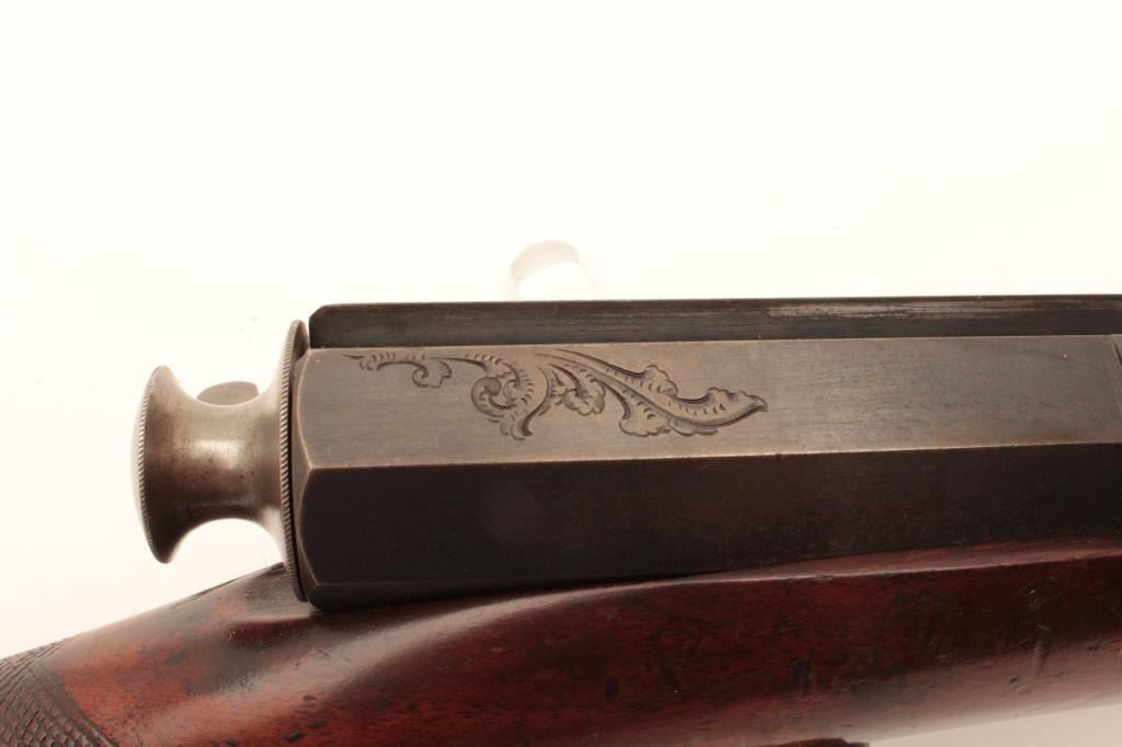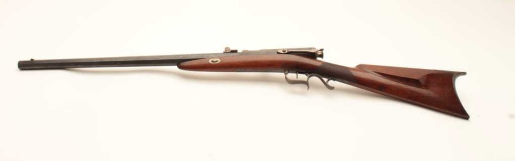 18CA-20 RARE & MINT SPORTING RIFLERare and near mint needle fire sporting rifle marked “G.P. Foster, Tavton, Mass.” And “Klein’s Patent, Nov. 1849, New York”. Numbered 200. The octagon barrel measures 22” of approximately .58 caliber. Ingenious bolt with hand operated cocking system at the left of the rear of the frame. 90%-95% original blue. Near excellent half stock. A lot of interesting features such as very early for American bolt action, needle fire,military caliber, and very sophisticated for cartridge arm in 1849 America. Springfield Armory has one in their collection and a few others are known in .40 caliber. Could this be a test piece due to large and uniquecaliber with rifled bore? Est.: $2500-$5000Rare and near mint needle fire sporting rifle marked “G.P. Foster, Tavton, Mass.” And “Klein’s Patent, Nov. 1849, New York”. Numbered 200. The octagon barrel measures 22” of approximately .58 caliber. Ingenious bolt with hand operated cocking system at the left of the rear of the frame. 90%-95% original blue. Near excellent half stock. A lot of interesting features such as very early for American bolt action, needle fire,military caliber, and very sophisticated for cartridge arm in 1849 America. Springfield Armory has one in their collection and a few others are known in .40 caliber. Could this be a test piece due to large and uniquecaliber with rifled bore? Est.: $2500-$5000