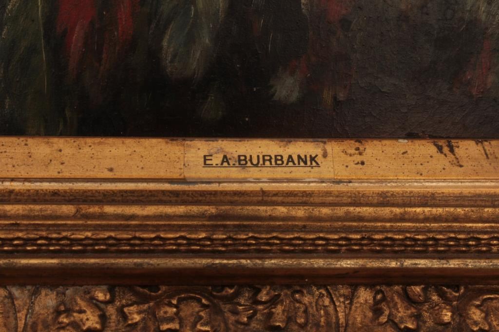 18CA-24 OIL PAINTINGExcellent oil painting on board of California Native Indian attributed to E.A. Burbank. Measures approximately 12” x 9” in excellent period frame with name E.A. Burbank stenciled on the front and identified in pencil on the rear but work is not signed. Probably a pomo tribal chief or elder and very well detailed and similar to Grace Carpenter Hudson in style and subject matter. Good condition with need of minor cleaning and slightconservation. Turn of the century era. Est.: $1000-$2000Excellent oil painting on board of California Native Indian attributed to E.A. Burbank. Measures approximately 12” x 9” in excellent period frame with name E.A. Burbank stenciled on the front and identified in pencil on the rear but work is not signed. Probably a pomo tribal chief or elder and very well detailed and similar to Grace Carpenter Hudson in style and subject matter. Good condition with need of minor cleaning and slightconservation. Turn of the century era. Est.: $1000-$2000