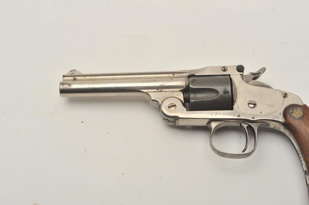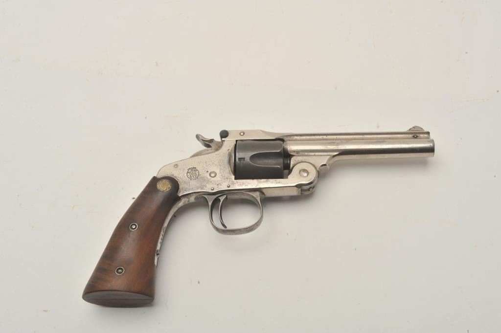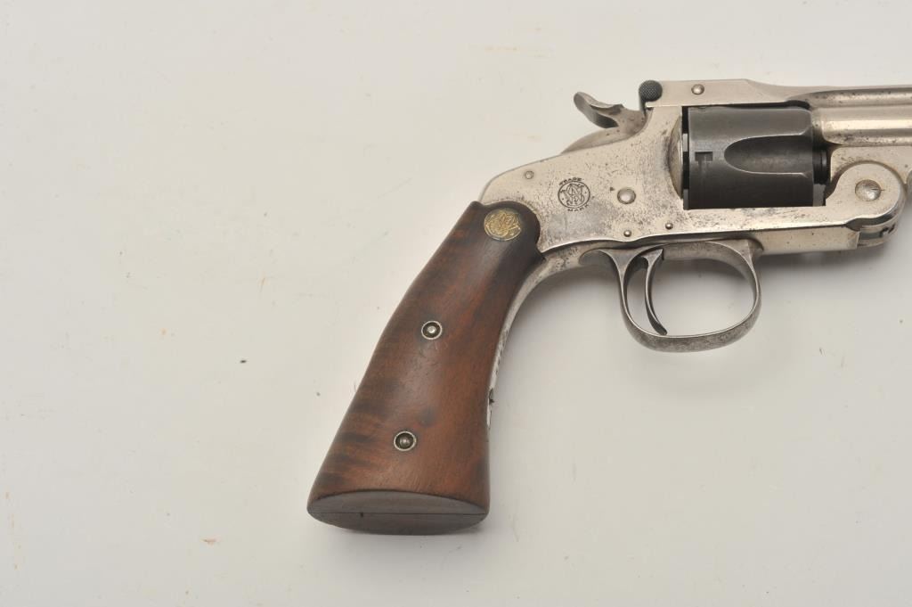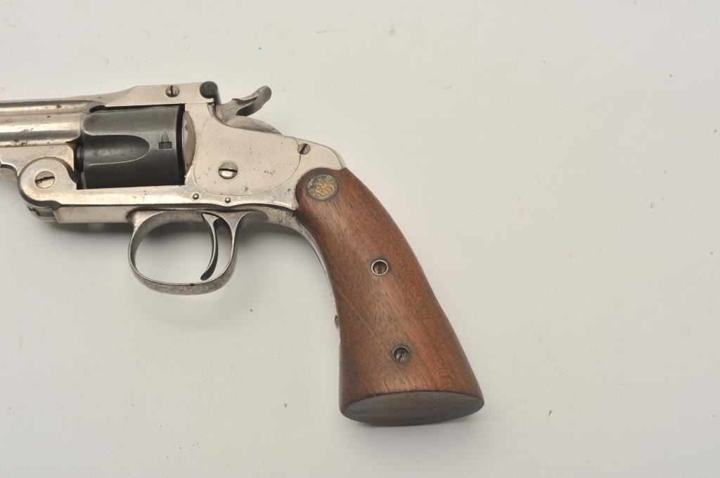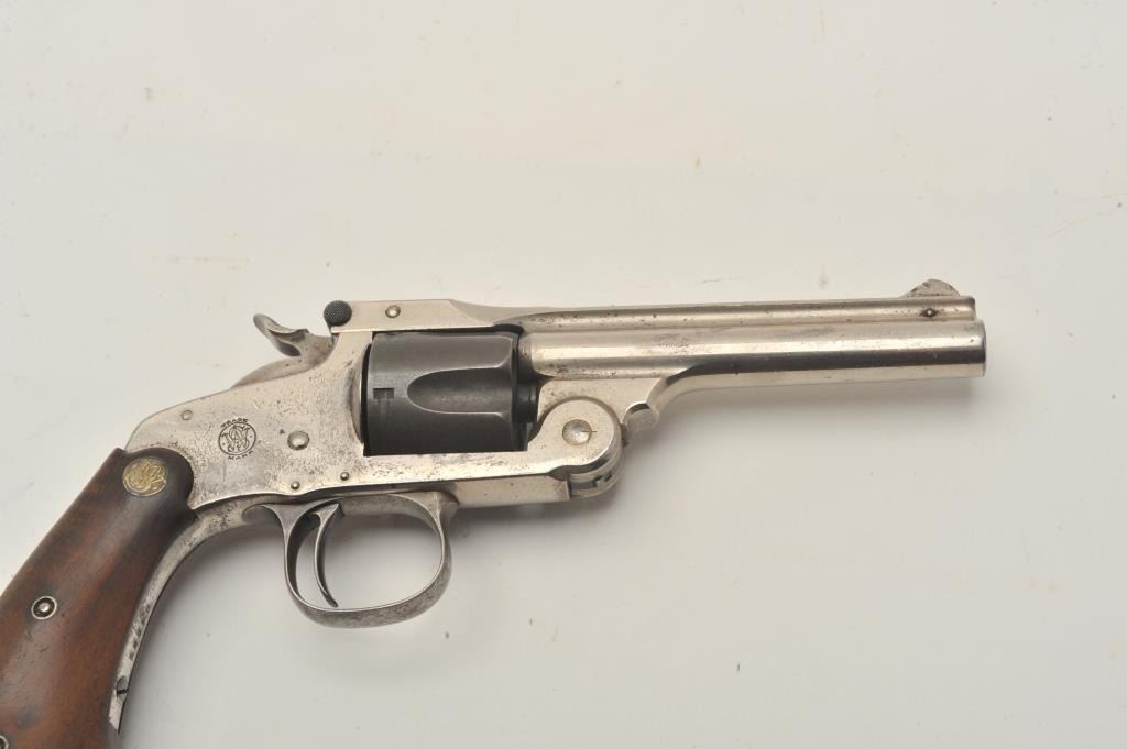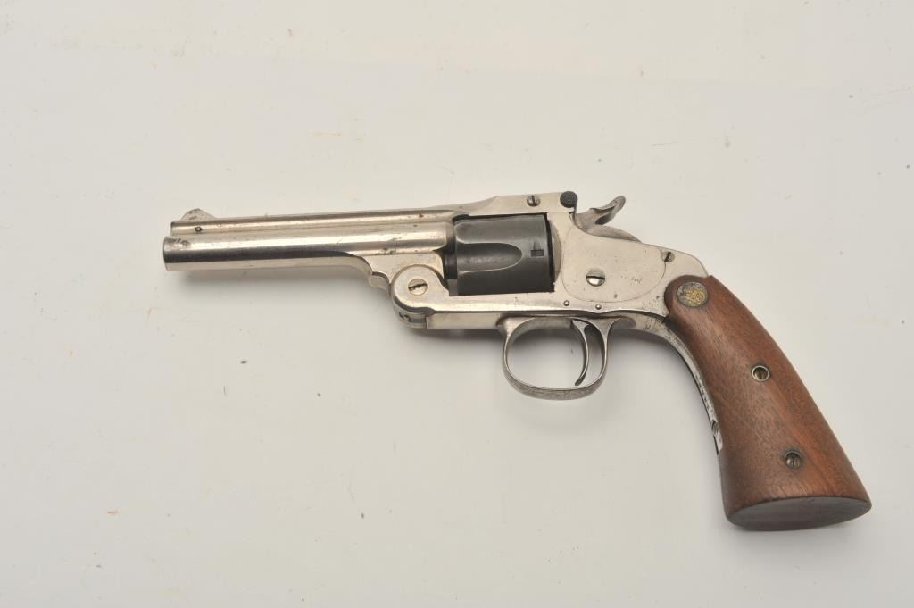 18CA-312 S& W MDL 1891 S.A. REVSmith & Wesson Model 1891 single action revolver with removable trigger guard and medallion wood 2 screw target grips, S/N 15328. .32 S&W caliber with a 4” barrel. 50%-60% original nickel with mismatched andlater cylinder. Good action and the bore is fair. Also known as Mexican model. Est.: $250-$500Smith & Wesson Model 1891 single action revolver with removable trigger guard and medallion wood 2 screw target grips, S/N 15328. .32 S&W caliber with a 4” barrel. 50%-60% original nickel with mismatched andlater cylinder. Good action and the bore is fair. Also known as Mexican model. Est.: $250-$500