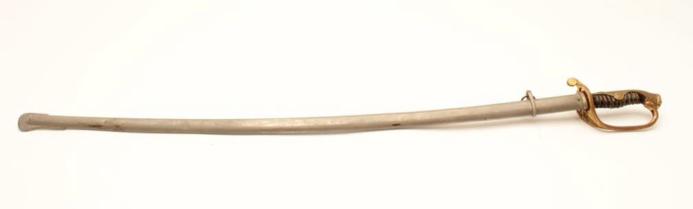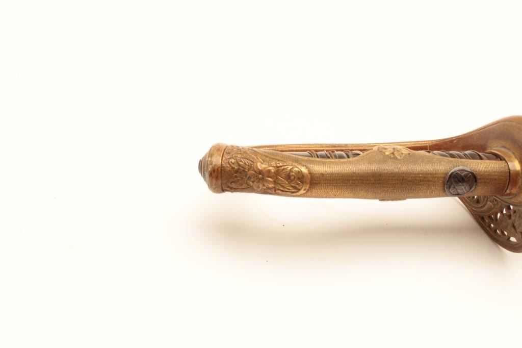 18CA-335 JAPANESE D GUARD OFF. SWORDJapanese D guard officer’s sword with a 33” blade and 38” overall. Original scabbard retained and oil wavy temper line simulated with oil on the blade. Silver mons or crests on the top of the grip showing two leafs.Slightly loose wire wrap otherwise very good. Est.: $150-$300Japanese D guard officer’s sword with a 33” blade and 38” overall. Original scabbard retained and oil wavy temper line simulated with oil on the blade. Silver mons or crests on the top of the grip showing two leafs.Slightly loose wire wrap otherwise very good. Est.: $150-$300