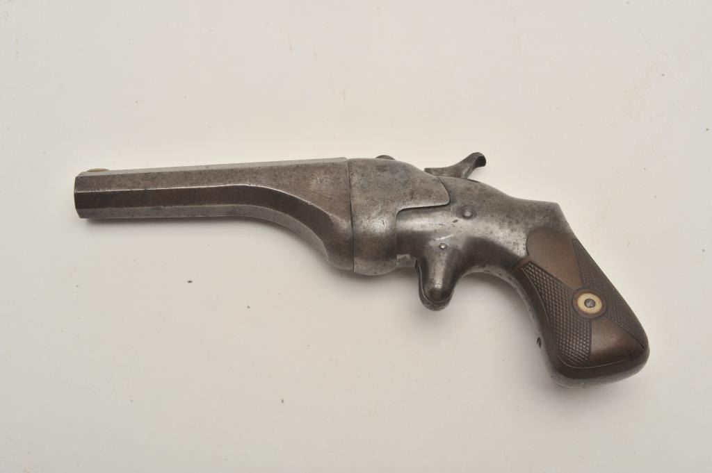 18CA-342 HAMMOND "BULL DOG"Hammond “Bull Dog” .44 Henry rim fire single shot pistol from frontier era. Manufactured by Connecticut Arms Co. patented in 1864. The barrel measures 4” with traces of blue and case visible in light brown to gray patinafinish. Good grips and good markings. Works well and good overall. A large bore frontier belt or hide out pistol that packed a wallop and it is legend that “Big Nose Kate” was shot with on in Deadwood. (Antique) Est.:$350-$700Hammond “Bull Dog” .44 Henry rim fire single shot pistol from frontier era. Manufactured by Connecticut Arms Co. patented in 1864. The barrel measures 4” with traces of blue and case visible in light brown to gray patinafinish. Good grips and good markings. Works well and good overall. A large bore frontier belt or hide out pistol that packed a wallop and it is legend that “Big Nose Kate” was shot with on in Deadwood. (Antique) Est.:$350-$700