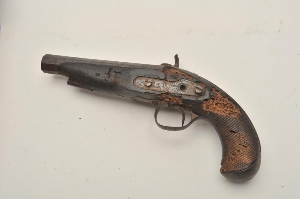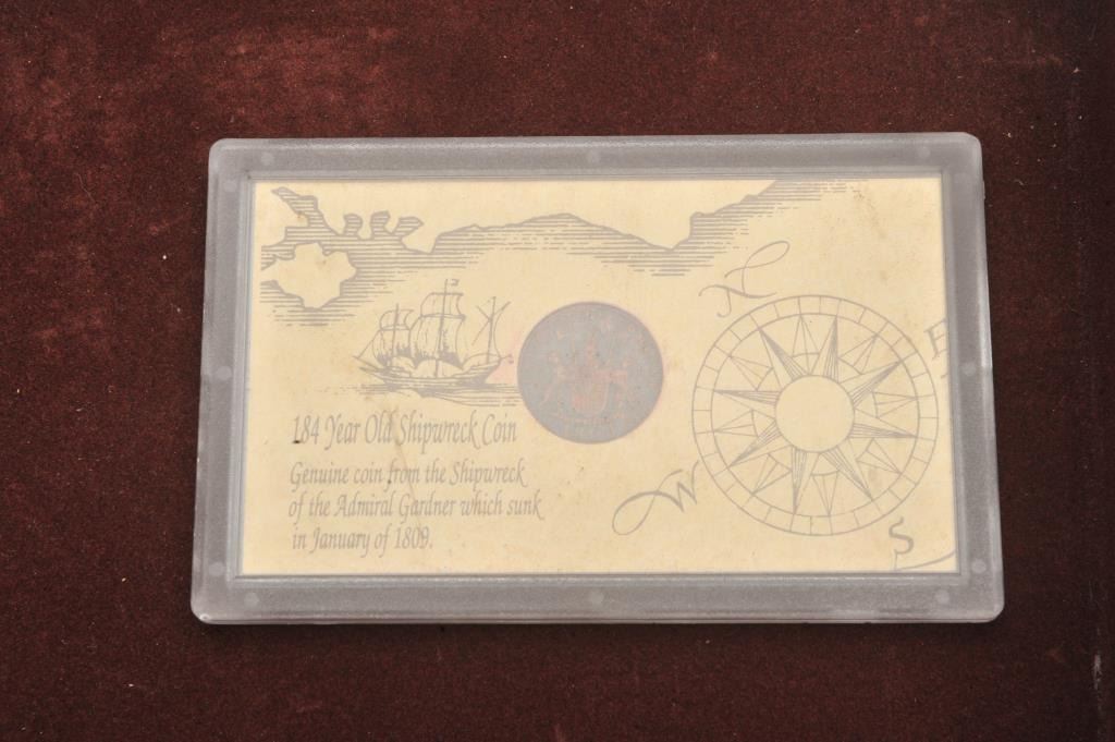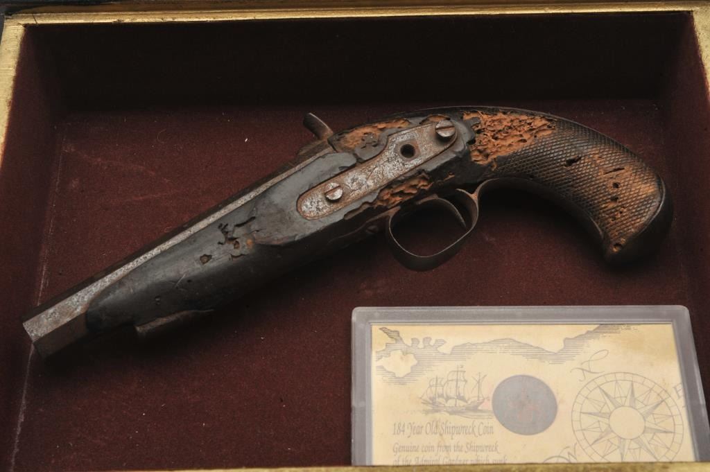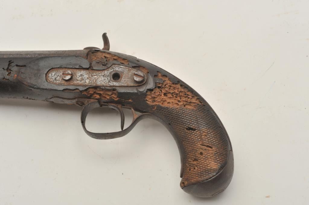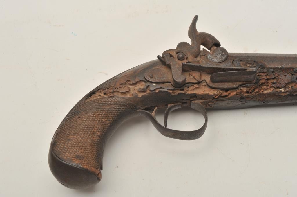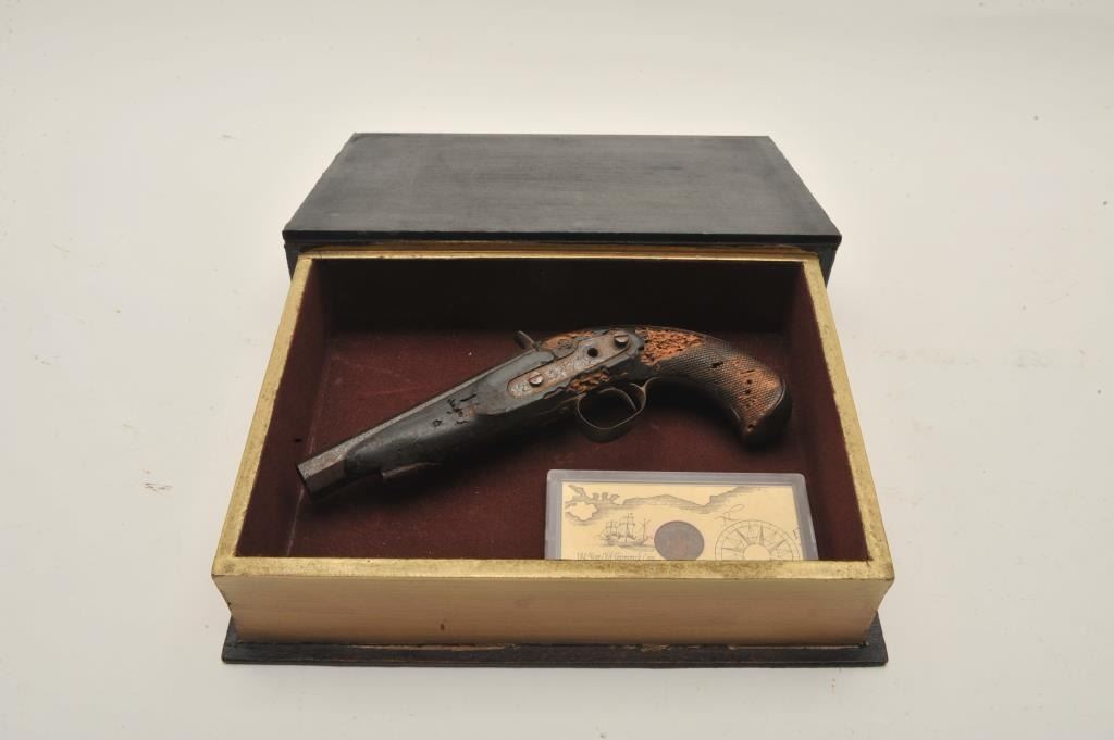 18CA-345 RELIC COND. SPANISH MIQUELETRelic condition Spanish miquelet percussion pistol showing silver inlaid barrel and chiseled lion head hammer. In book display case (Treasure Island) with 184 year old copper shipwreck coin off admiral Gardnersunk 1809. Est.: $250-$500Relic condition Spanish miquelet percussion pistol showing silver inlaid barrel and chiseled lion head hammer. In book display case (Treasure Island) with 184 year old copper shipwreck coin off admiral Gardnersunk 1809. Est.: $250-$500