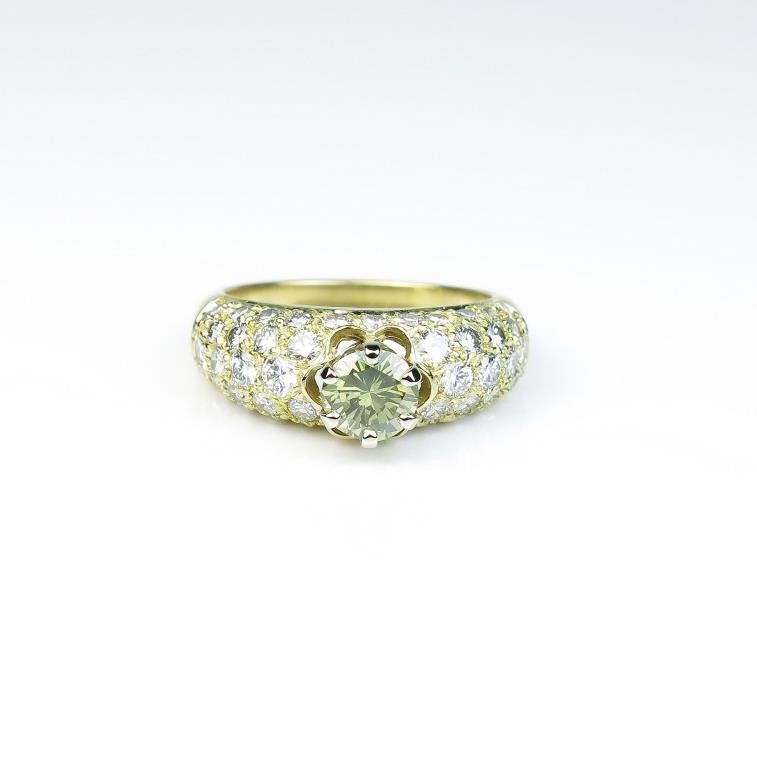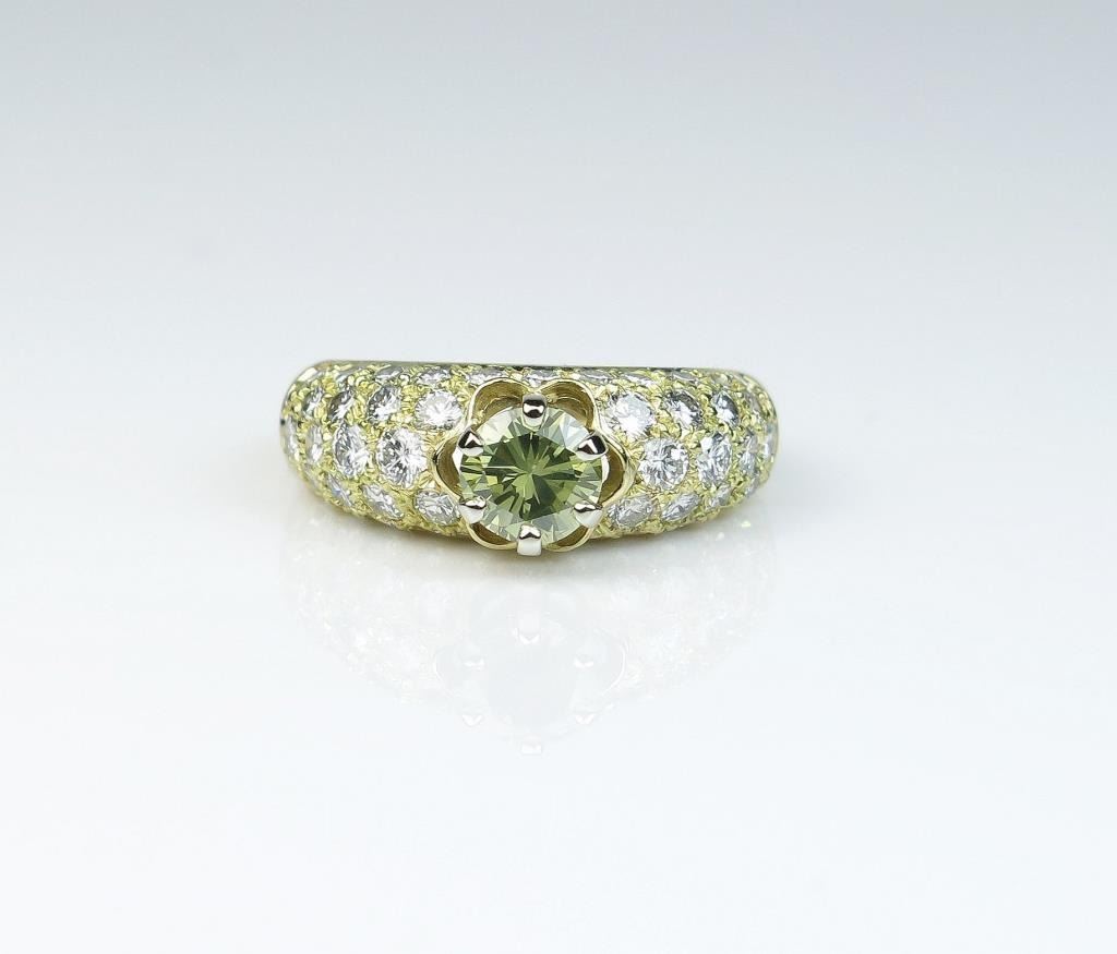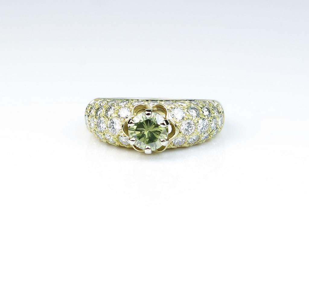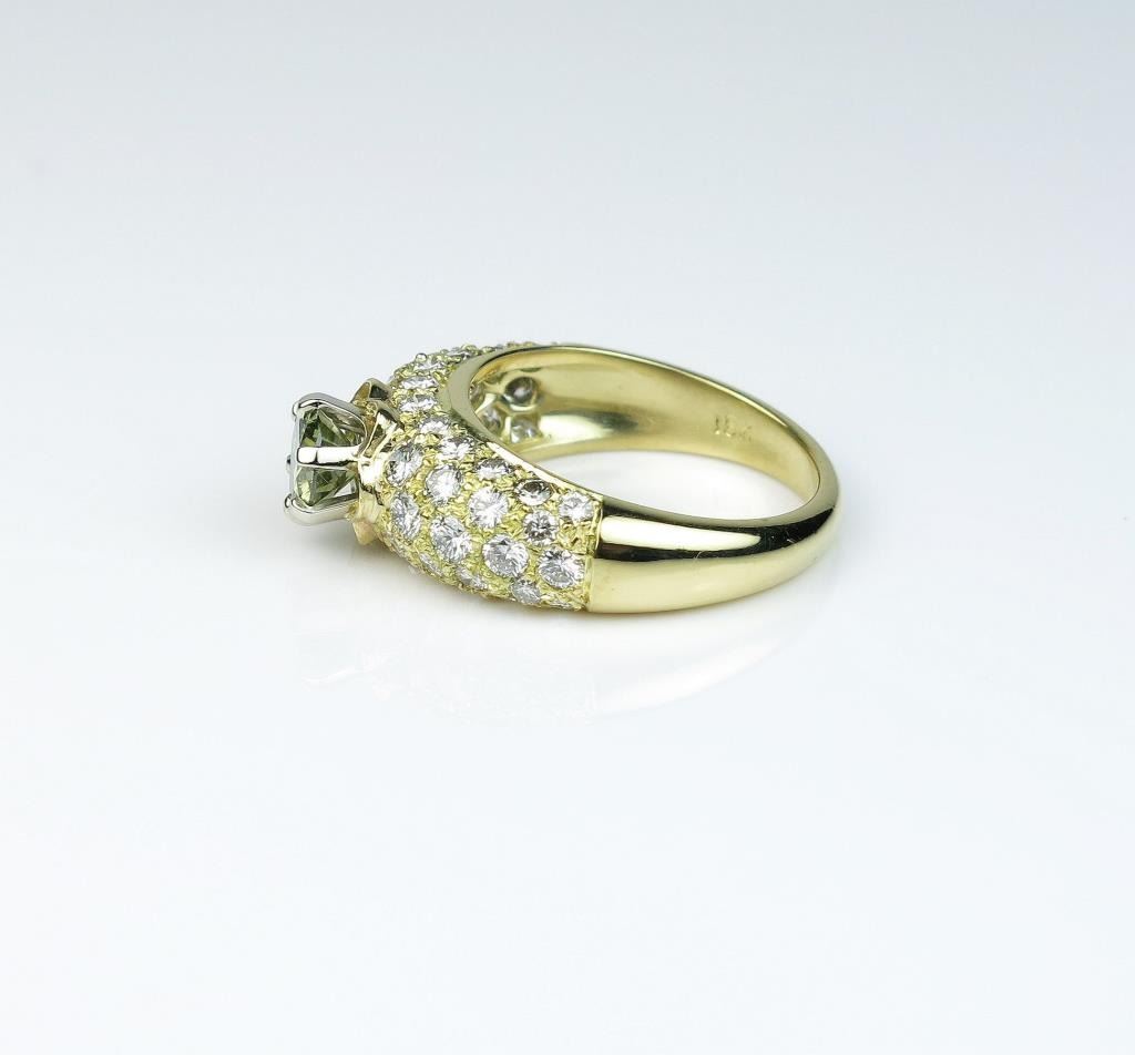 18CAI-45 YELLOW DIAMOND RINGDazzling ring featuring a round Fancy Yellow Diamond weighing 0.70 carats and pave set with 46 ‘IDEAL’ cut Diamonds weighing approx. 1.70 carats of F-G colors and VS clarity set in an 18 karat yellow gold custom madesetting. Estimates $2,000-$4,000Dazzling ring featuring a round Fancy Yellow Diamond weighing 0.70 carats and pave set with 46 ‘IDEAL’ cut Diamonds weighing approx. 1.70 carats of F-G colors and VS clarity set in an 18 karat yellow gold custom madesetting. Estimates $2,000-$4,000