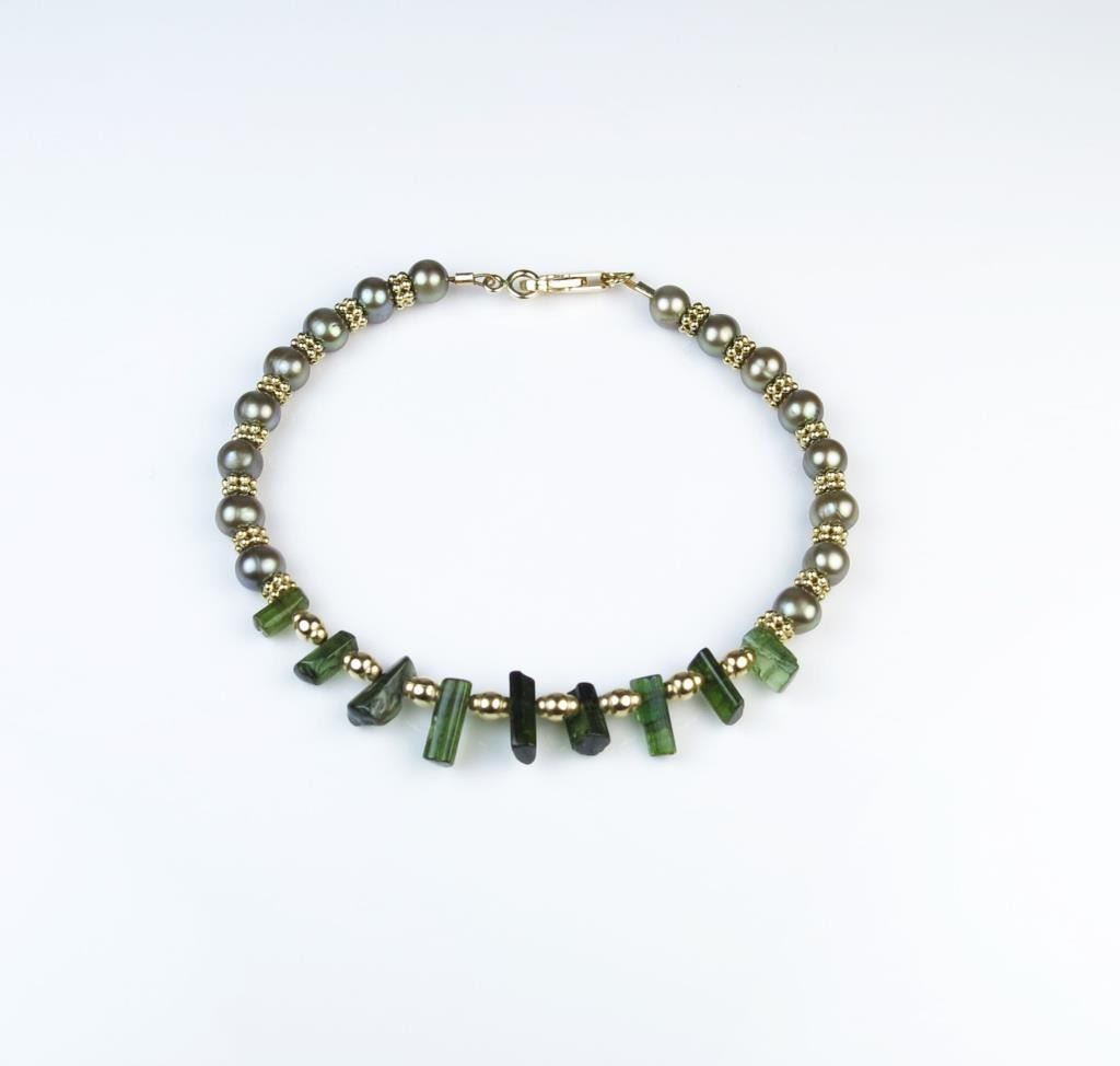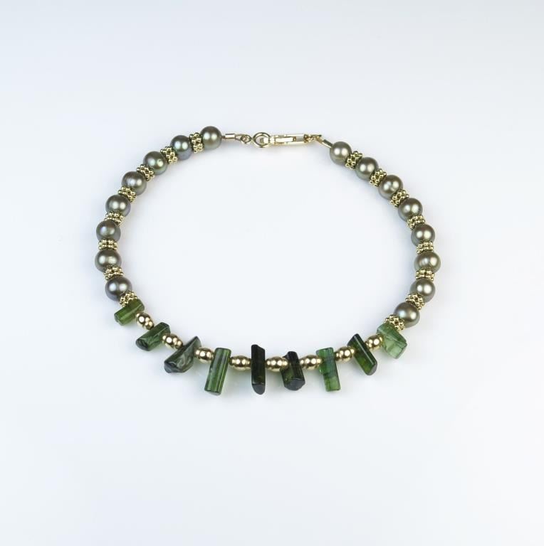 18CAI-48 TOURMALINE & PEARL BRACELETNice bracelet featuring natural Tourmalines and pearls on 14 karat yellow gold overlay. Estimates $200-$400 NiceNice bracelet featuring natural Tourmalines and pearls on 14 karat yellow gold overlay. Estimates $200-$400 Nice