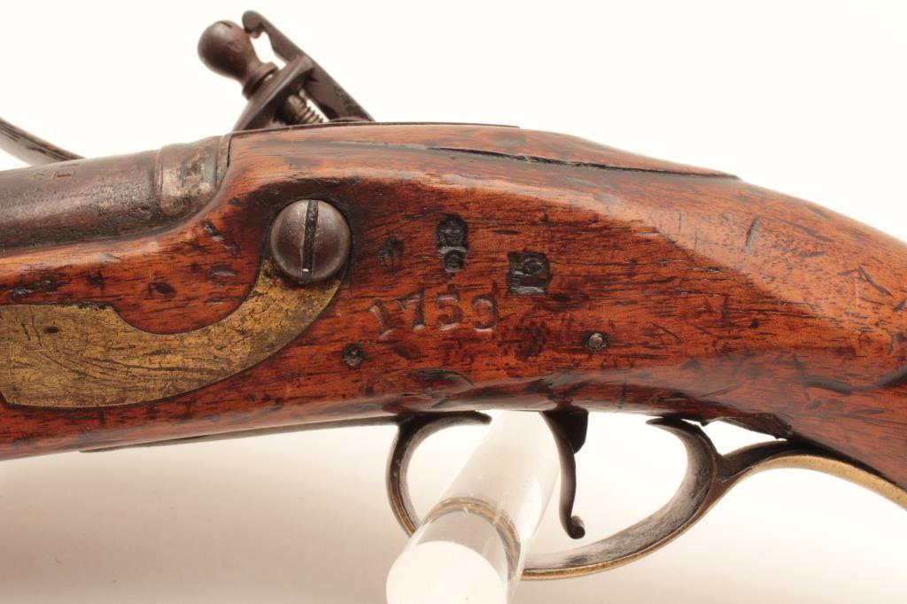 18CB-4 BRITISH ISSUE PISTOLBritish Military issue pistol in .69 caliber with Tower lock markings and full inspections dated 1759 in the stock and inscribed in script “Rodger’s Rangers” on the forwards portion of the barrel. Brown patina finish in very good plus condition with some cracks in the stock by the rear near the butt cap. Uncleaned patina. Two books on Rodgers Rangers included with long inscription in pen by Charles DuPont concerning this pistolwhen in his iconic collection which started before WWII. All original flintlock parts and uncleaned dark “As found patina”. Measures 15 ½” overall with a 9 ¼” barrel. (Antique) Est.: $5,000-$10,000British Military issue pistol in .69 caliber with Tower lock markings and full inspections dated 1759 in the stock and inscribed in script “Rodger’s Rangers” on the forwards portion of the barrel. Brown patina finish in very good plus condition with some cracks in the stock by the rear near the butt cap. Uncleaned patina. Two books on Rodgers Rangers included with long inscription in pen by Charles DuPont concerning this pistolwhen in his iconic collection which started before WWII. All original flintlock parts and uncleaned dark “As found patina”. Measures 15 ½” overall with a 9 ¼” barrel. (Antique) Est.: $5,000-$10,000
