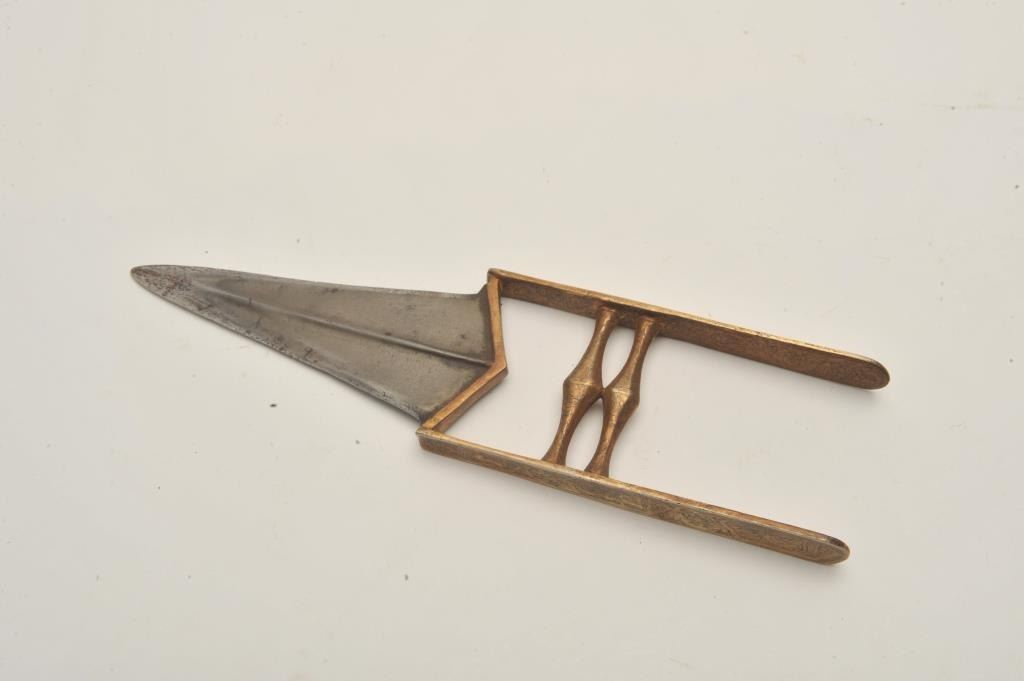 18CF-15 GOLD KATARIndian Katar with gilt over silver fancy grip and forged iron piercing blade. Measures 12” overall with a 6 ½” blade. Pattern in steel with cleaning and sharpening. Lightly engraved with letterings which may be aprayer or slogan. 19th century. Est.: $750-$1500Indian Katar with gilt over silver fancy grip and forged iron piercing blade. Measures 12” overall with a 6 ½” blade. Pattern in steel with cleaning and sharpening. Lightly engraved with letterings which may be aprayer or slogan. 19th century. Est.: $750-$1500