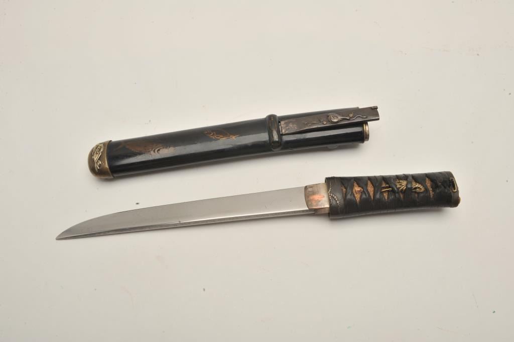 18CF-17 TANTOFully and finely mounted Japanese tanto with old family blade. 19th century soft metal mountings with matching scenes of fish, lobster, and scenes of the sea. Beautiful lacquered scabbard with fish. Mounts andscabbard are good to very good. The blade is late Koto to early Shinto and a little tired with light cleaning and no visible temper. Est.: $2000-$4000Fully and finely mounted Japanese tanto with old family blade. 19th century soft metal mountings with matching scenes of fish, lobster, and scenes of the sea. Beautiful lacquered scabbard with fish. Mounts andscabbard are good to very good. The blade is late Koto to early Shinto and a little tired with light cleaning and no visible temper. Est.: $2000-$4000