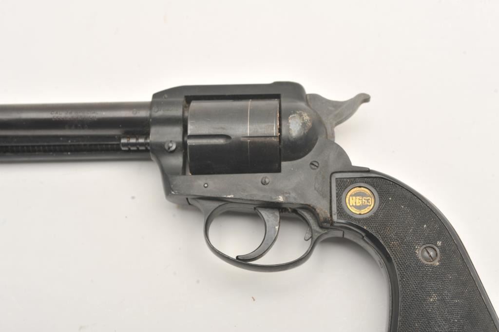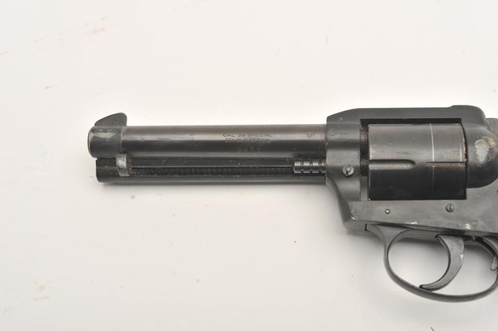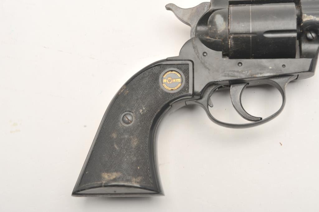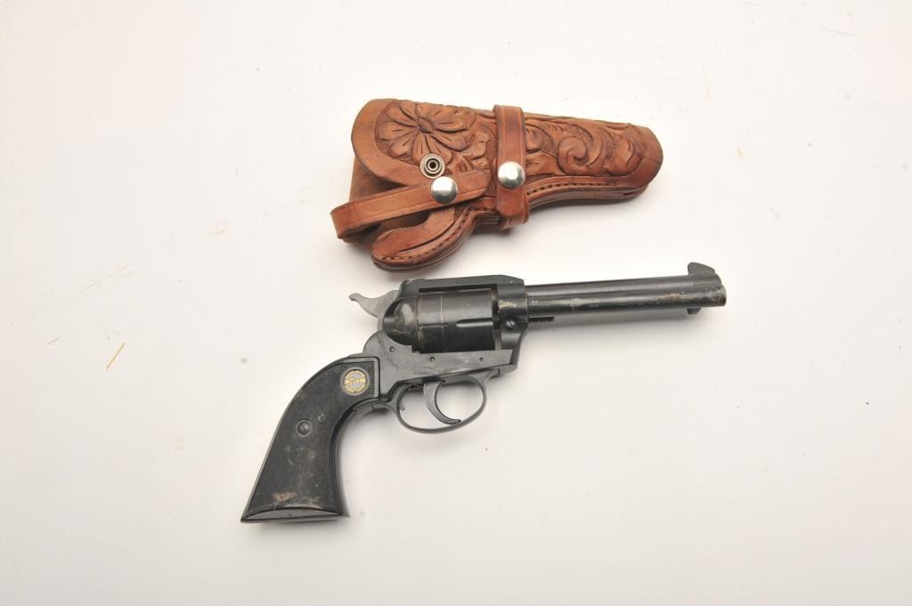 Rohm RG63 #8409, .38 Spl cal., 5" barrel, blued finish, checkered plastic logo grips. Revolver is in good condition overall, good bore, good grips, good action. Includes leather floral tooled holster. (Modern/PPT) Est. $75-150
