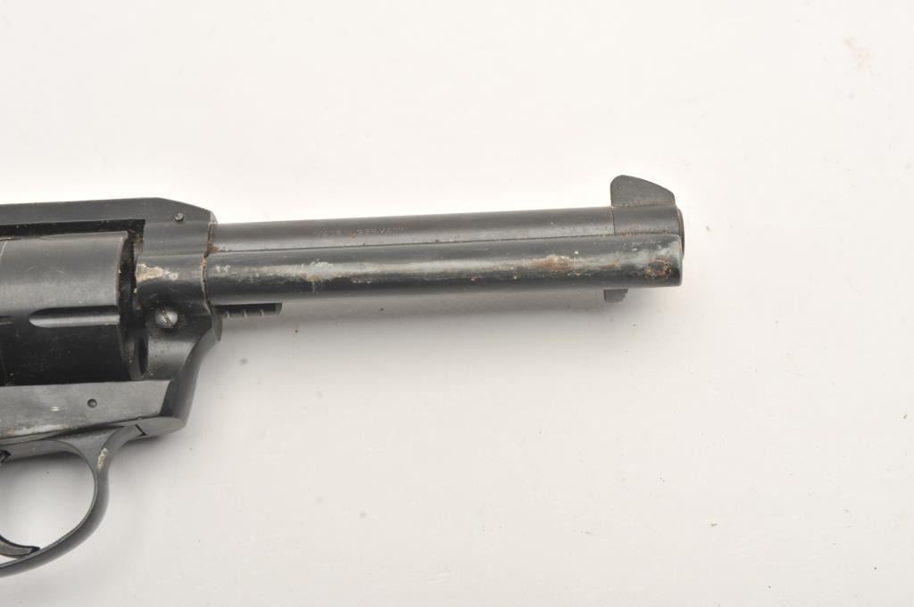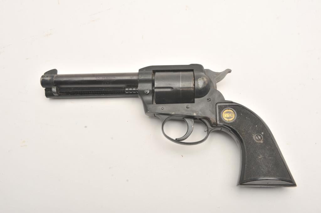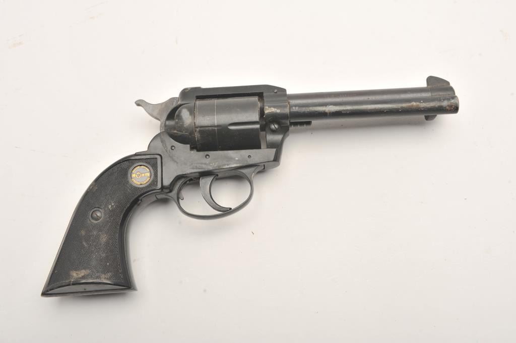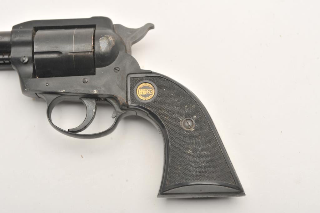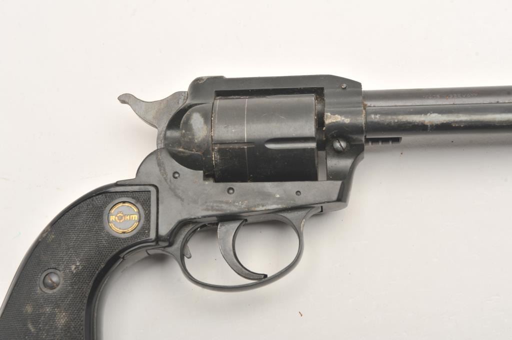 Rohm RG63 #8409, .38 Spl cal., 5" barrel, blued finish, checkered plastic logo grips. Revolver is in good condition overall, good bore, good grips, good action. Includes leather floral tooled holster. (Modern/PPT) Est. $75-150