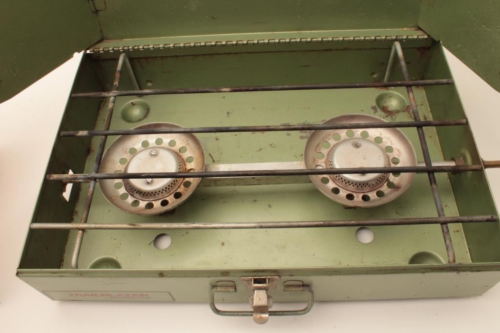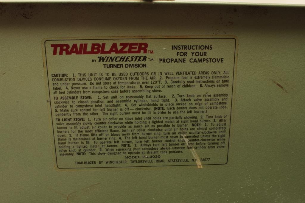 Winchester Trailblazer camping stove and empty wood Winchester box for 12 gauge shotgun shells. Est.: $40-$80.
