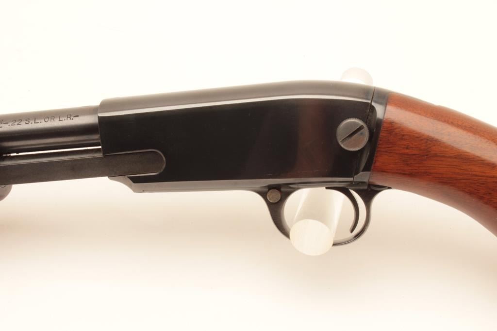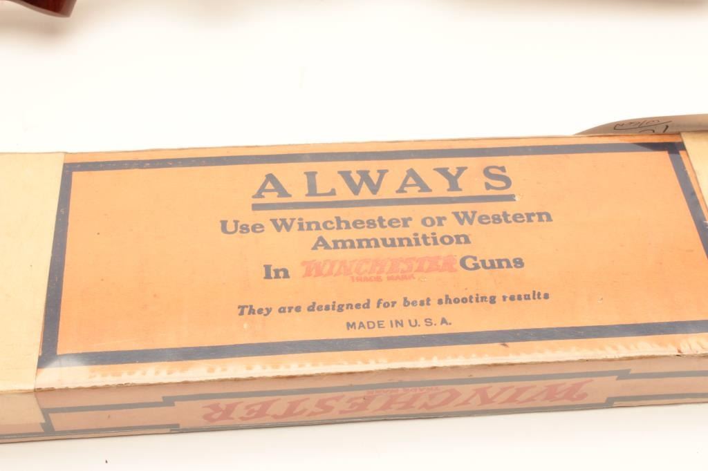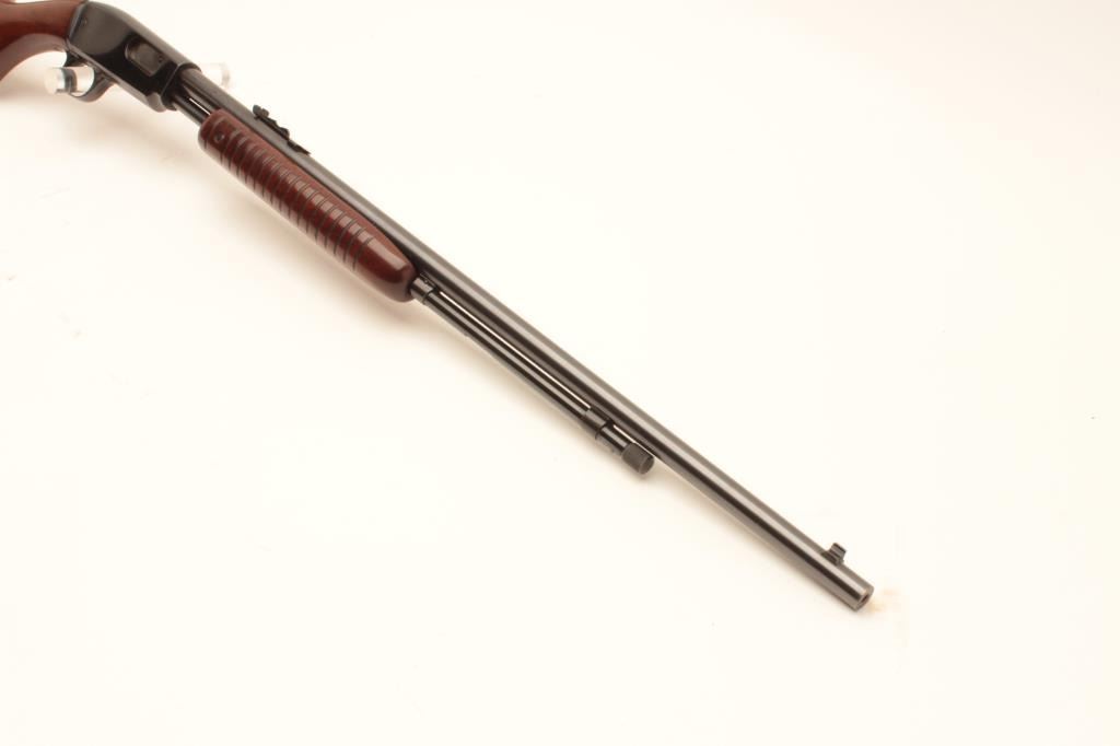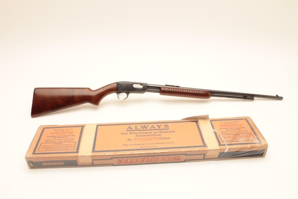 Winchester Model 61 pump action rifle, .22 short, long or LR caliber, 24” round barrel, blued finish, wood stocks, S/N 47114, with factory cardboard box, in overall like new condition showing little handling; no groove Lot Title early receiver; box is near fine condition with end label numbered to this gun. (C&R). Est.: $800-$1,600.